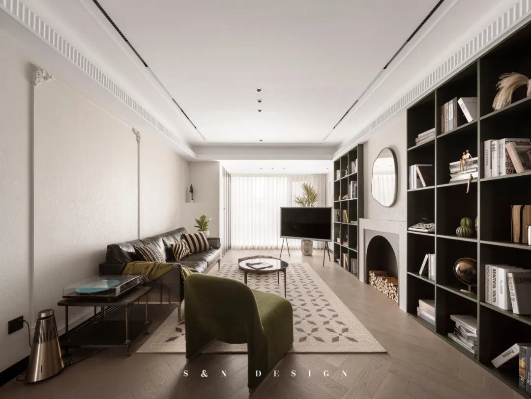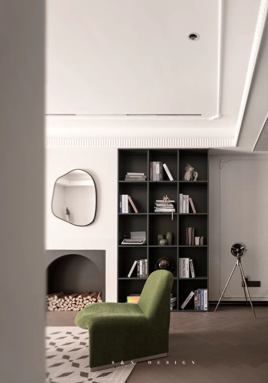 客厅没有做传统的电视背景,设计了一整面书柜和壁炉造型,电视机落地随意摆放在一侧。