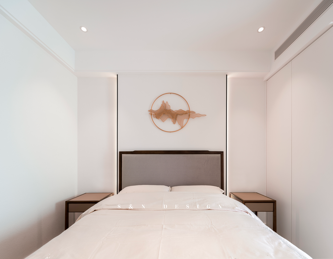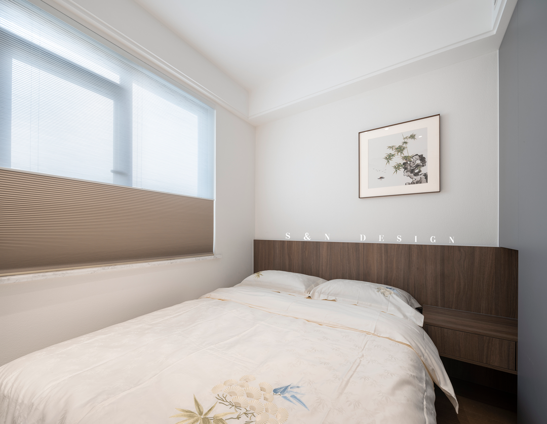 日夜帘下,朝暮更佚。素雅挂画、刺绣床品、纹理木饰,多重中式元素辅以温润设色,不经意间刻画出古雅舒畅的东方美学之所。
