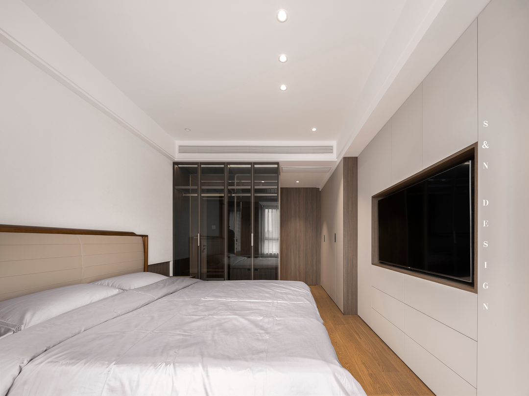 主卧以实用为主,增加许多储物空间,同时保留进门过道的通透做了玻璃柜,内卫做了胡桃木隐形门。