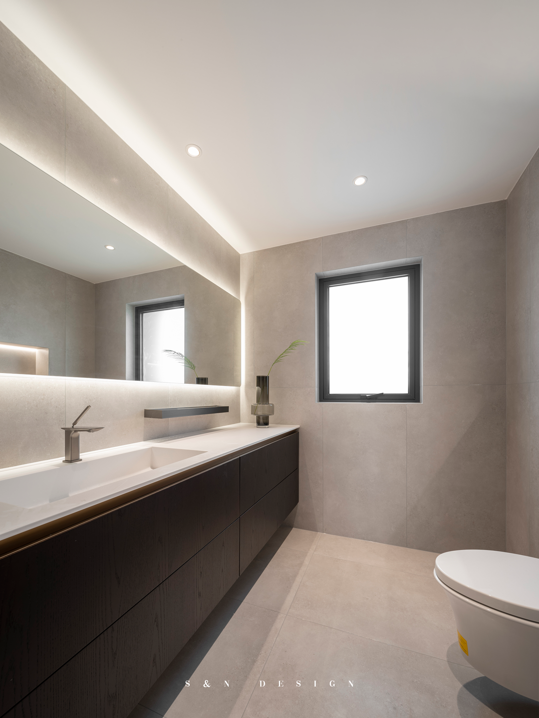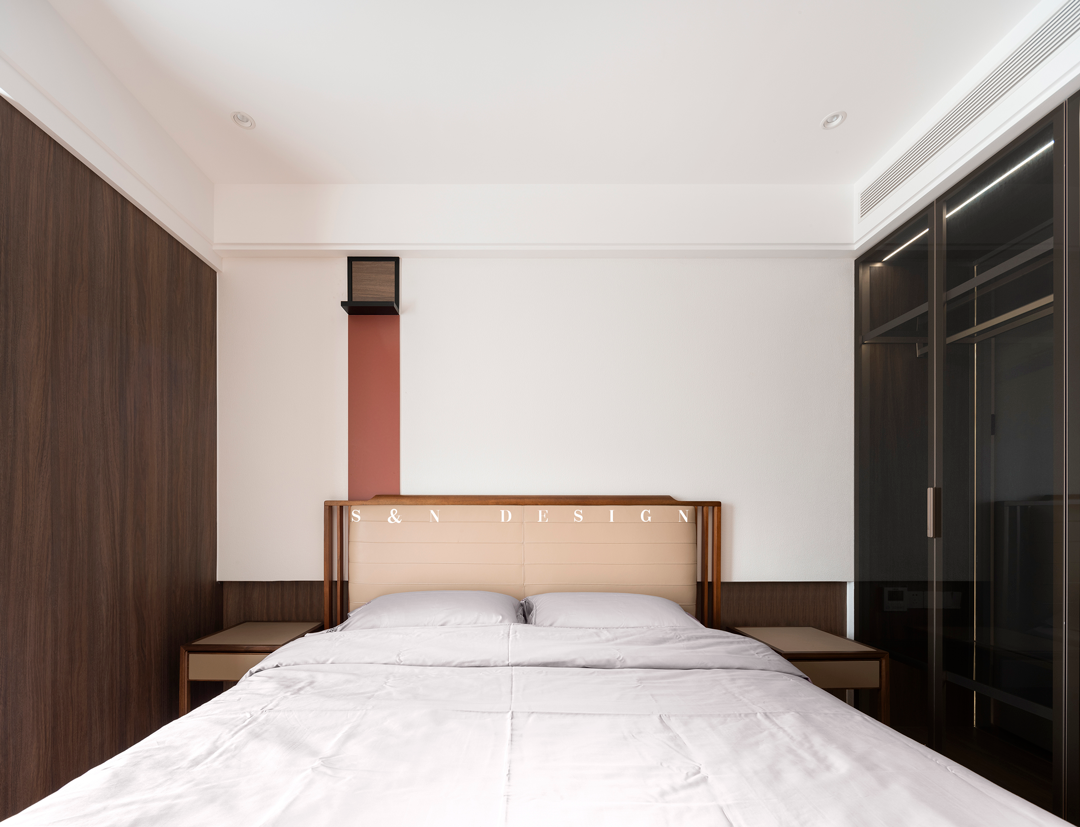 简朴纯粹之风蔓延至主卧室,纯粹造境中别有颜色深意,东方红意,骤然唤醒生命热忱。一侧温润雅木,一侧科技黑玻,探索新与旧的通融韵意,感悟兼容并纳,闲阔通达的素常生活。