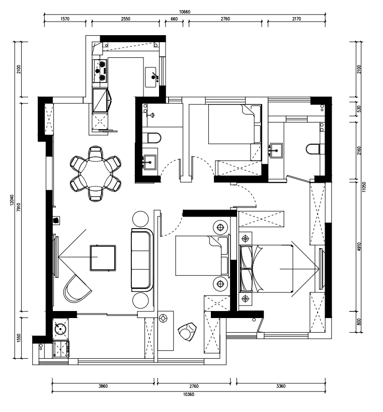 空间布局:次卧跟双阳台的一半打通,使其女儿房更大。