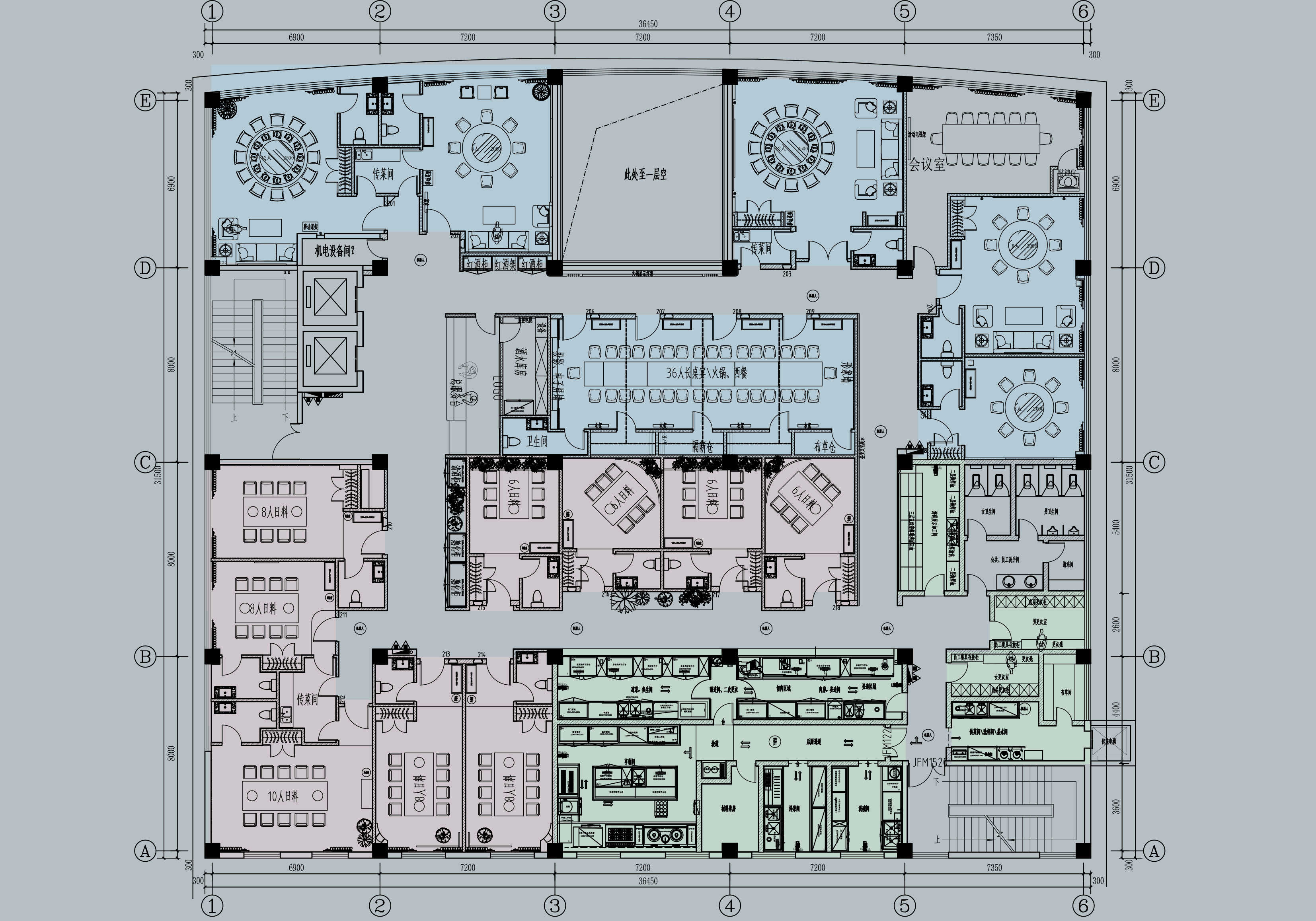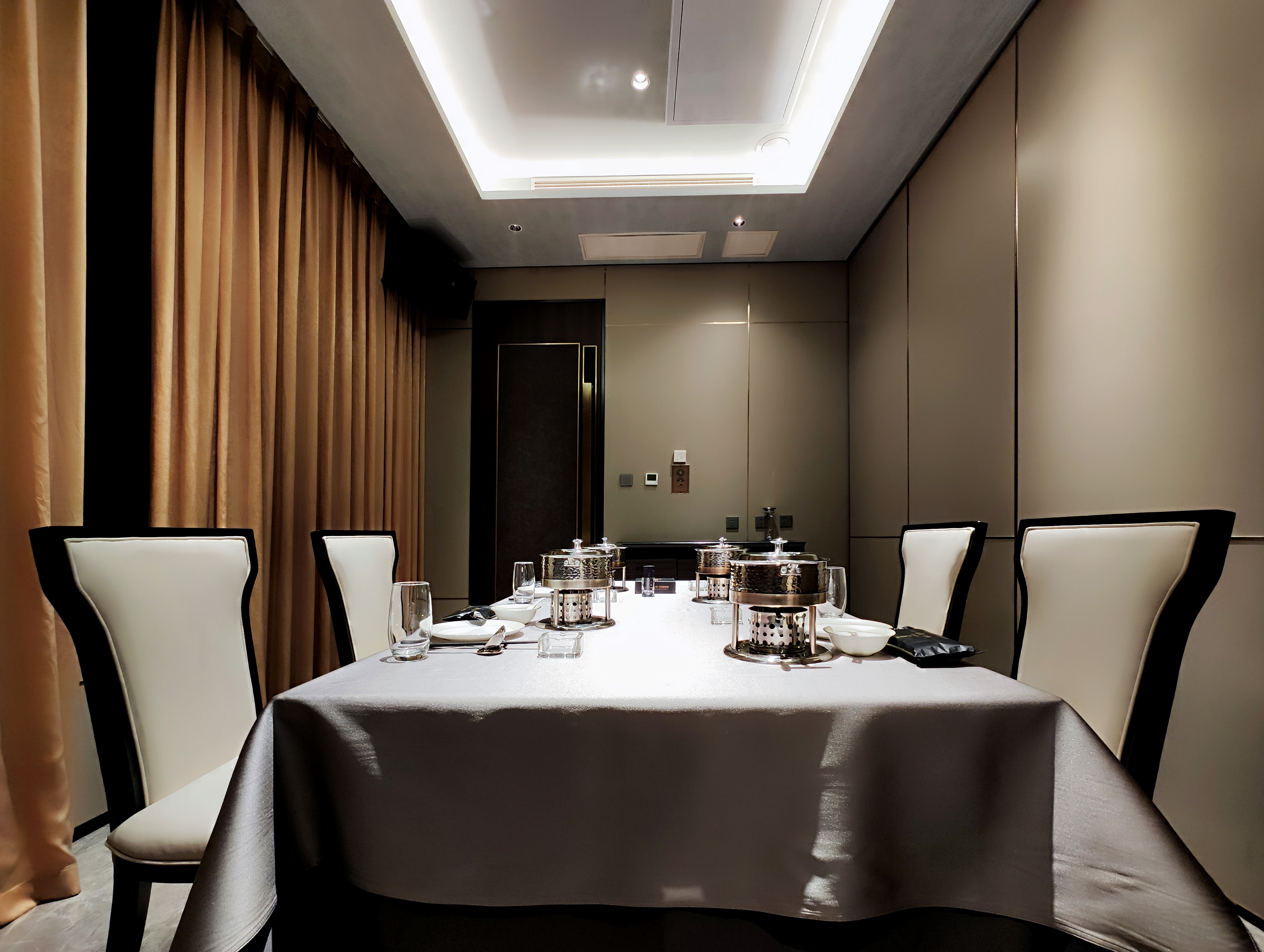 本案建筑本身比较方正,为了尽量把房间布置的能够通风透光的位置,这样就形成了一个”回“字形布局,这种布局虽然”呆板“但从服务动线,消防疏散,空间利用等多方面就形成了最优布局。火锅房间我们采用圆桌加沙发茶台布局;烧烤房间我们采用长条桌方式布局;同时我们还设置了一个可容纳36人的多功能空间,可以封闭分割成4个独立房间,也可连通成为中型聚餐,宴会场所,都非常符合各自的就餐场景及客户需求。
