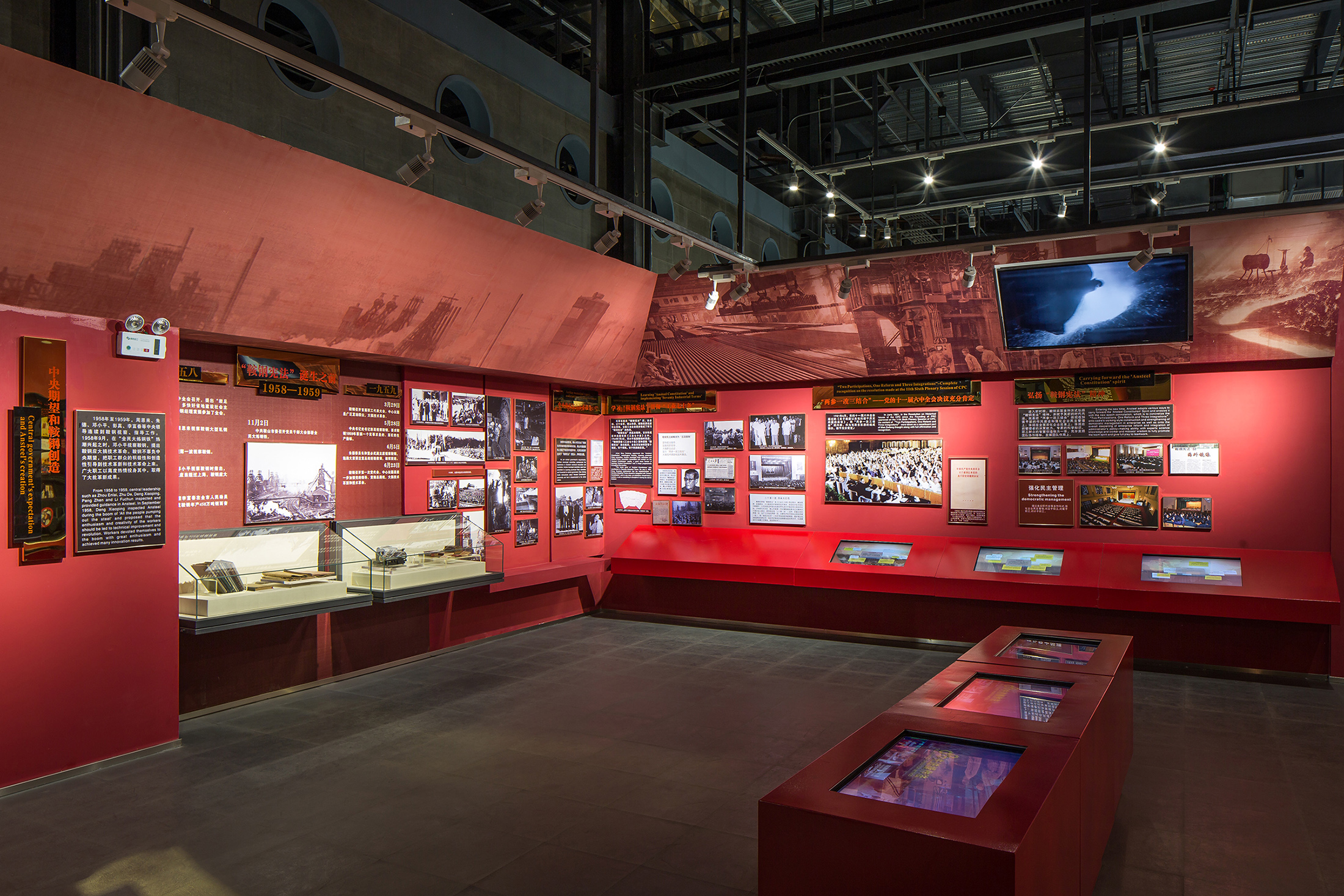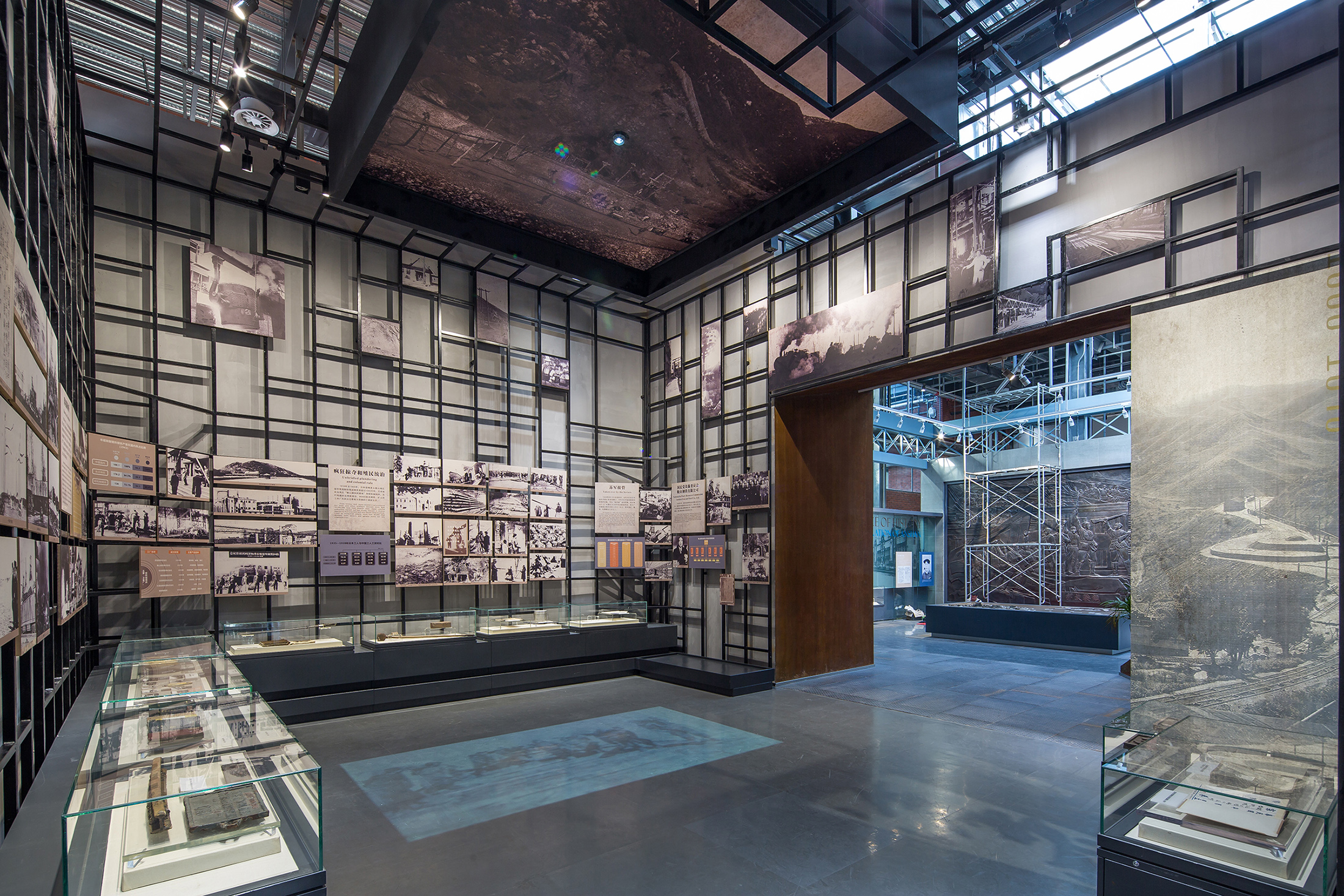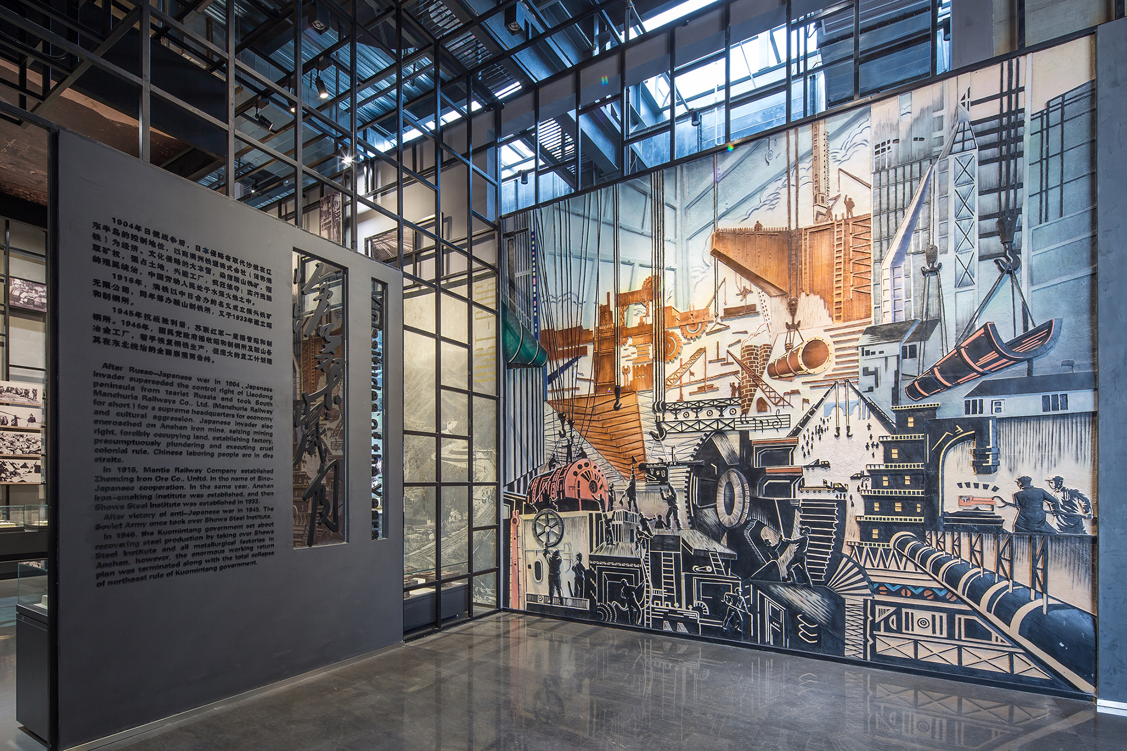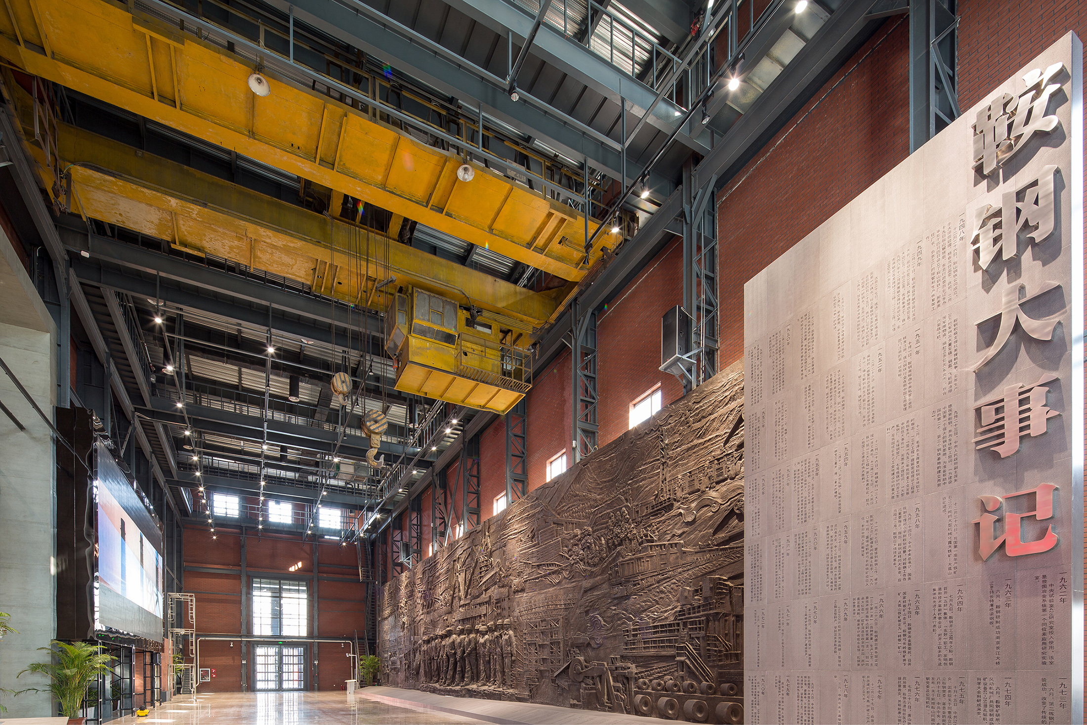 项目定位:鞍钢博物馆位于中国辽宁省鞍山市铁西区,占地面积67000平方米,其中博物馆主体建筑面积为12800平方米。鞍钢作为新中国第一家大型钢企,共和国钢铁长子,素有“一部鞍钢史,半部中国工业史”的说法。设计师在前往博物馆的选址——一座近70年历史的老烧结厂房考察时,能够非常清晰的感觉到,在往日工业生产情境下那些历史的回荡的声音:这座年近花甲的老厂房,被四排整体贯穿一层到三层的巨大烧结机器所布满。而这些具有浓厚工业感和历史意味的元素,构成了一个非常具有冲击力的视觉景观。从上世纪五十年代到八十年代至今,它们记录下了那段火红的工业化岁月。