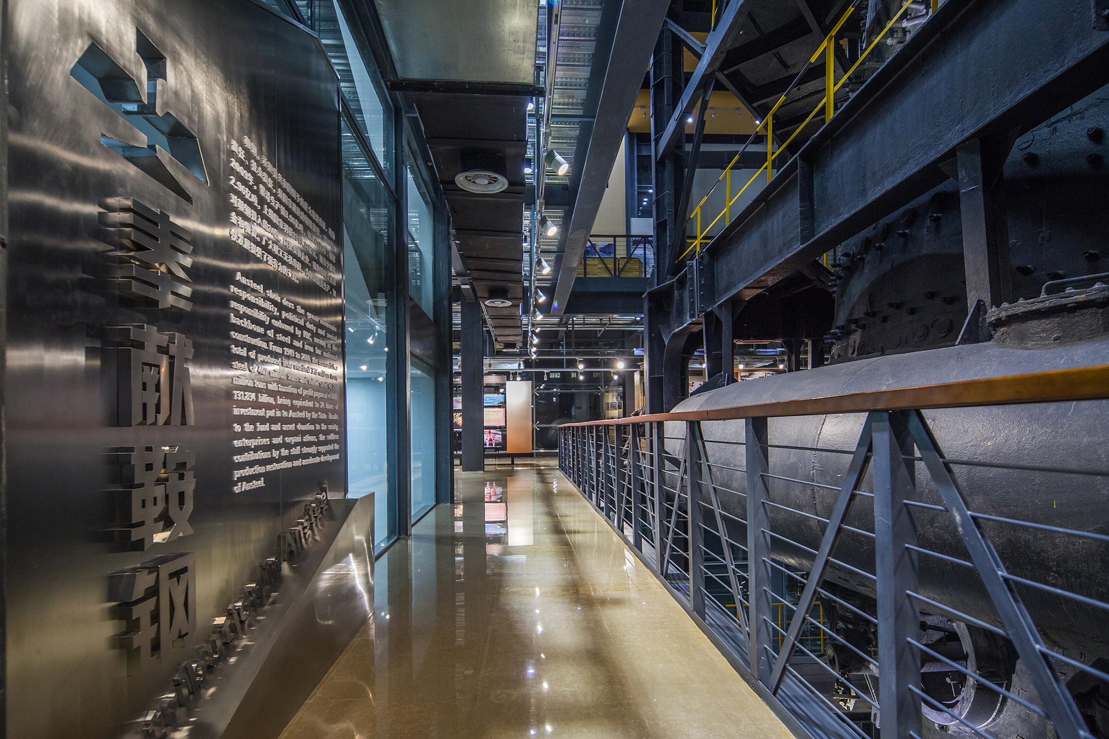 设计选材:余米高的百年老高炉整体拆分,移至此处重新组装,这样既保护了文物高炉,也让高炉与厂房、与老工业设备共同重构成博物馆最为震撼的工业遗产景观。同样是秉承这样“修旧如旧,建新如故”的原则下,原厂房内十几米长的烧结机生产线、大型货运电梯、航吊等老工业设备都得以保留,不仅本身让工业景观在工业展览的措施下涅槃重生,也体现了绿色、环保、再生的设计理念。