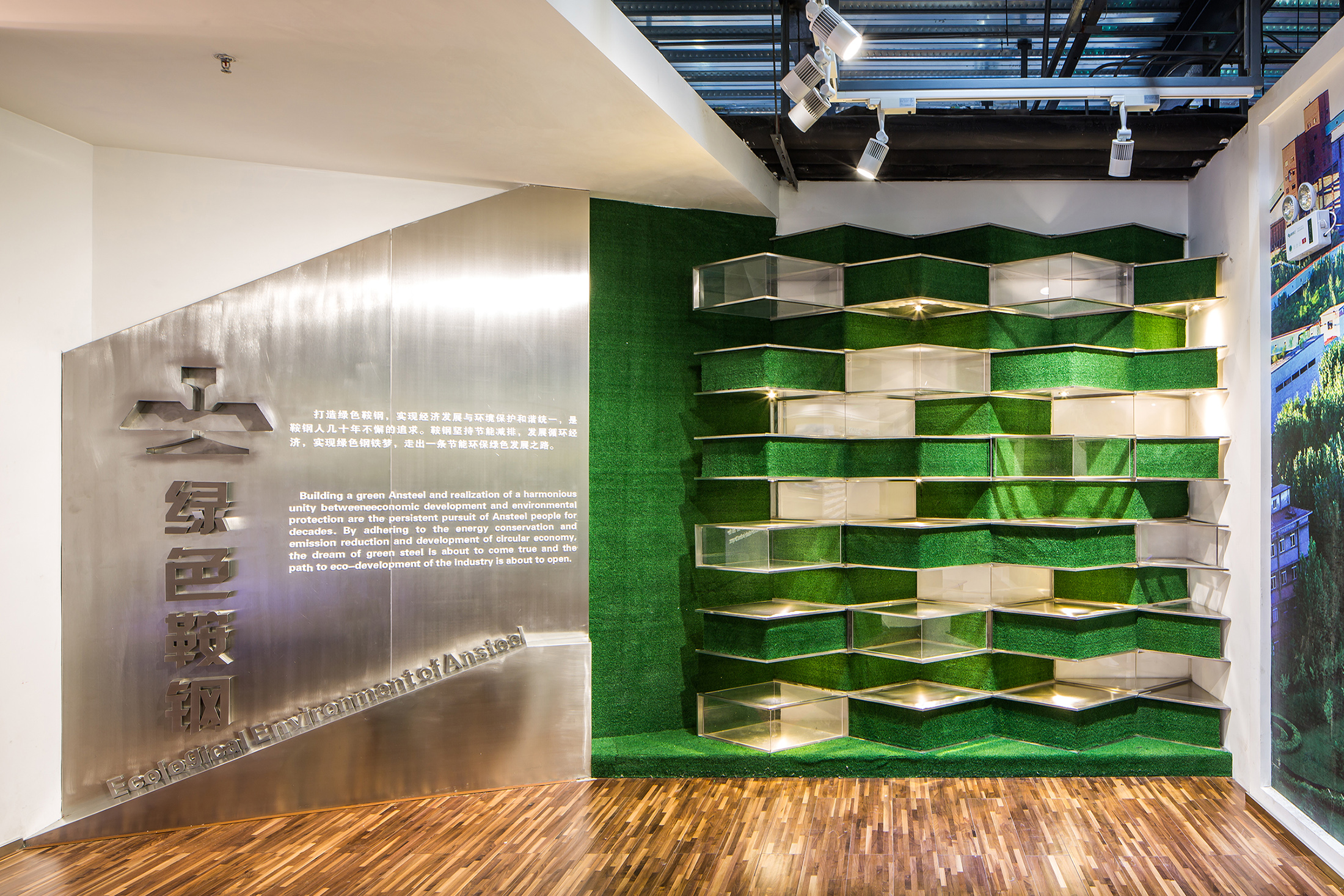 空间意境:为了把这些代表和记录着中国工业发展史的遗存作为核心展品,带到普通观众的面前,设计师提出了这样的设计理念——“打造绿色生态 演绎工业景观”,希望把这个项目搭建成一个绿色生态的工业展示景观。
