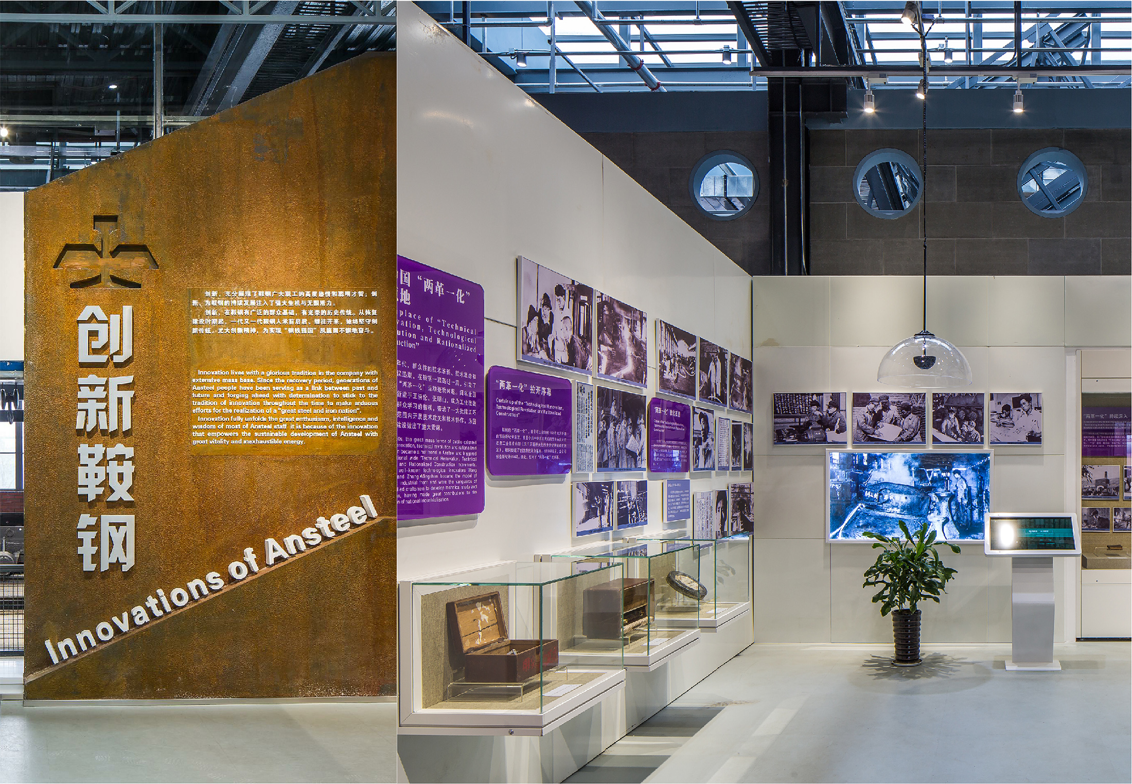 空间布局:设计过程中遇到的第一个重大问题是建筑的尺寸测量。二烧厂房经过了几十年的不断修缮,建造后实际上是没有一个完整的图纸,设计师们当时四处去寻找这个原始的图纸,最后在鞍钢厂区北门的一个小仓库里,翻到了苏联人在1953年绘制的厂房图纸。第二个重大问题是鞍钢多年来的各类工业遗存保留的非常完好,但同时也散布在了24平方公里厂区的各处。这片旧工业区域在本质上是一个尺度较大、开发强度高的复杂生态系统。为了把它们收拢起来集中展示,后来的解决方式是建设一个综合的钢铁主题公园。在最大限度保留原有工业元素这一前提下,海外装饰的设计师们成功做到了让原工业厂区焕发出符合其原本气质的“第二次生命”,让建筑本身成为最重要的展品之一。通过工业文化、公共艺术、绿色理念的完美结合,记录了鞍山发展的独特城市记忆,记录了鞍钢工业发展不同阶段的重要信息,见证了国家和工业发展的历史进程,把工业遗产所包含的文化价值,与当下的科技、环保、艺术、文化等诸多因子紧密结合,实现工业文明的动态传承和可持续发展。