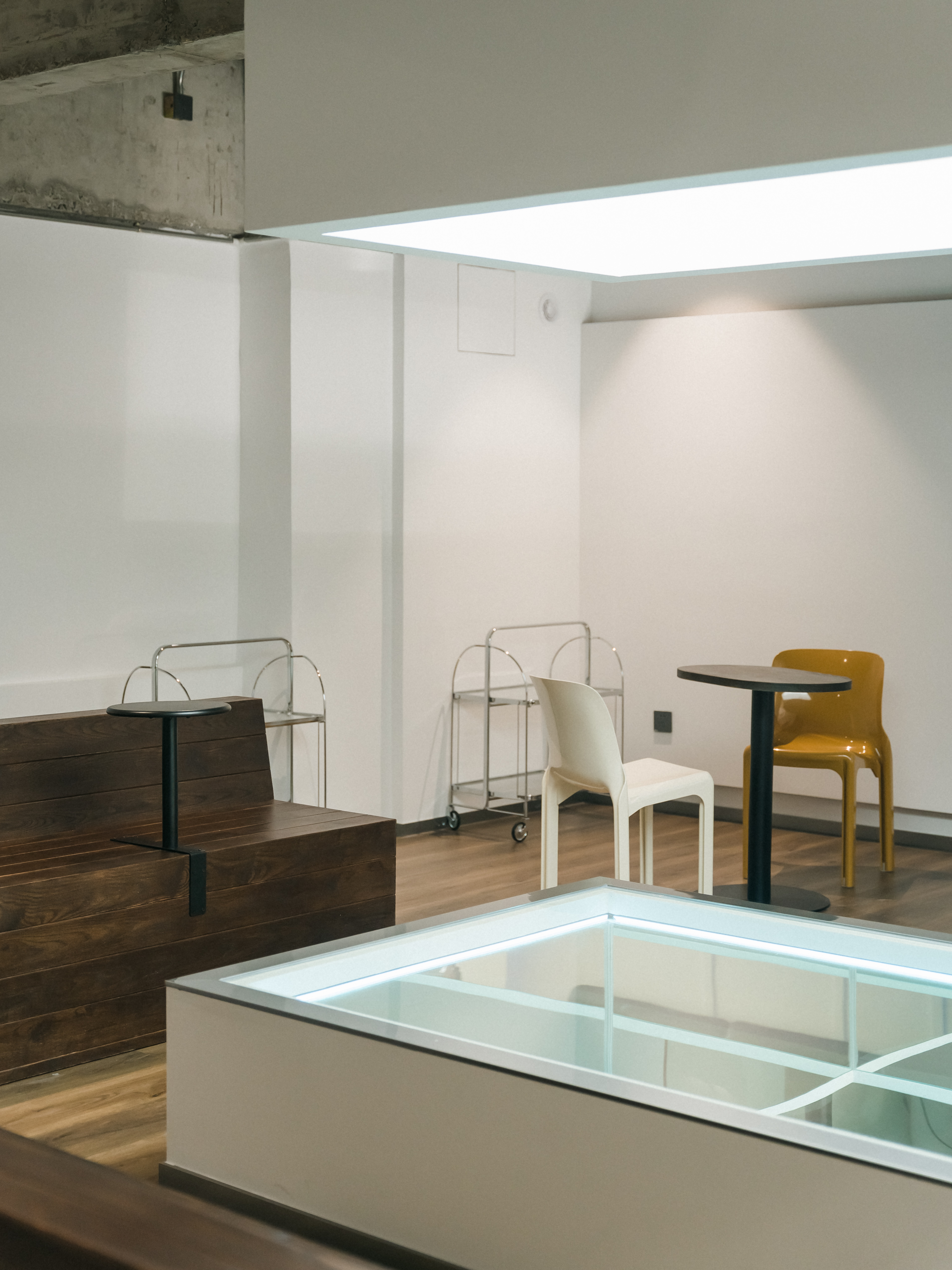 空间布局:由于层高限制,夹层底的高度只有2100mm,所以在夹层中间位置我们设计了一个中空天井与吧台呼应。使首层的视觉挑高的同时,也使得一二层形成呼应。两层的消费者可以通过镜面反射互相可见。