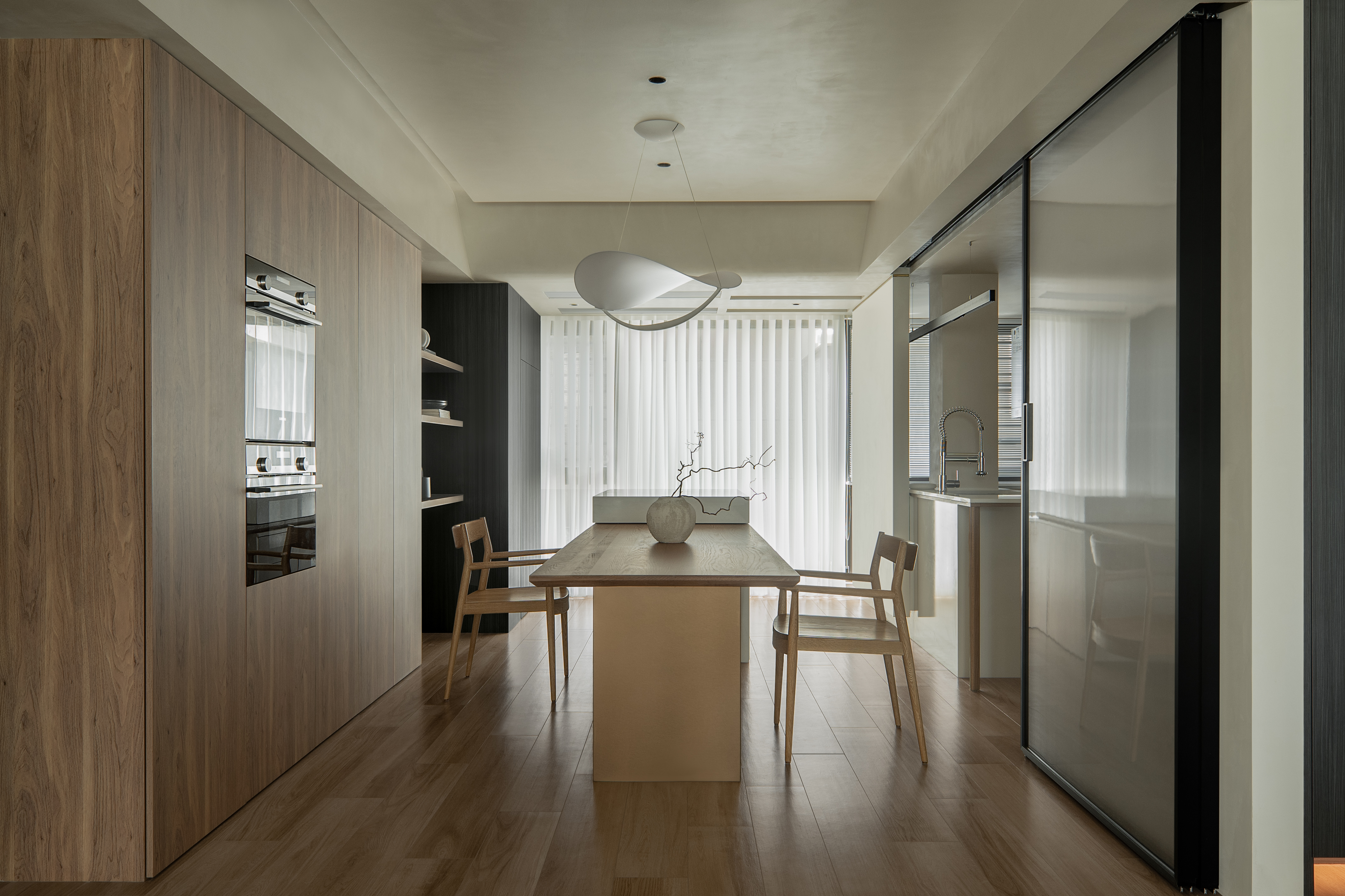空间意境:原始结构户型规划的五房和屋主诉求有着矛盾的地方,三代人只需要三房即可满足原本的功能需求,日后如果住家保姆照顾老人的衣食起居,也只需要转换出一间卧室,同时厨房希望能够做到不做饭时可以尽可能的开放,又能做到完全的封闭效果,因此空间的灵活性、流动性、以及空间的尺度感是我们规划平面时与屋主达成的共识,因此在餐厅及厨房的区域利用联动移门去解决空间开合流通的问题,最终形成了打开之后很完整的视觉效果,关闭联动门又得到一个完整的中厨空间,在女儿房区域利用柜体隐藏折叠门来实现空间将来可能需要用到的保姆房,现阶段这个房间被释放出来以盒体为中心形成一个开放的回游动线,来满足女儿的娱乐活动。