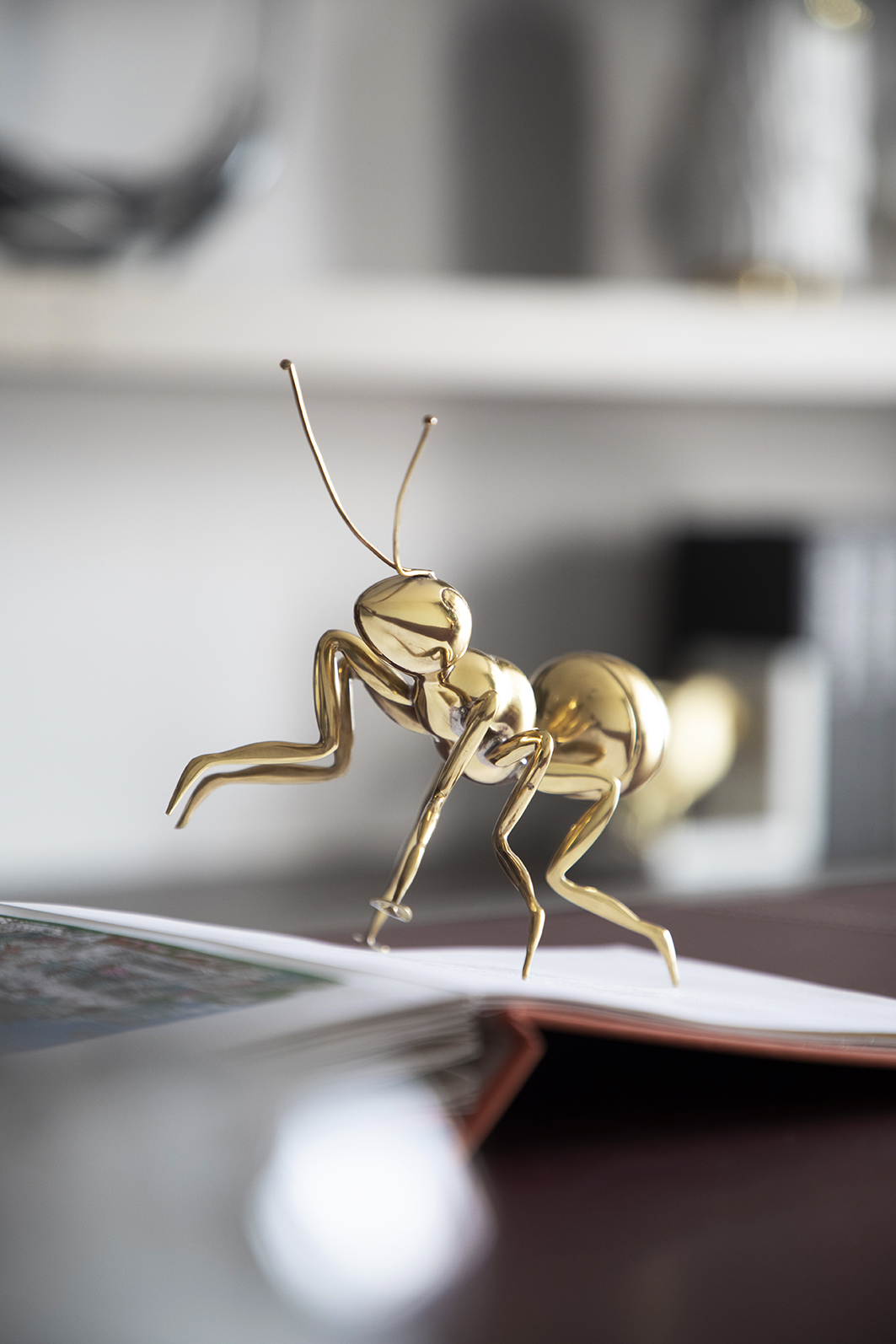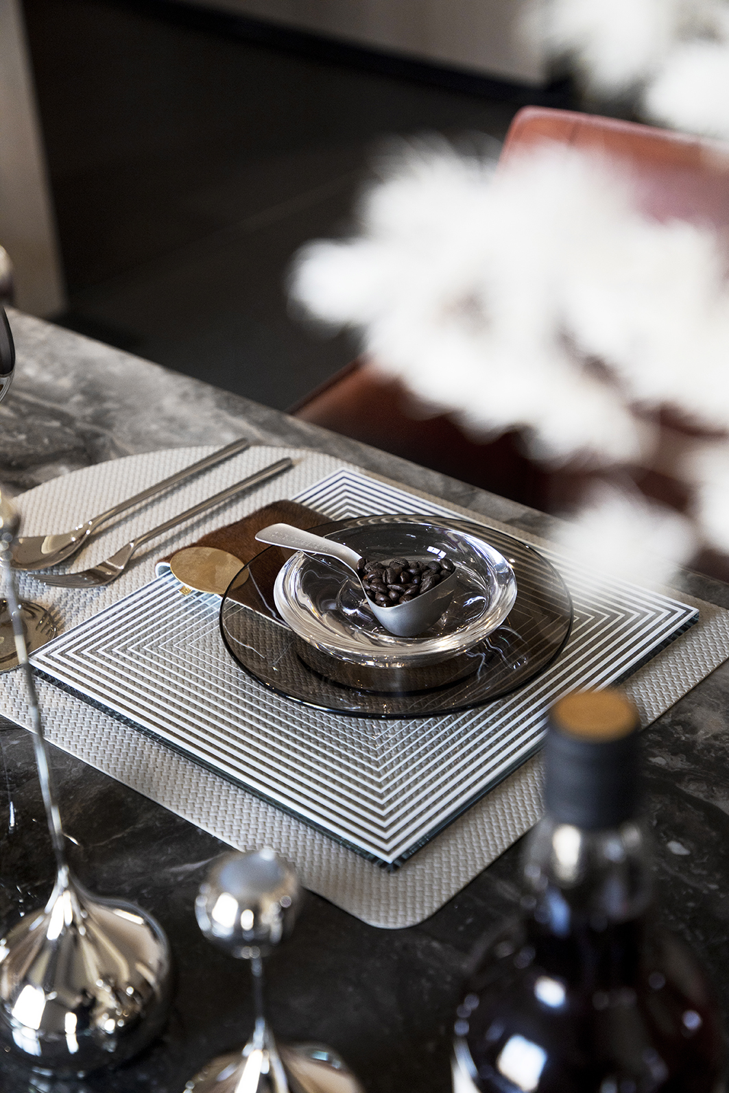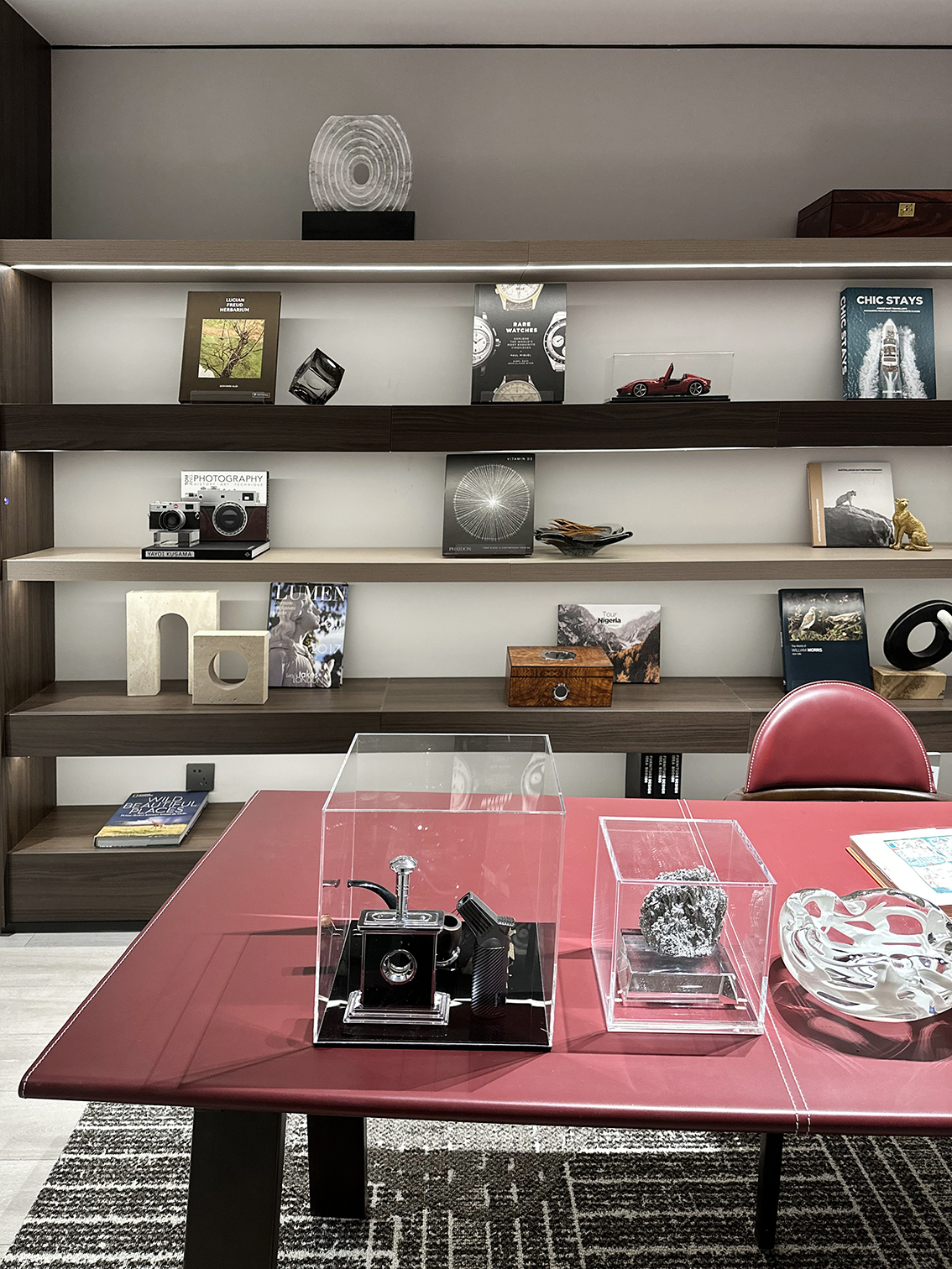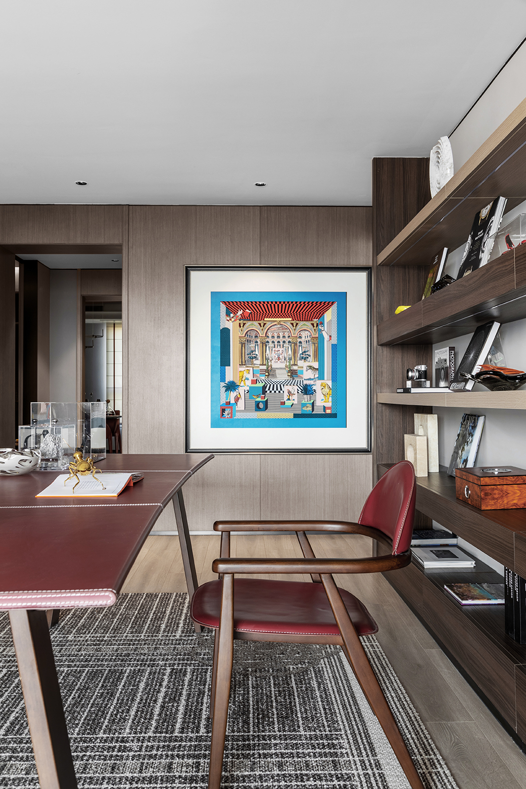 书房延续主色调的同时,搭配灵感来源于CHANEL百年高定珠宝的山茶花5号元素作为地毯, 羊毛粗花呢的质感;Metiers书桌算得上爱马仕家具系列的经典了,由著名建筑师恩佐·玛里为爱马仕创作,胡桃木的支架搭配小公牛皮的桌面,材质和结构皆是上乘。书桌整体弧形的造型有一种包裹感,质感很好