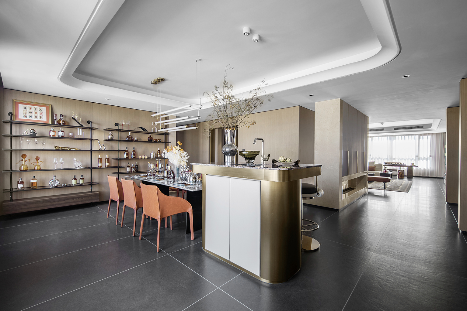 餐厅当前具有开放性的餐厅设计,模糊了界限,是家庭的精致生活,是亲朋好友交流切磋厨艺,品酒的好去处