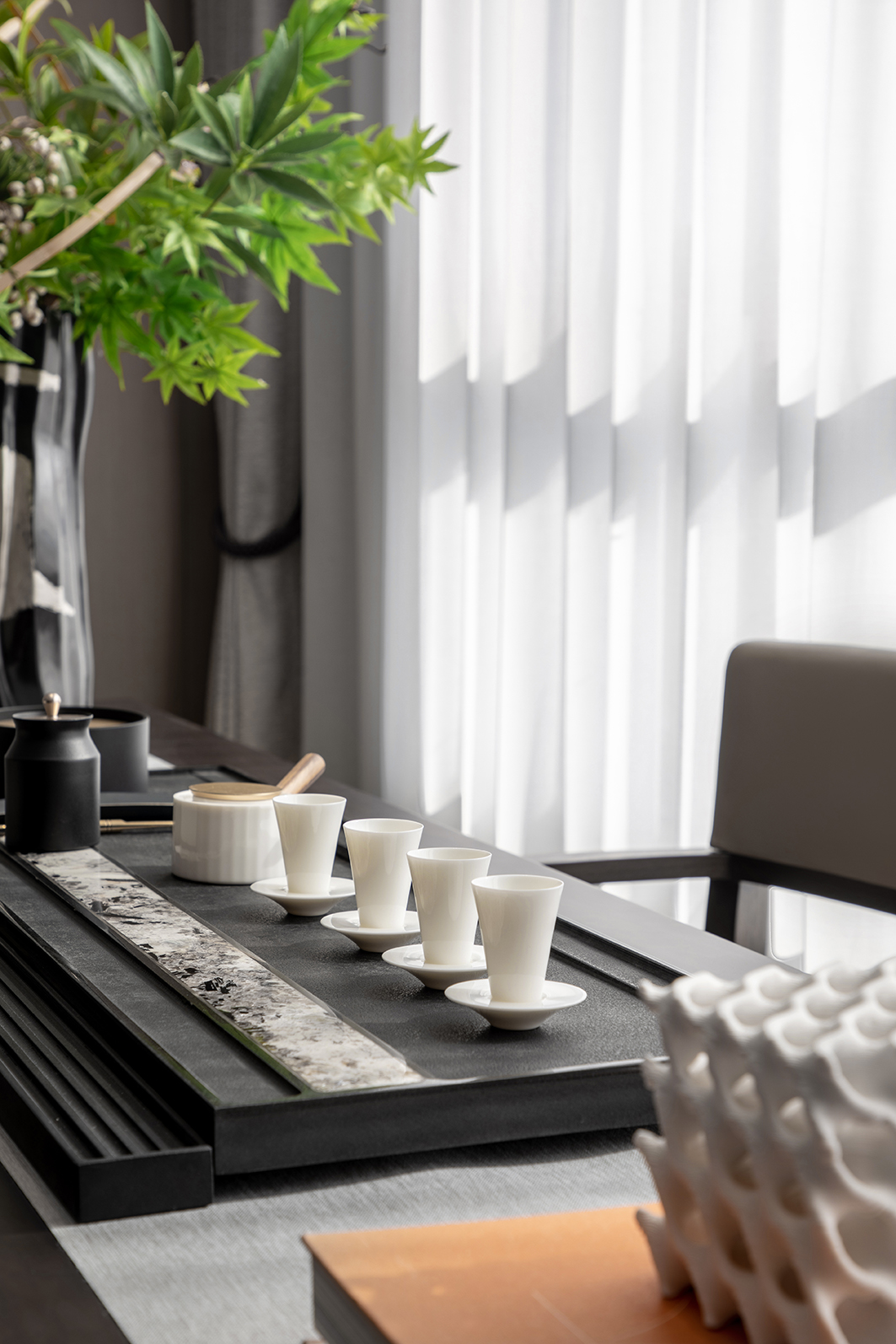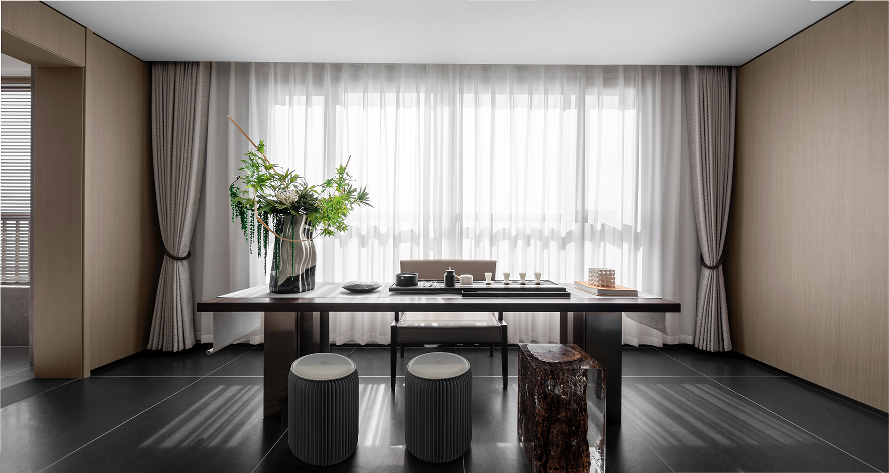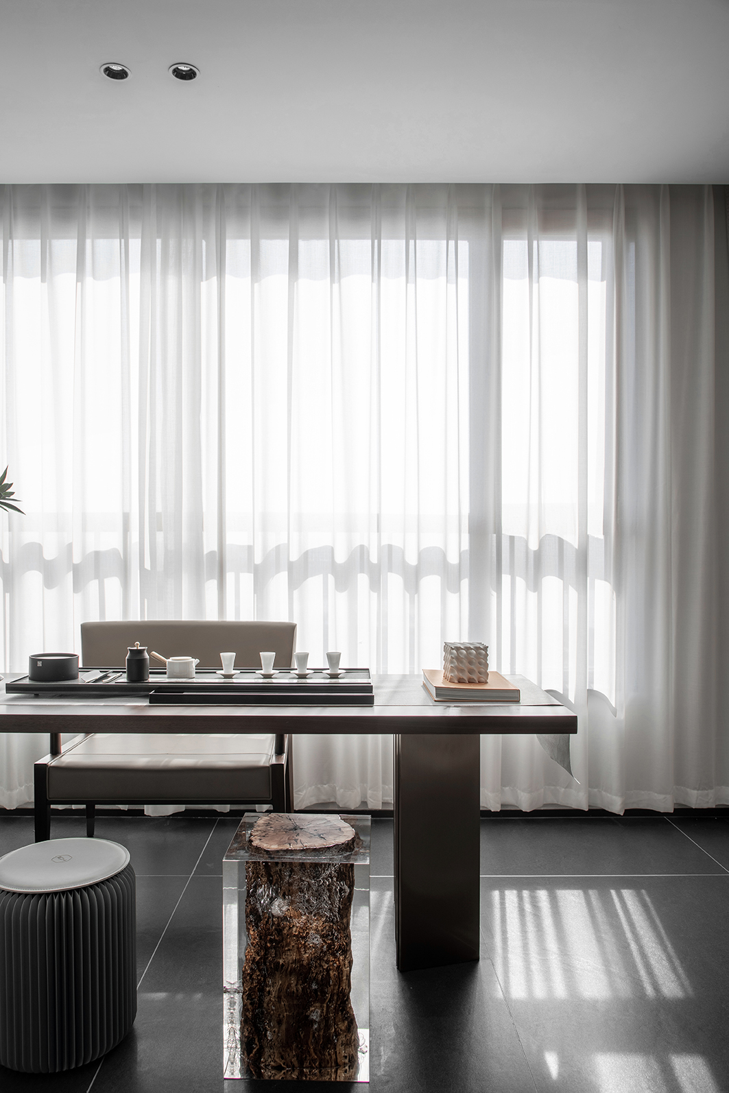 客厅:将不同元素融合汇通,以简洁、质朴的设计手法与取材,去繁取简,通过材质间不同质感与特性的碰撞,加之光影的独特魅力营造整个空间的韵律感。细节之间细腻精致,置身其间,寻觅内心的静谧祥和。窗外是生机勃勃的城市花园,客厅与品茗区的组合,休闲放松,摒弃流行的背景装饰,细节精致,少即是多,把空间还给主角。光影的律动、情感的充盈,使得室内的虚与实相生,含蓄内敛中抒写生活的温度。