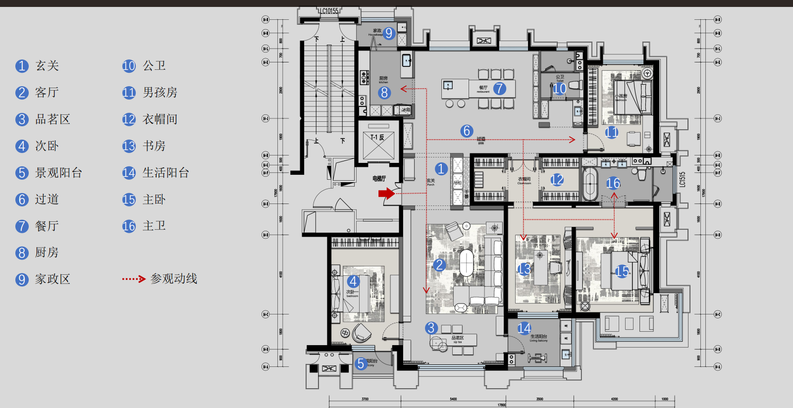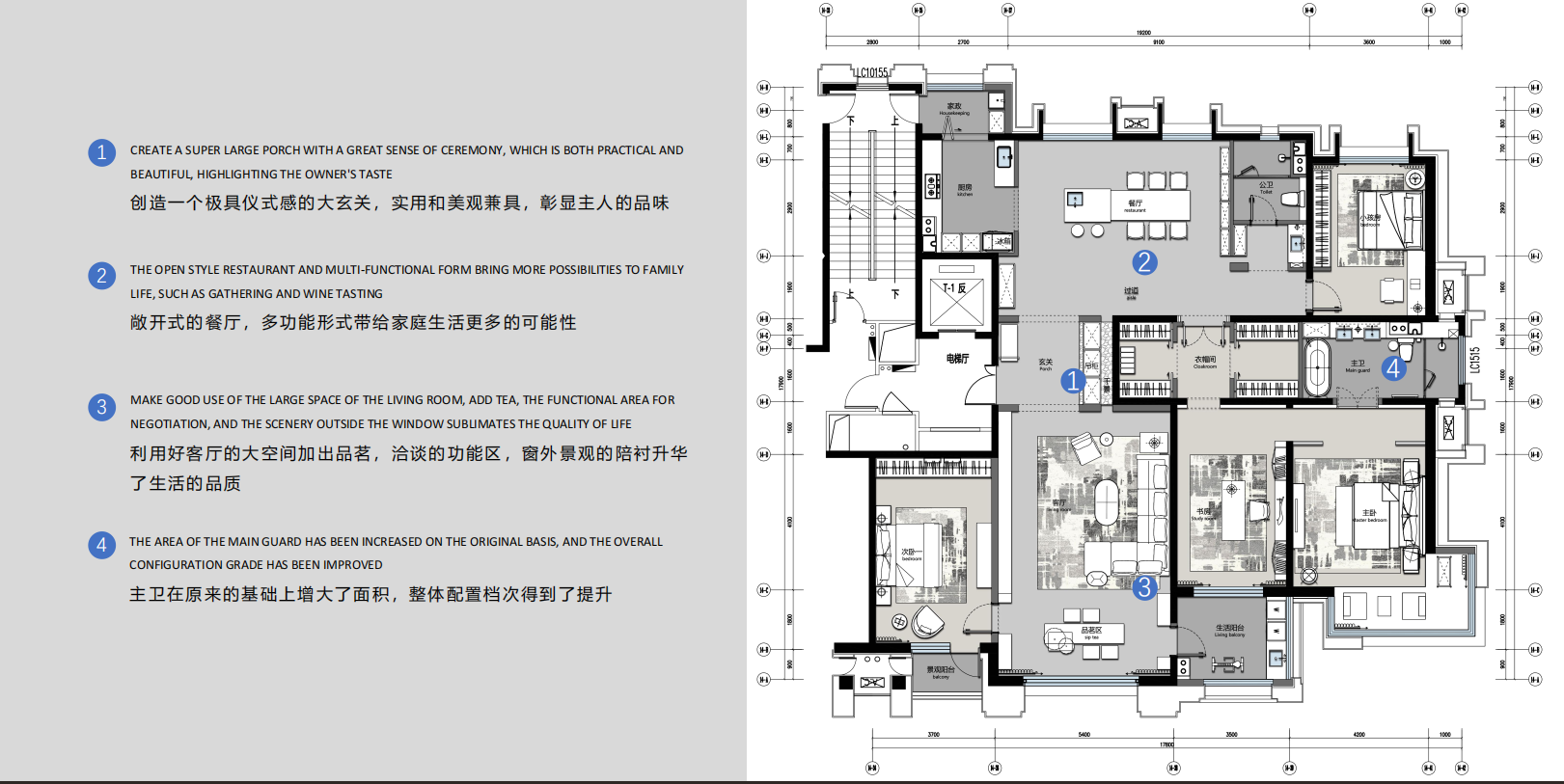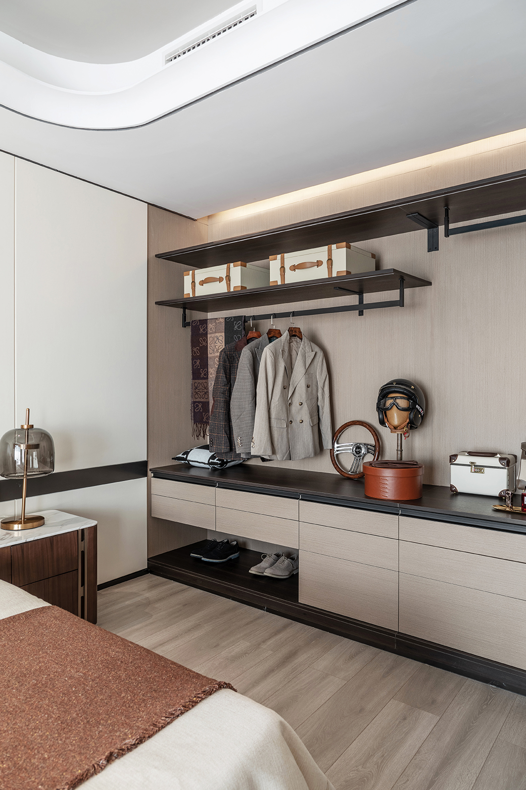 空间布局:公共区域打破空间分割感,加强穿透与链接空间,注重不同功能空间的互动性。客厅外景方位加入品茗功能,一期一会,重视每一次的遇见。主卧区域采用组团酒店式套间提升家居生活品质。