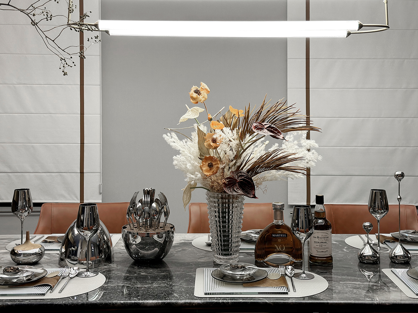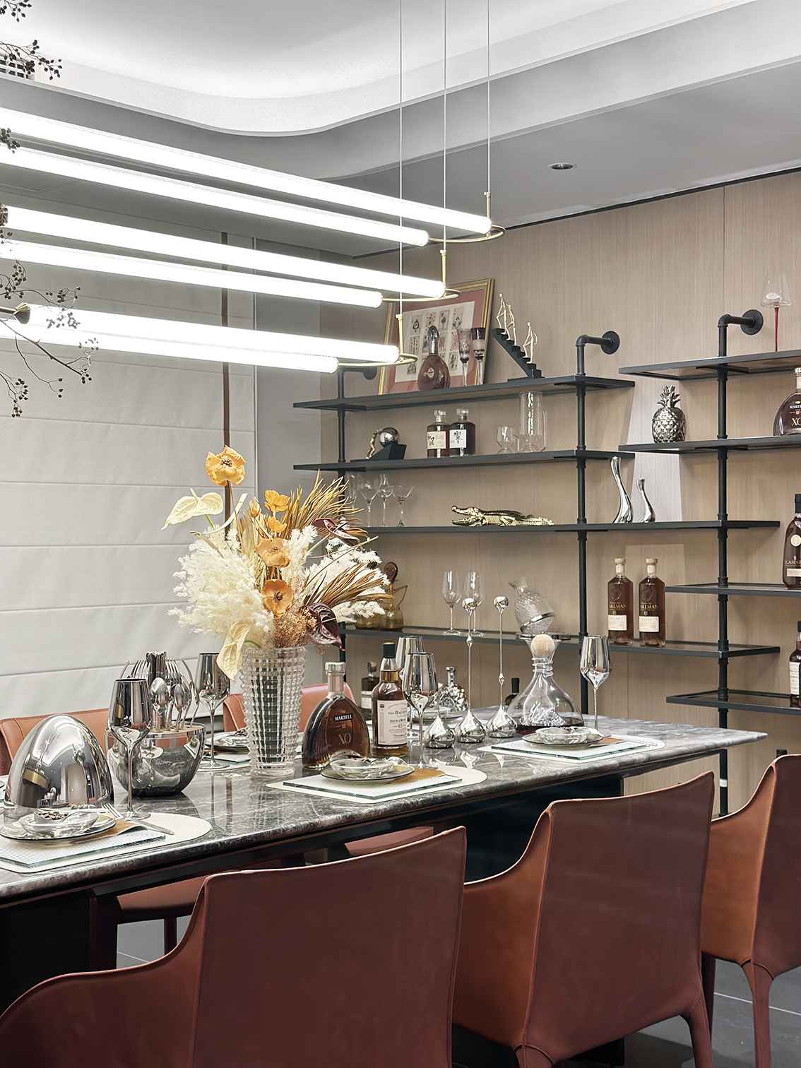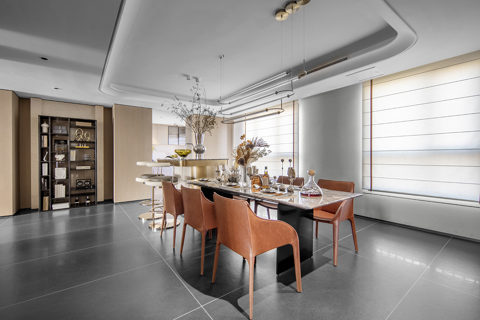 餐厅 山归来鲜切花艺为空间不仅增加了温馨的氛围,更是主题的色彩及材质的呼应和延续。高级的橙棕色与进口石材融合,释放出高贵雅致且不失温暖的氛围。难得的餐厅大空间尺度让它具备了多种布局的可能性,适用于生活的多元化。