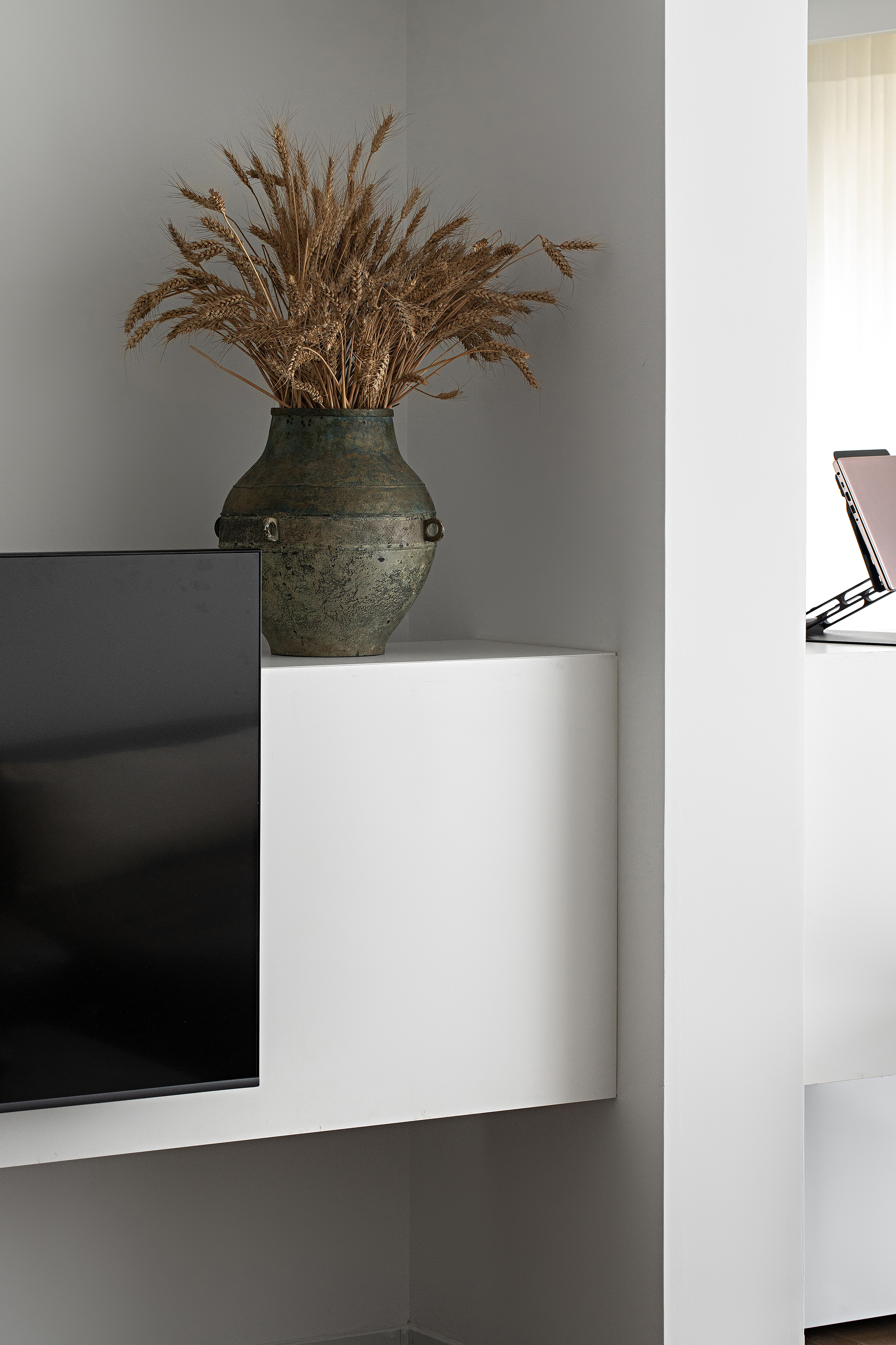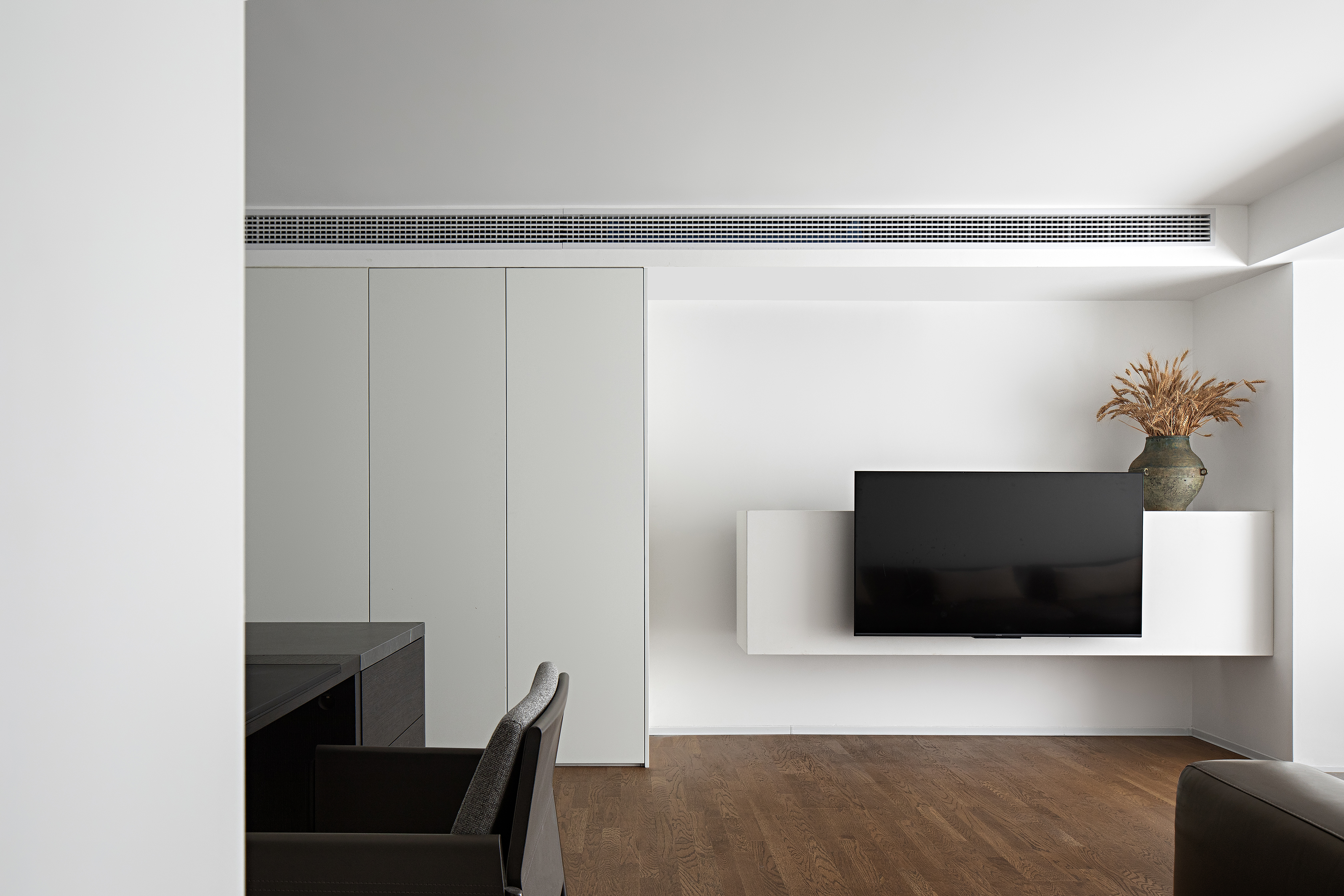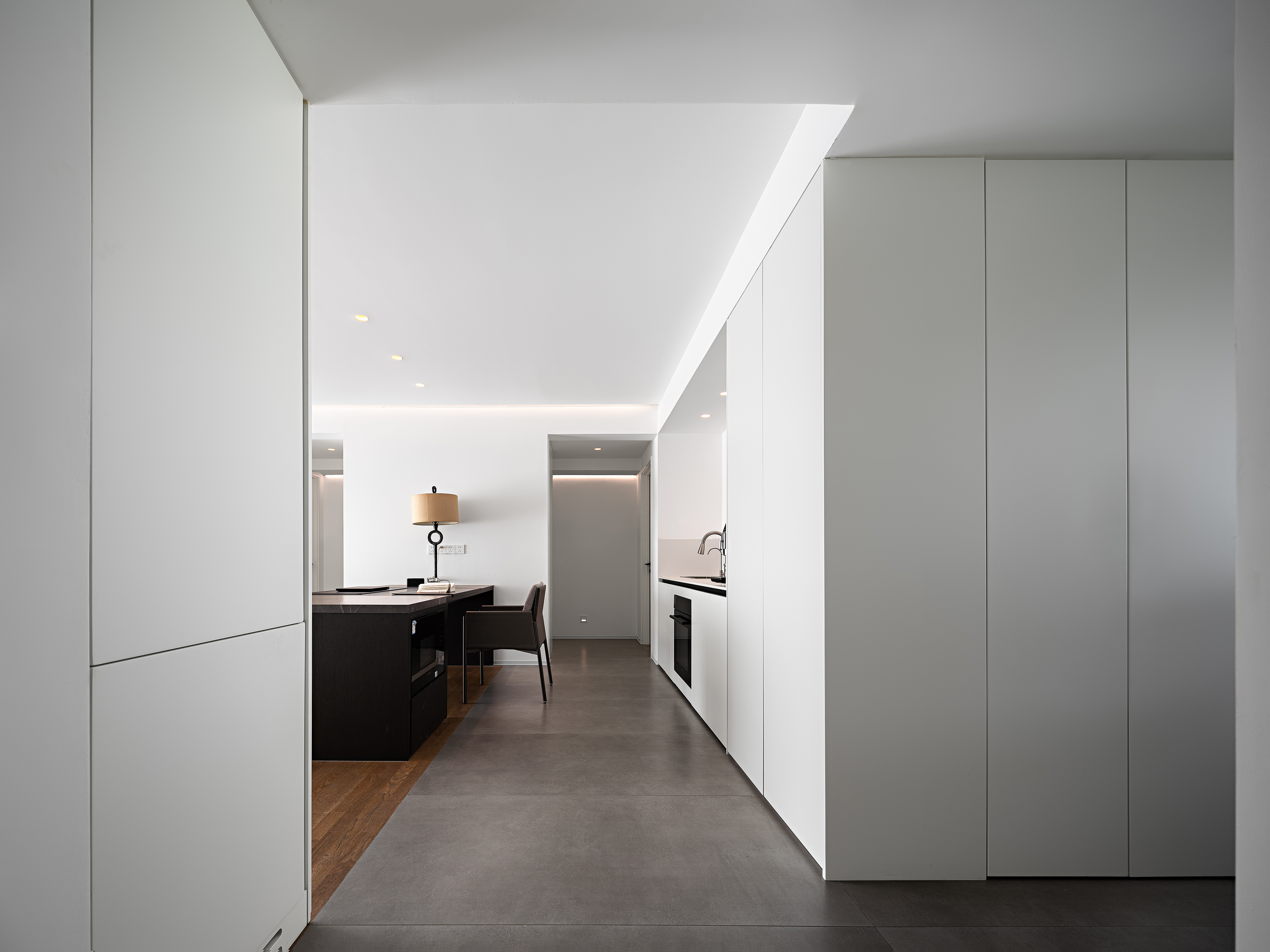 大面积留白,以及区别常规风格的背景墙等处理方式,呈现出它的规而变化异样的造型;
