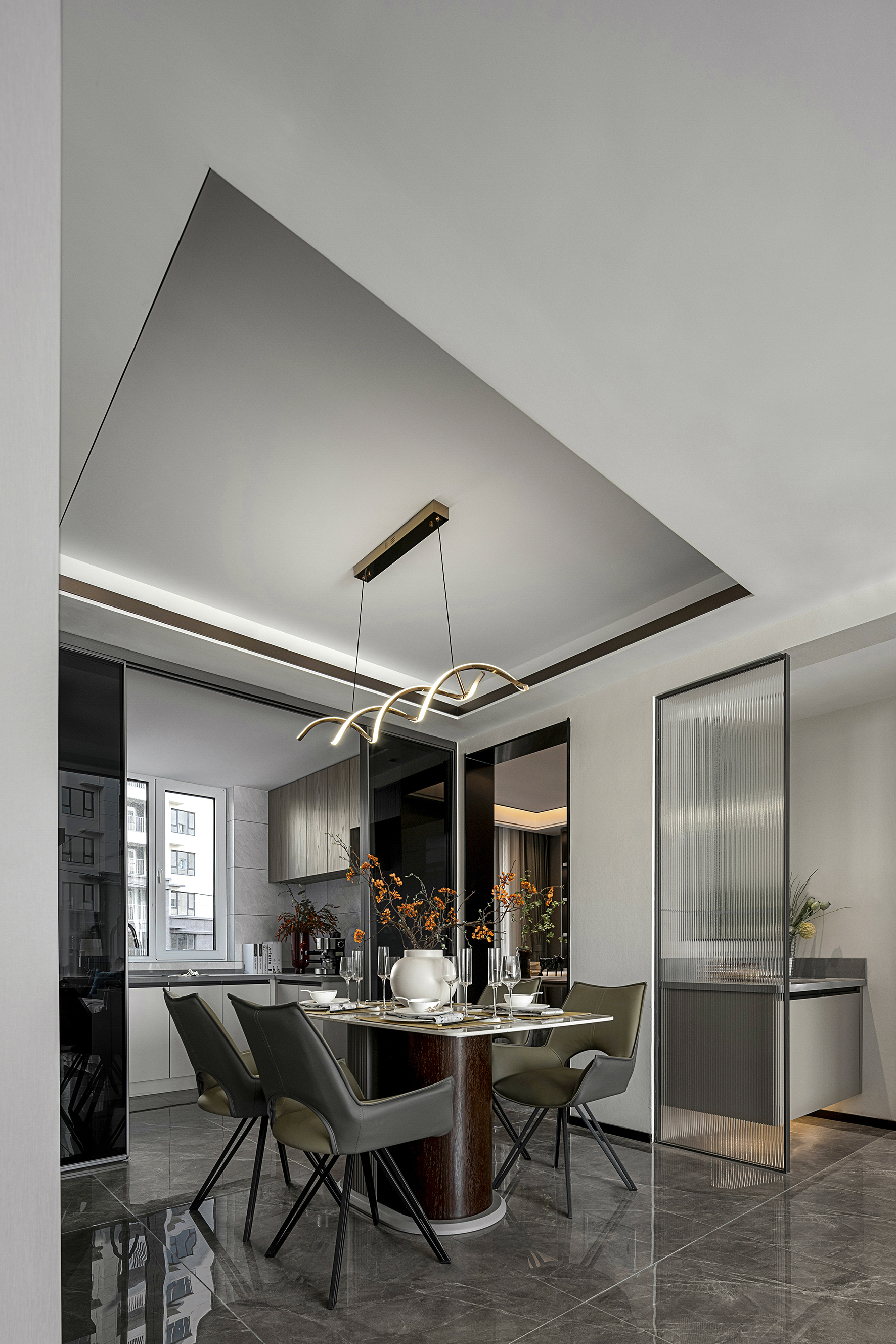 空间布局:客厅餐厨区并联于开放式的空间界面中,整个横向的布局大气而端正,保持相对独立又互通延展。以细腻手法优化生活场景,功能与结构之间实现平衡,流畅动线凸显出通透与开阔。