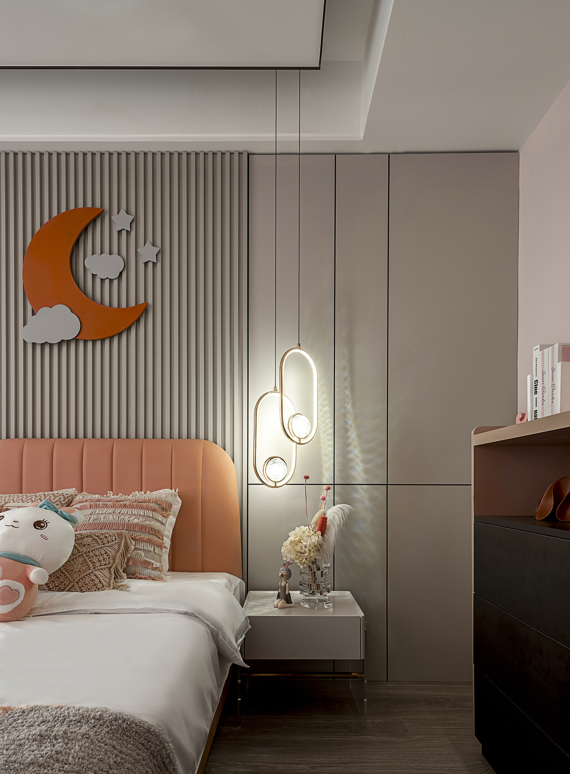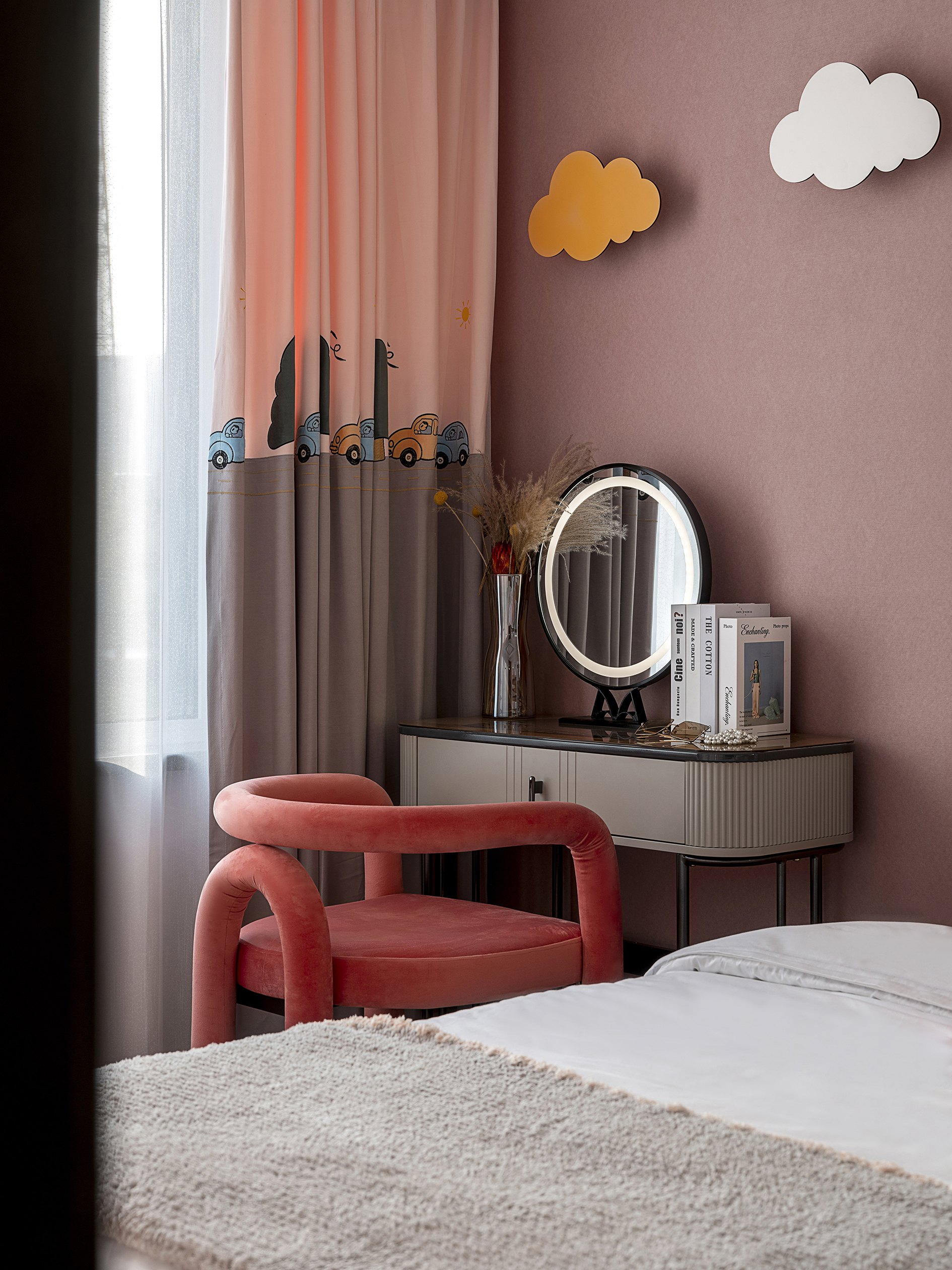 白夜童话小女孩摆件、云朵的装置、单人位沙发粉色的搭配,让整体空间拥有了儿童 的童话世界。