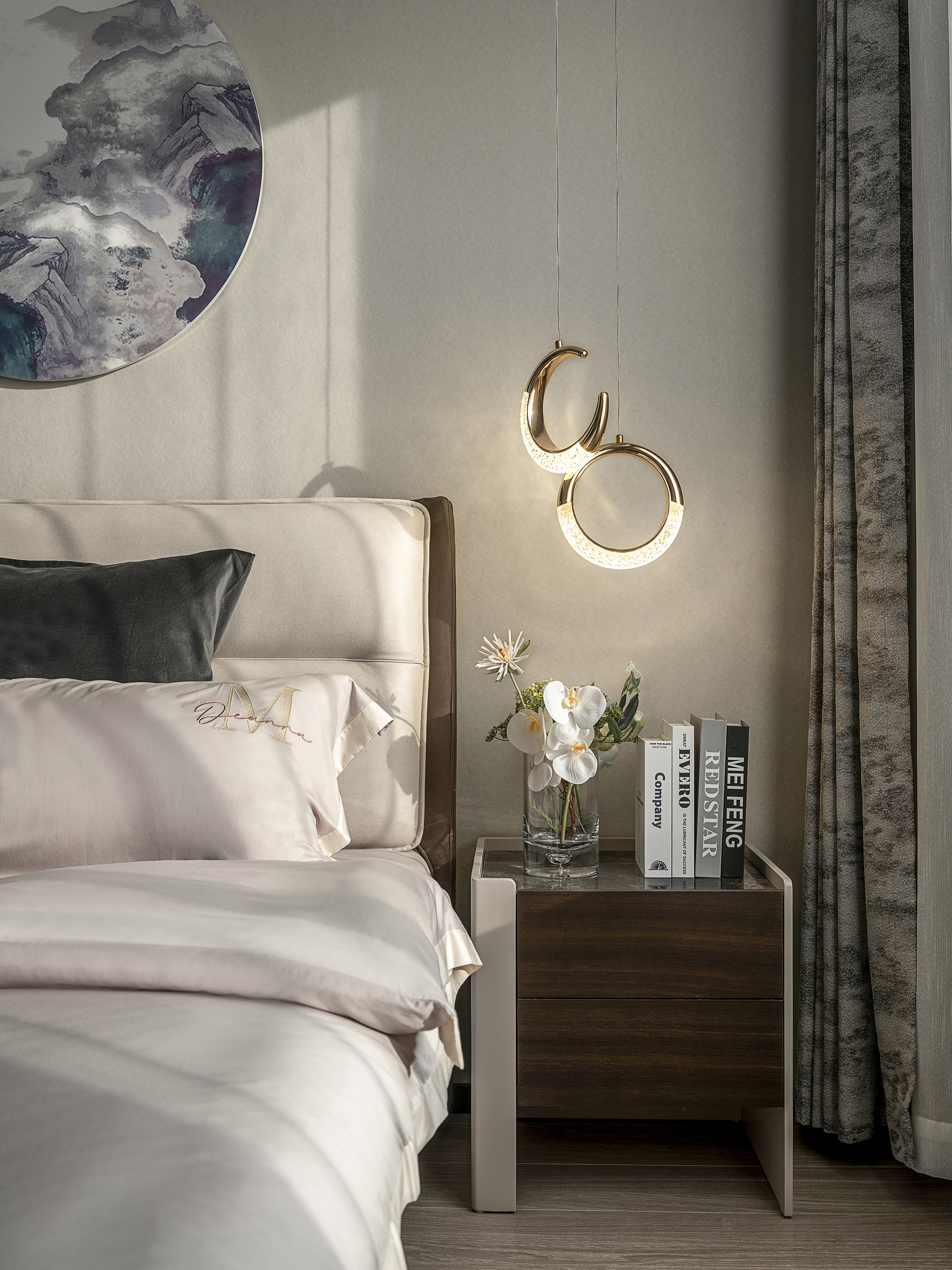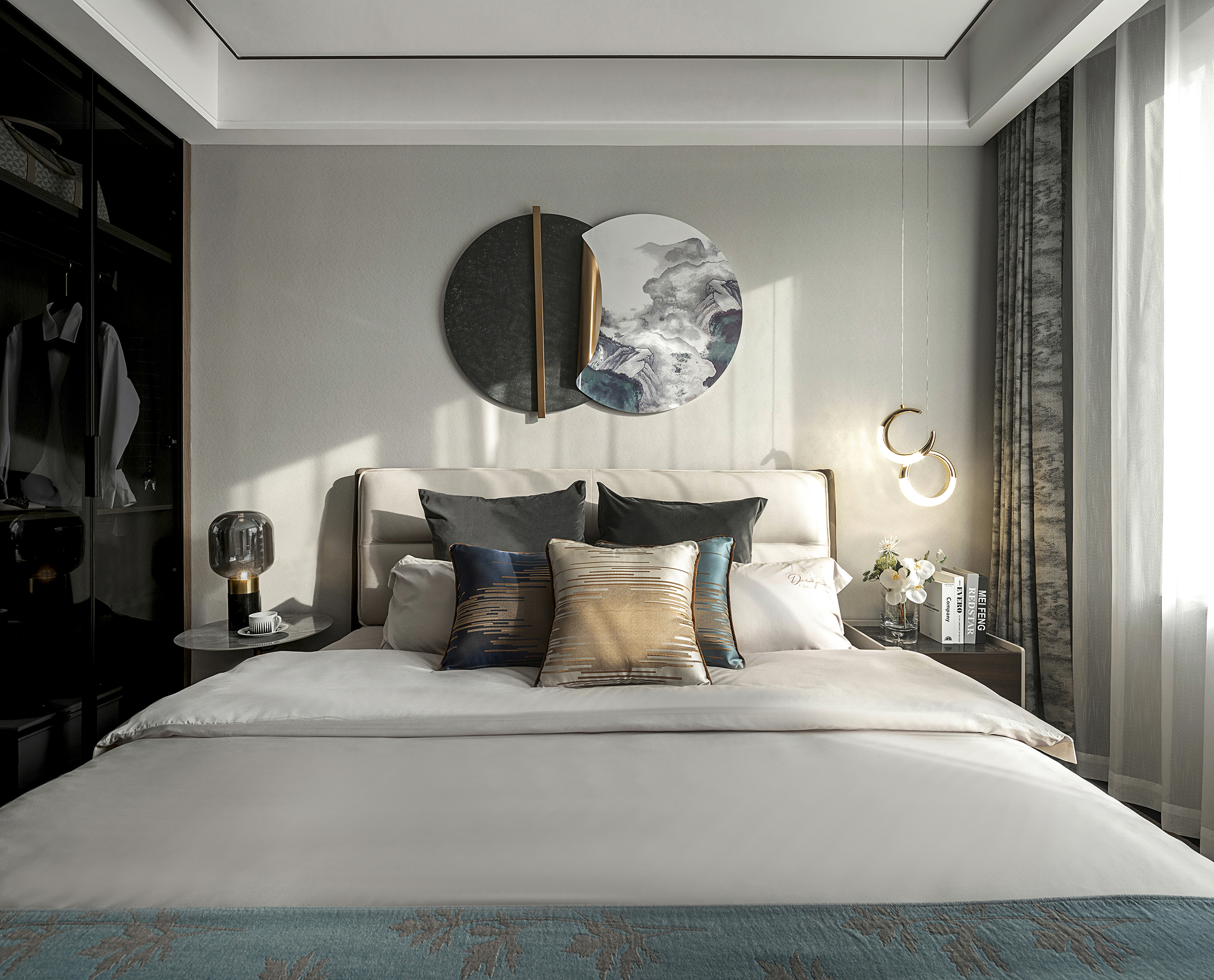 设计选材:主卧舍弃主灯,用点光源营造氛围,米白色调的墙面和床头背景让卧室有了温暖,而暖冷色的床增加了空间的清新感。