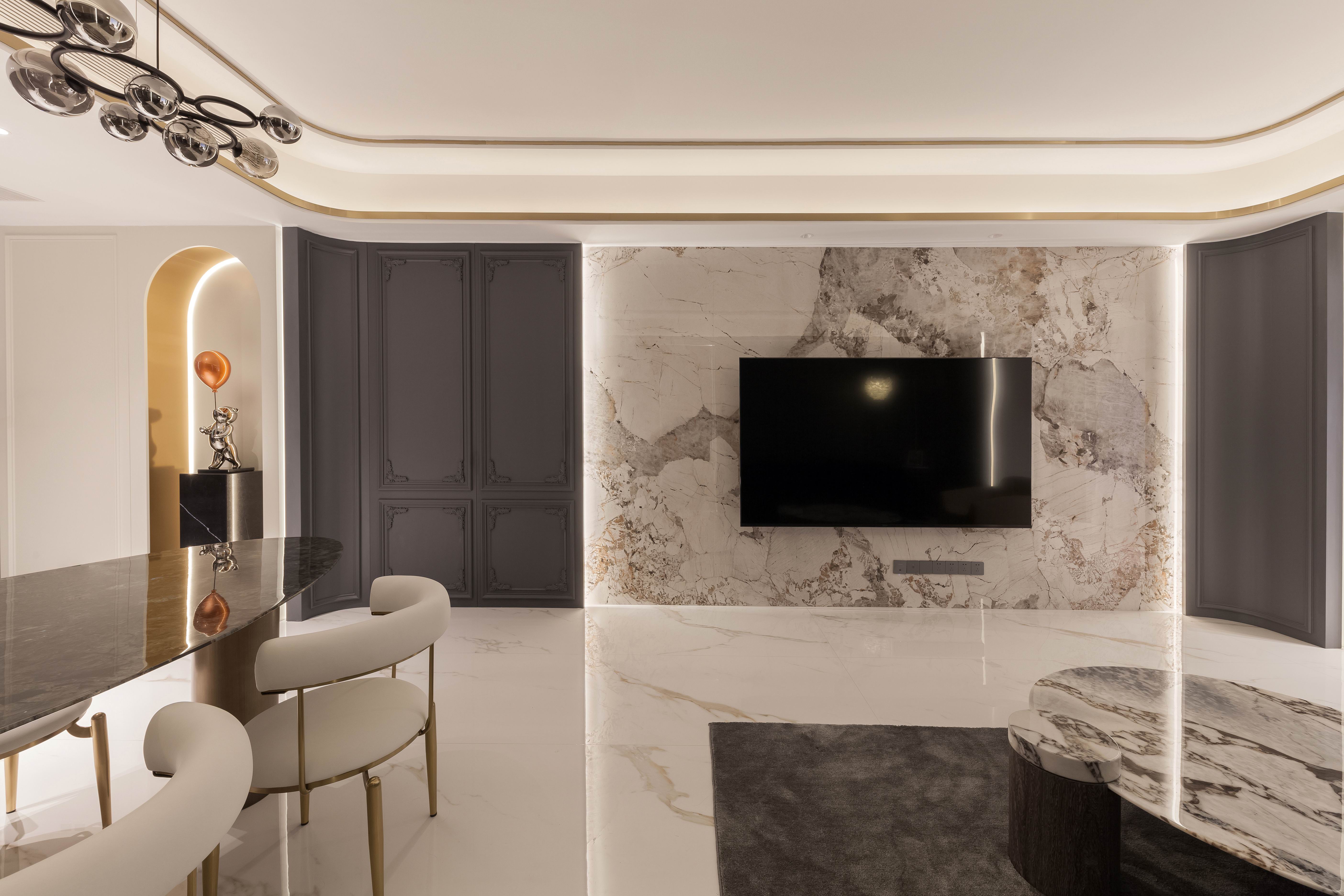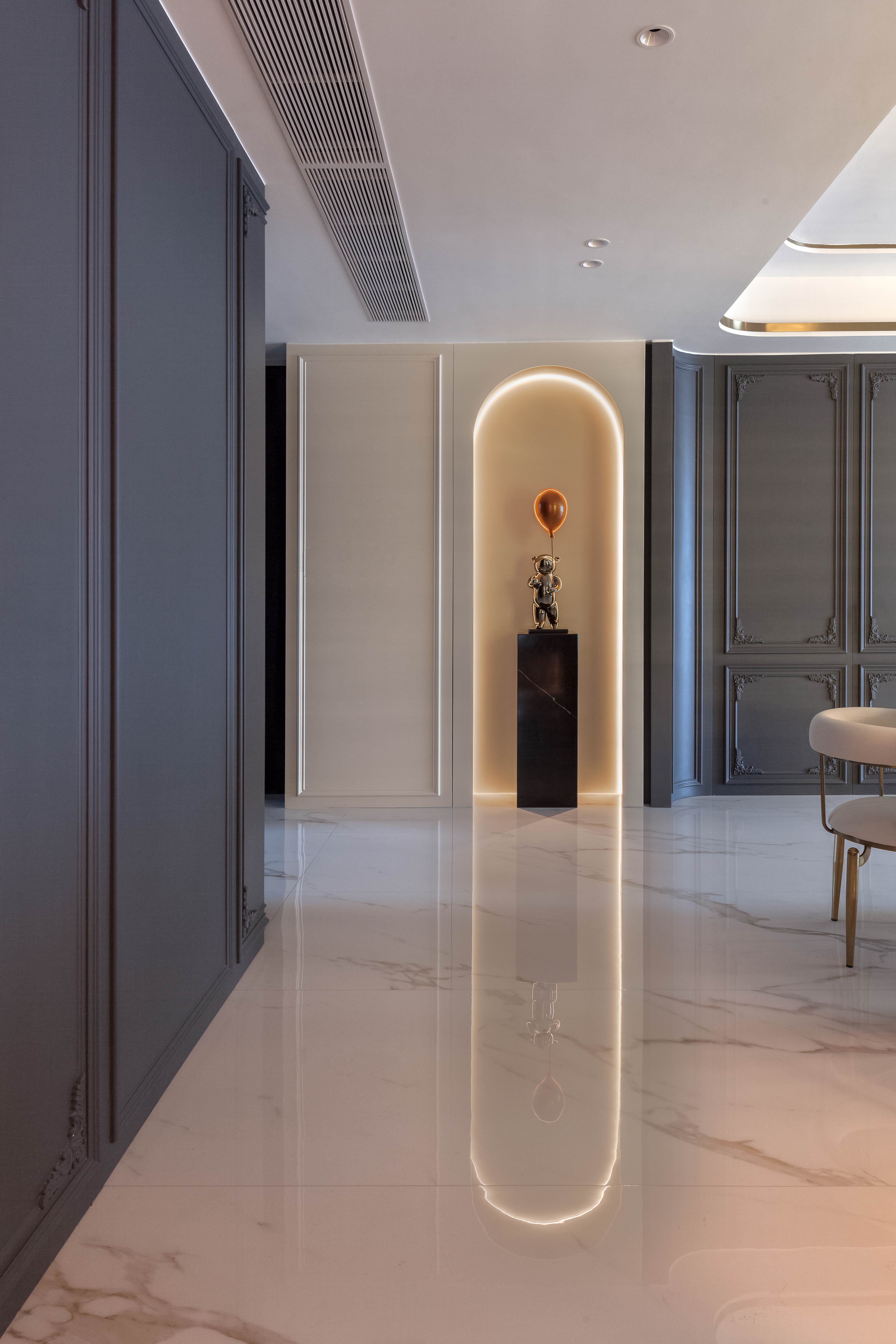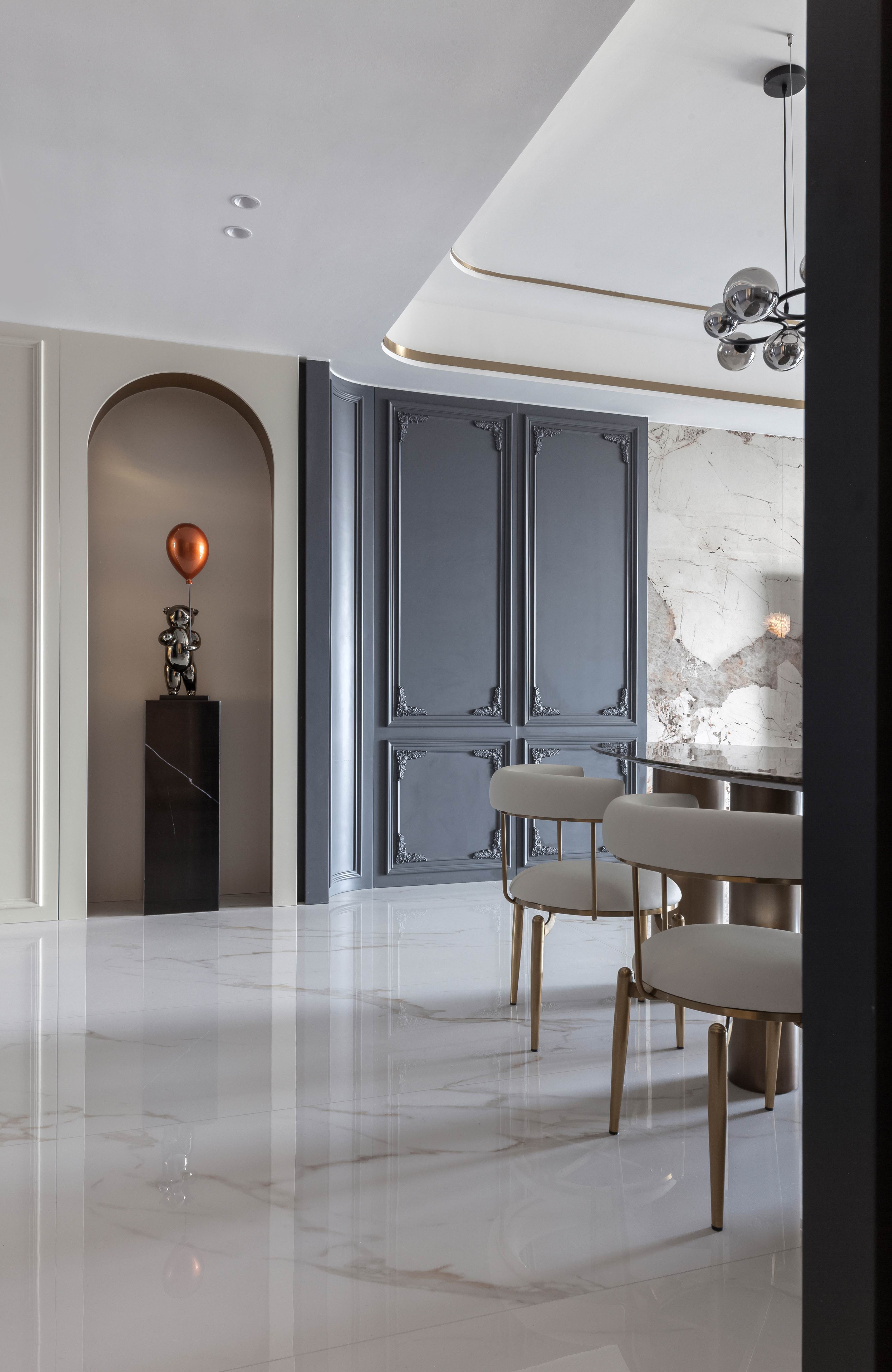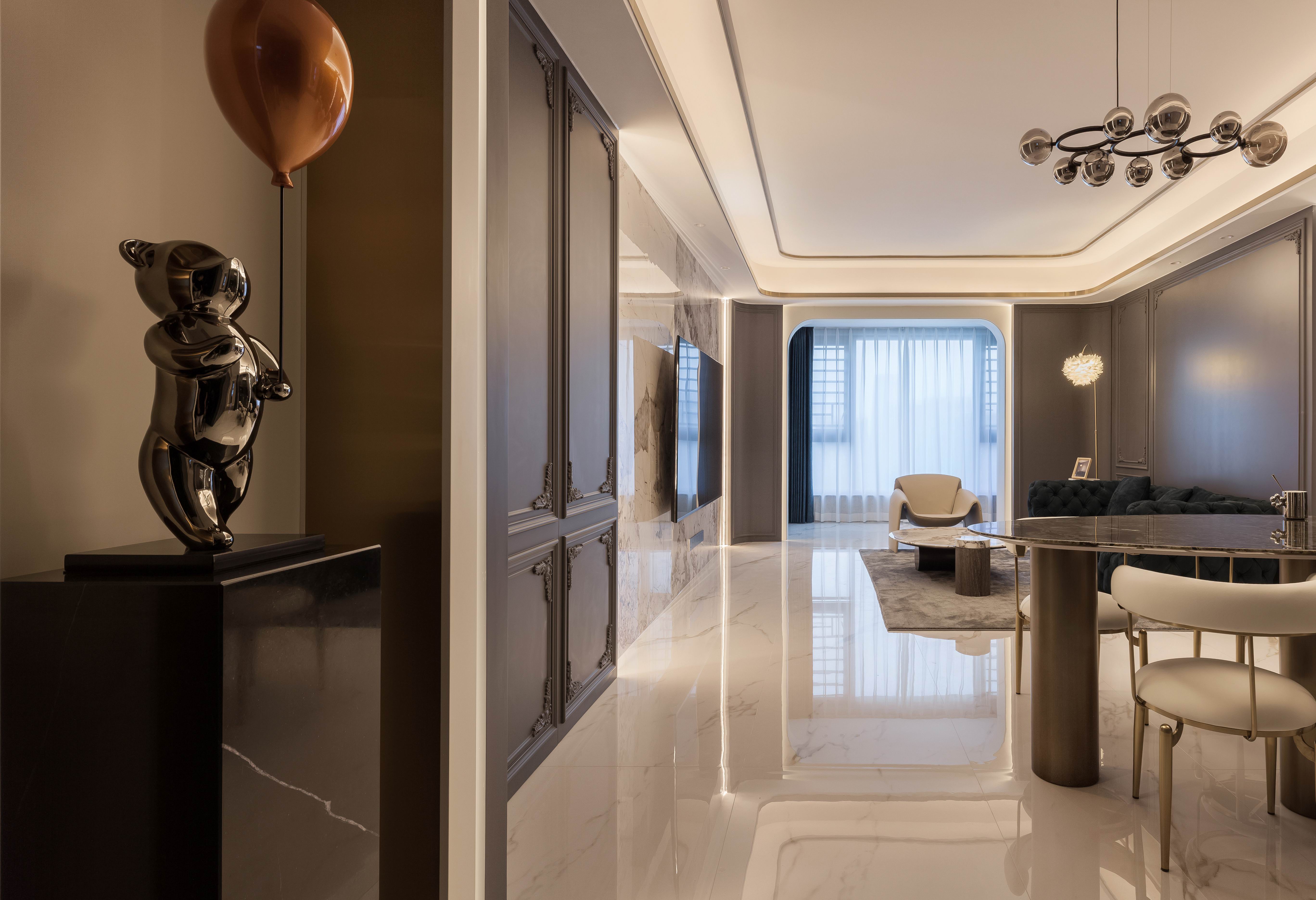 项目定位:本案不同以往的风格思路,业主想要高级感的氛围,所以从法式线条墙板与现代艺术造型做个混搭穿越