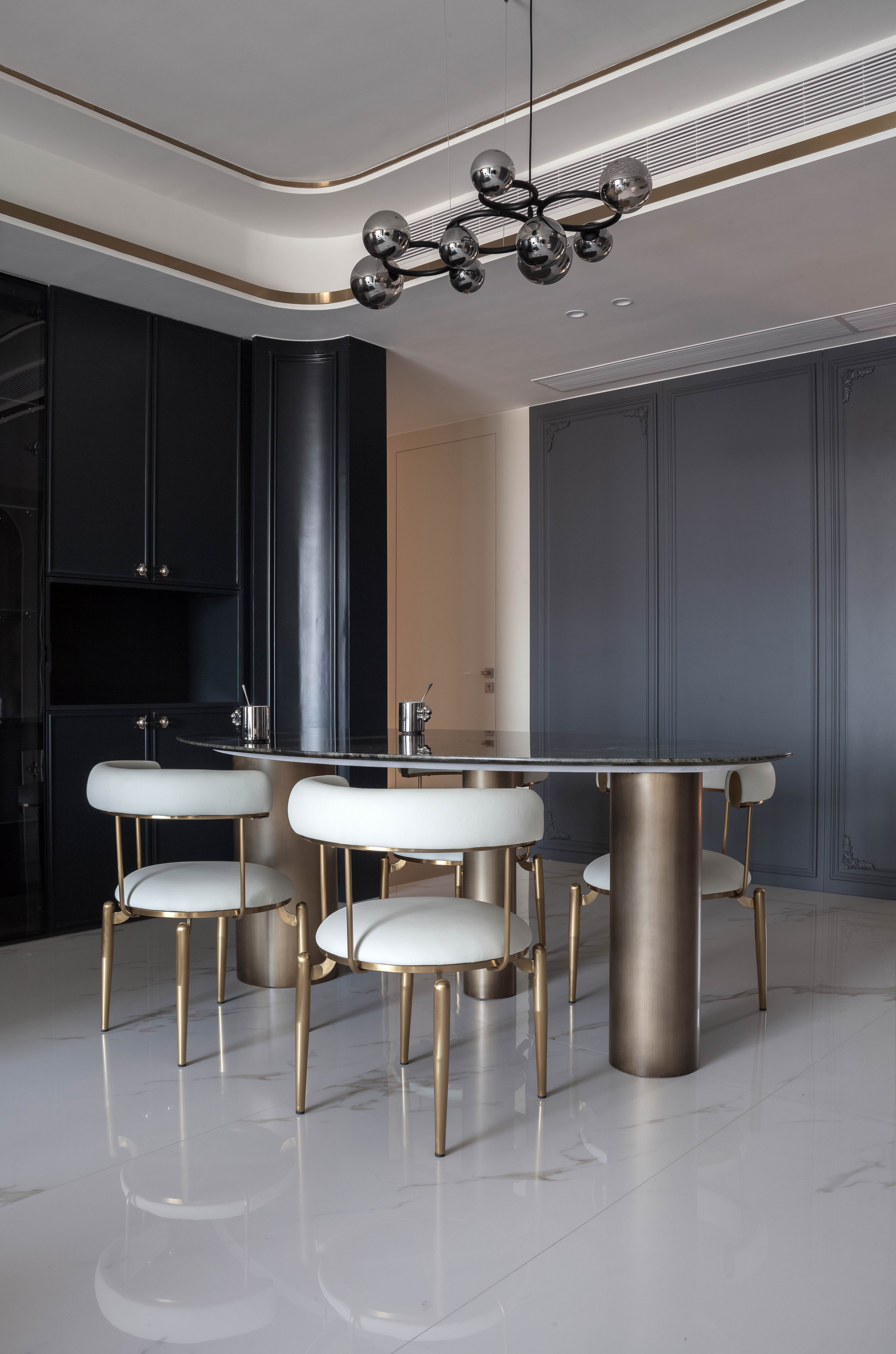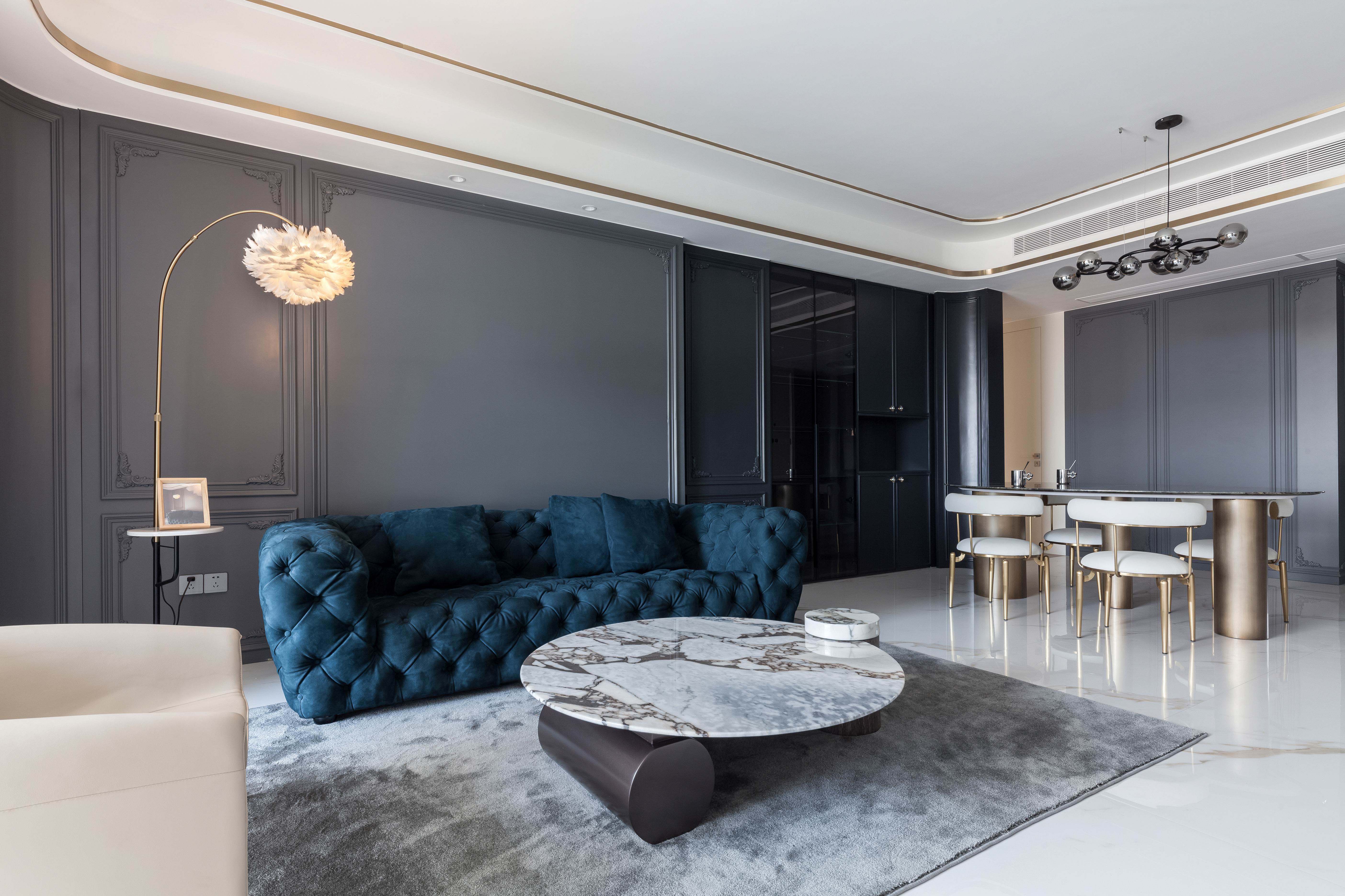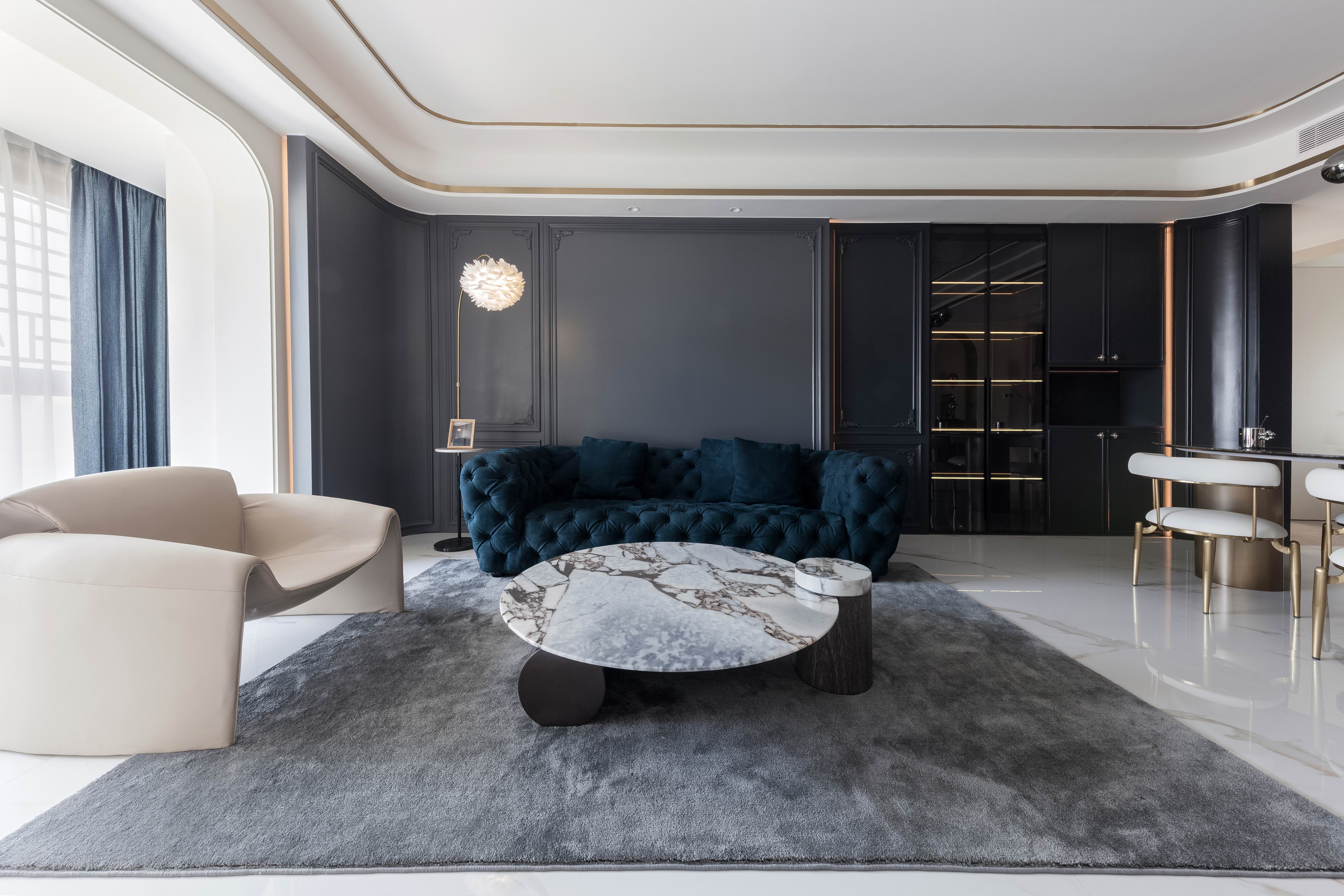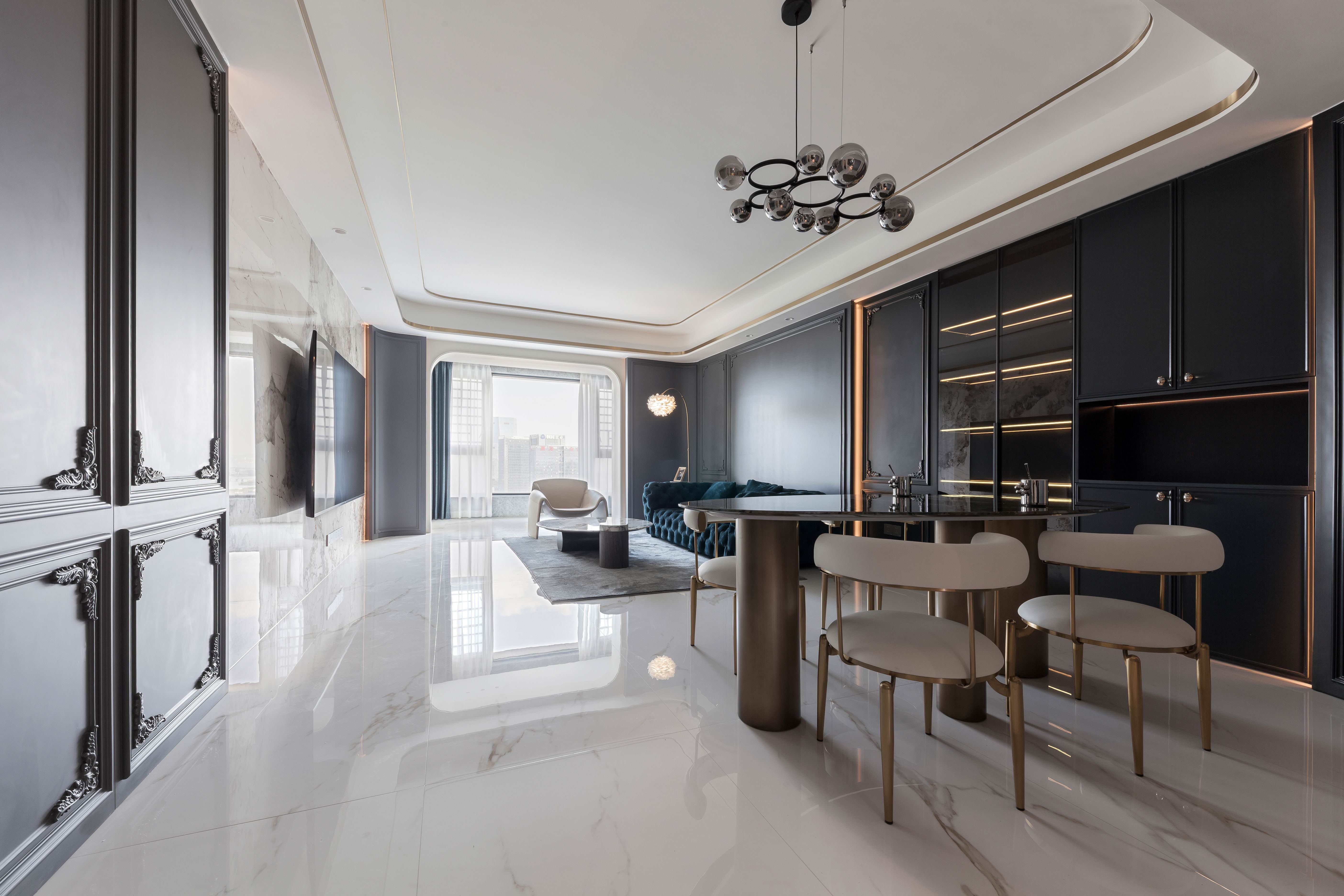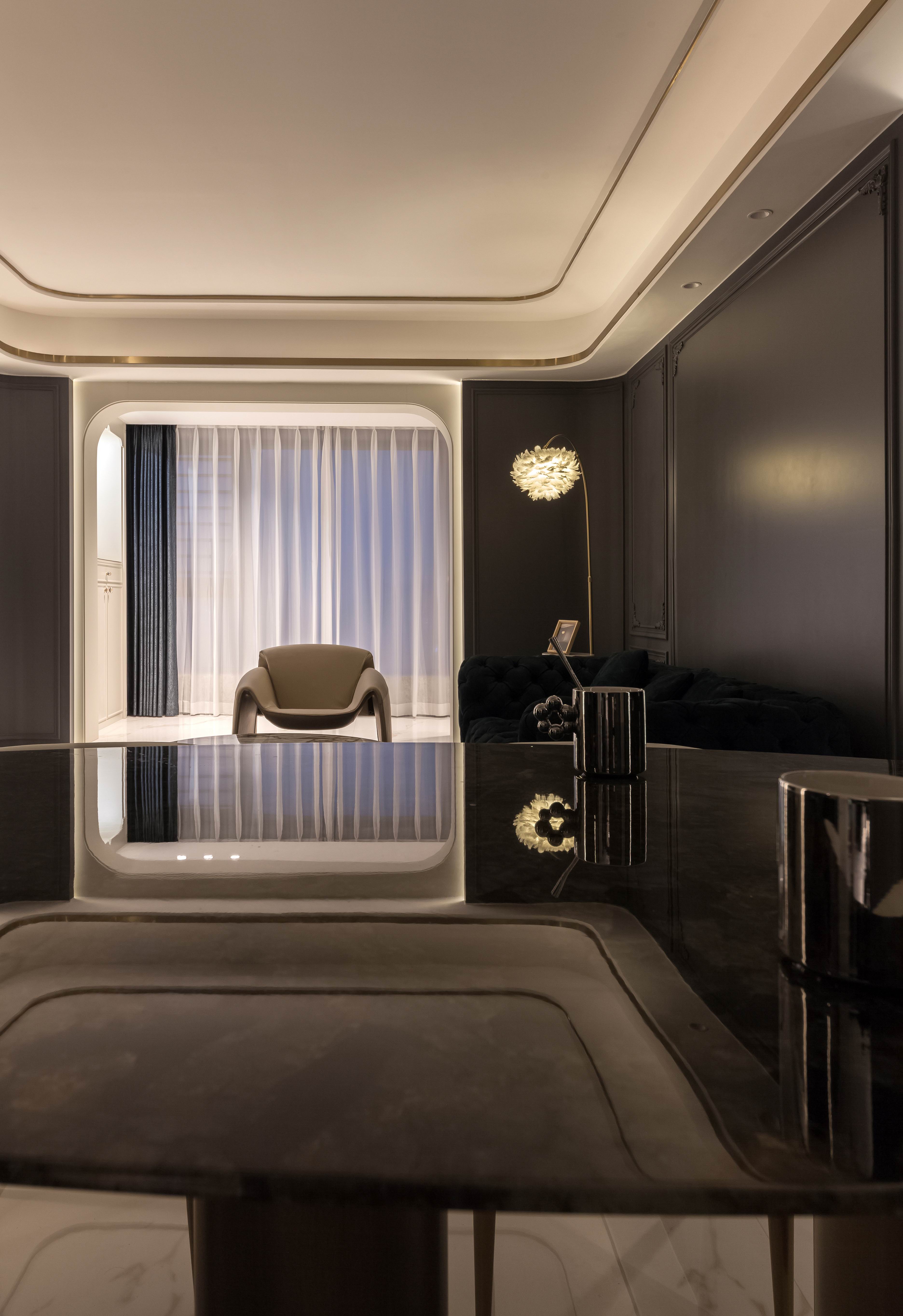 项目定位:本案不同以往的风格思路,业主想要高级感的氛围,所以从法式线条墙板与现代艺术造型做个混搭穿越