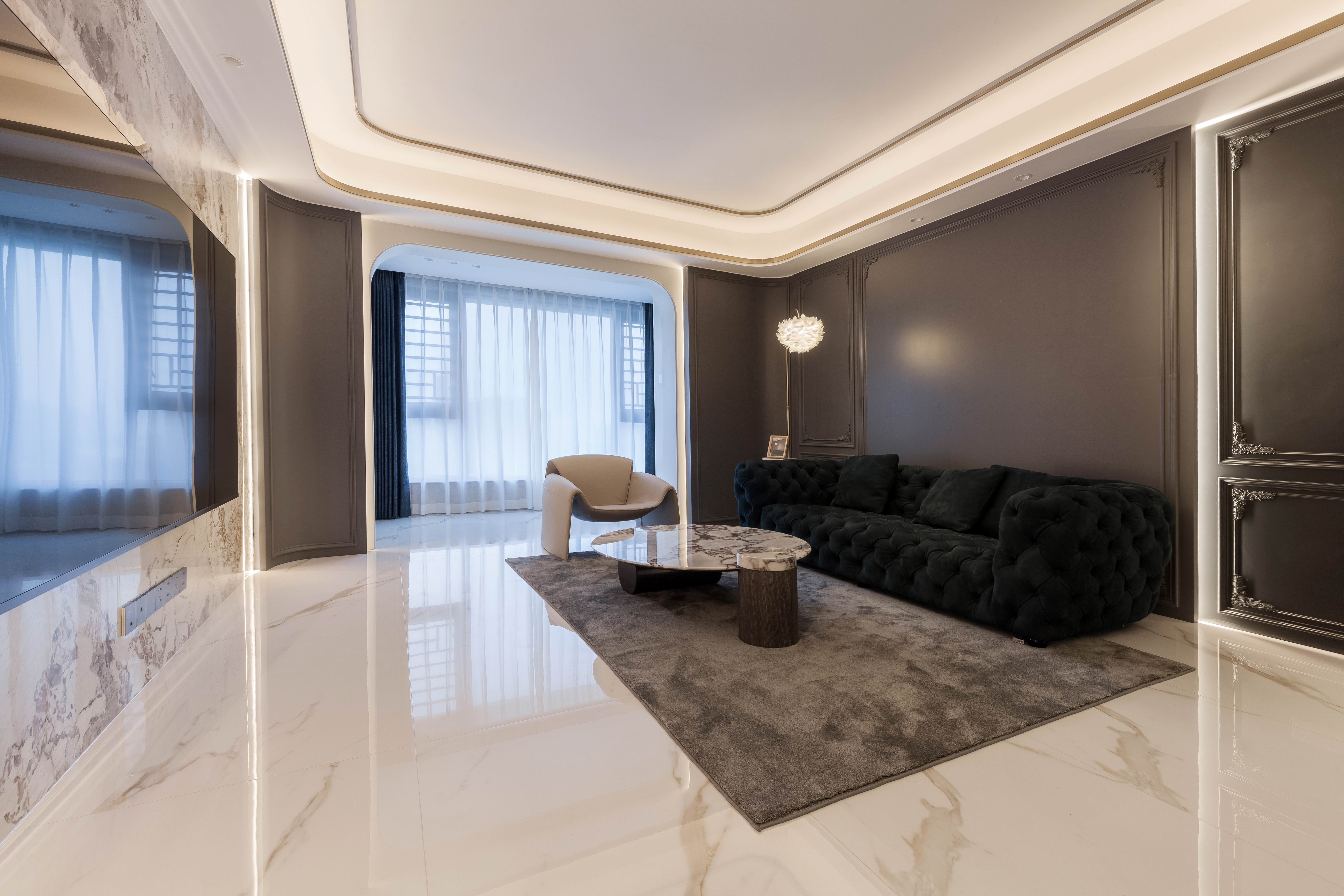 空间布局:把传统的欧式线条改为深色,整个客厅让其增加高级灰与岩板的碰撞,过道空间与客厅拉开层次,现代艺术与欧式的结合,韵味十足。空间的连动布置,吊顶与墙面,比例线条与层次,都是相互关联和计算出来的.