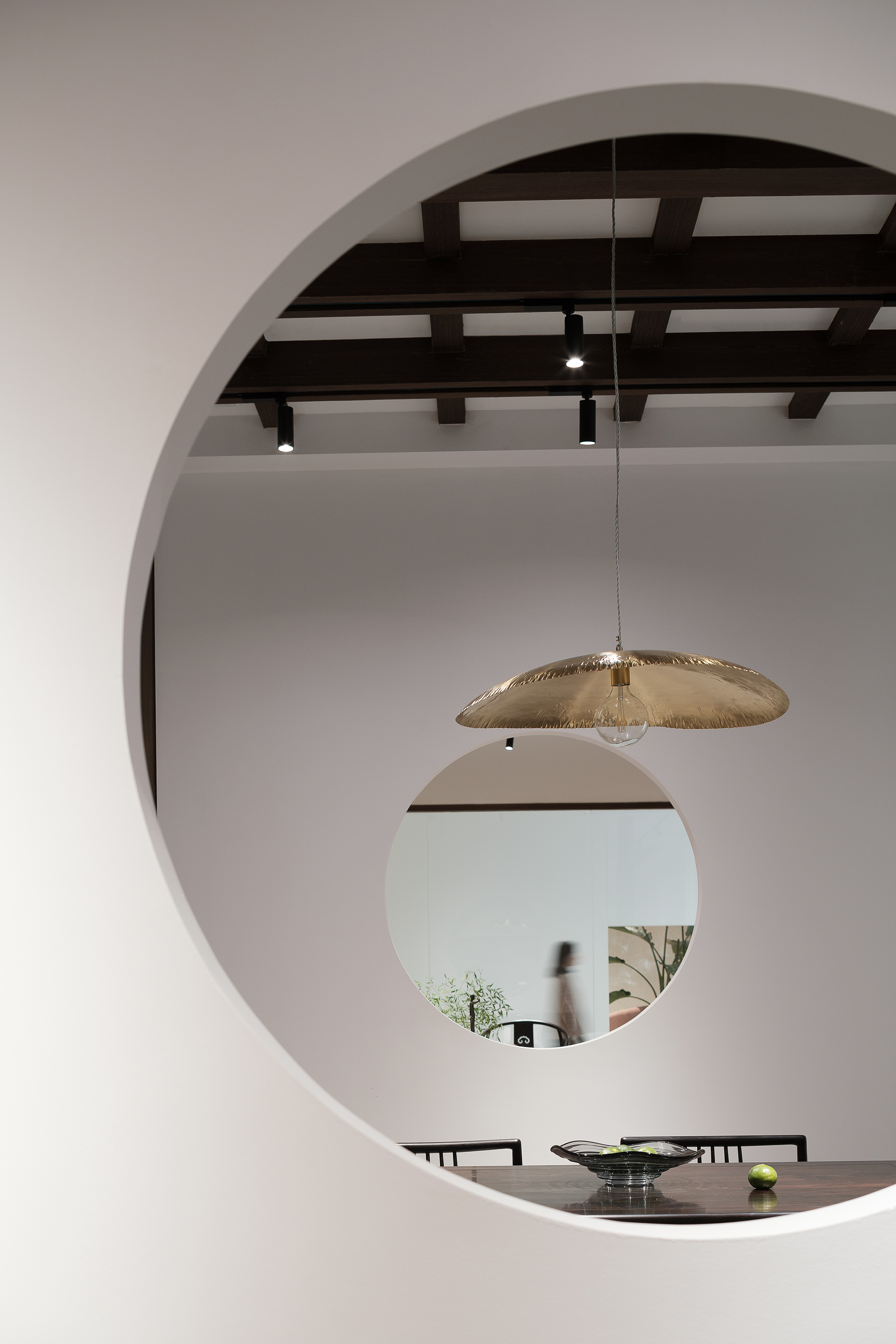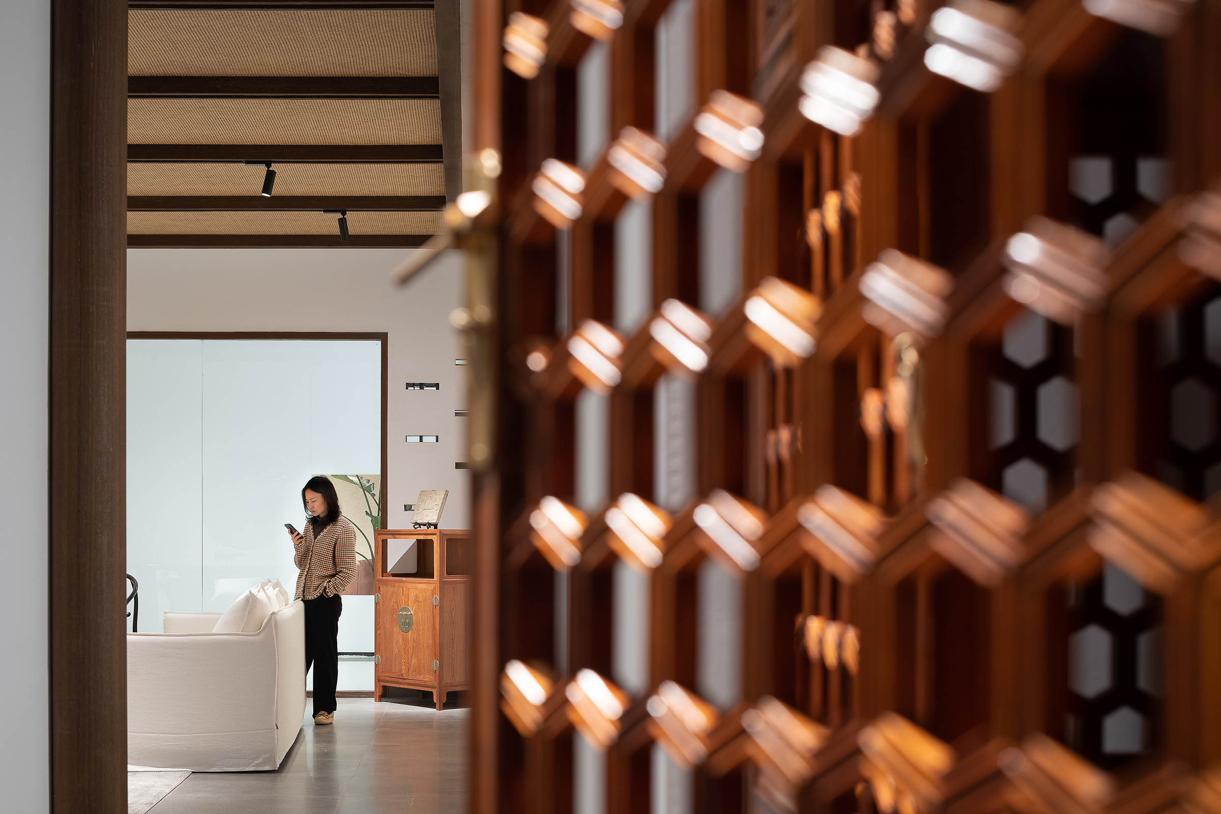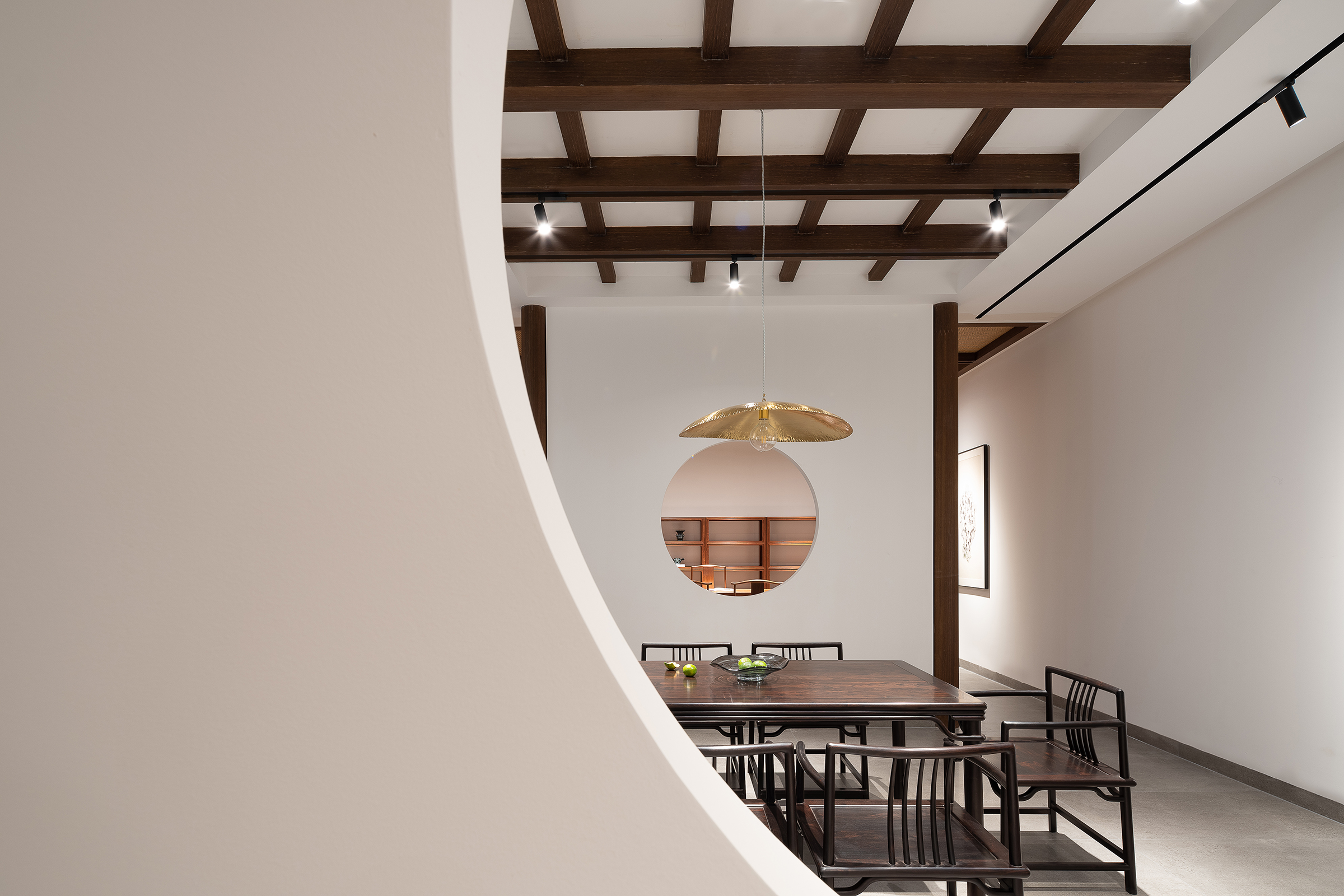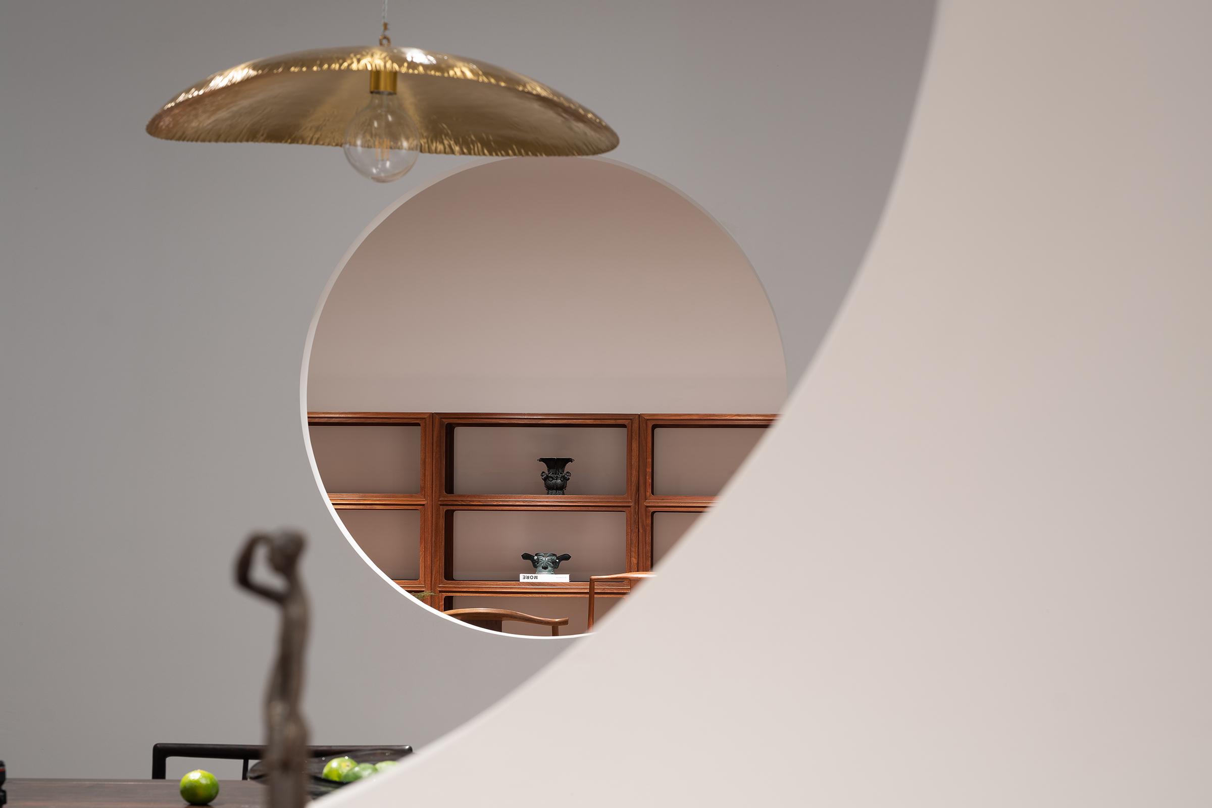 空间意境:设计由这一理念出发,将苏作工艺的传统美学,方与圆的东方元素,写入空间装置,与当代材质和表现手法,实现传统美学和现代审美的共存。