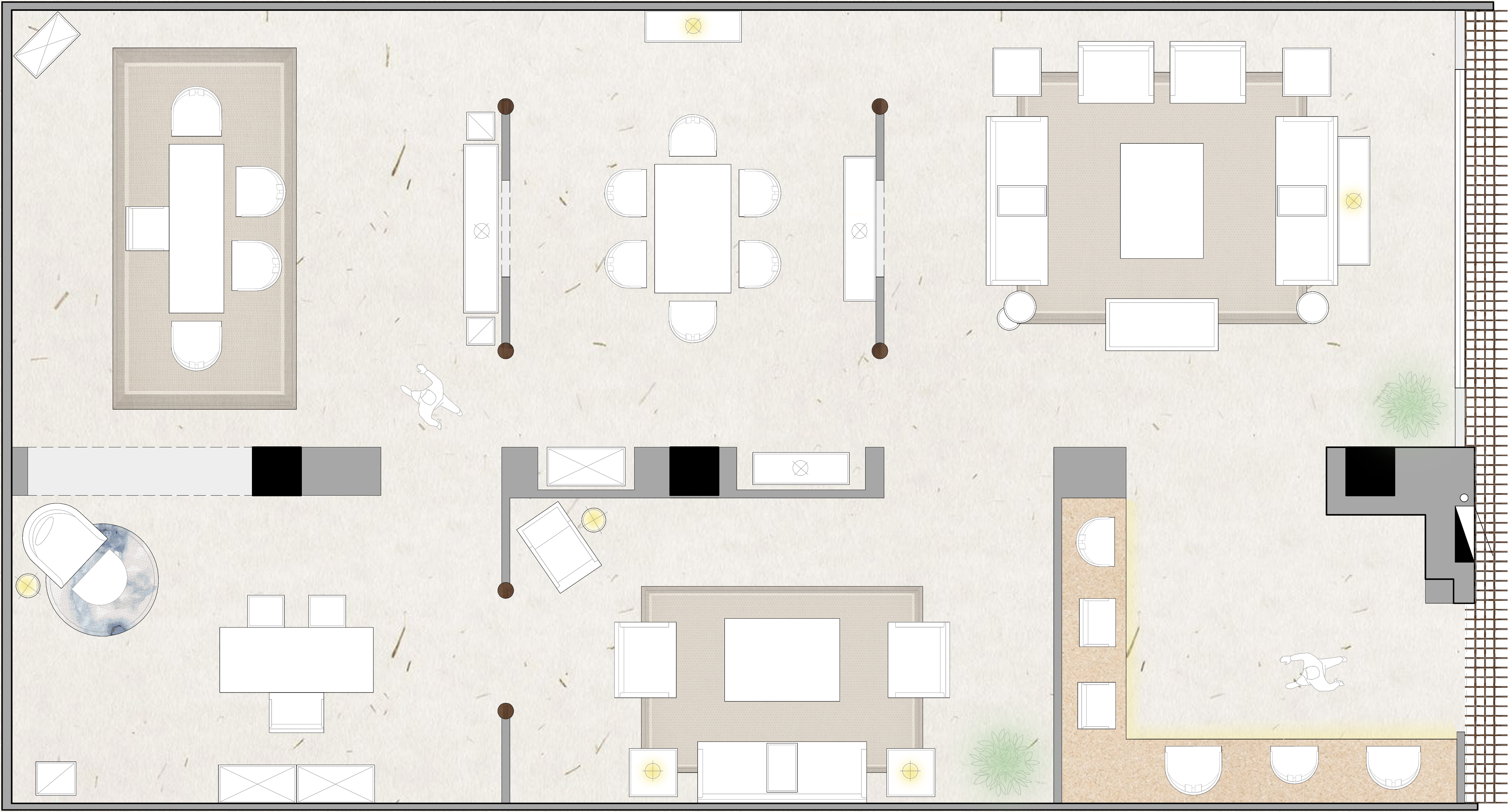 空间布局:店铺外立面由一个榫卯拼接的巨大装置包裹而成,完全无钉的结构响应了红木家具榫卯拼接的工艺特点,凹凸渐变,以形写意。它既是创意之装置,更是链接之媒介,将室内与室外空间完美的架接。