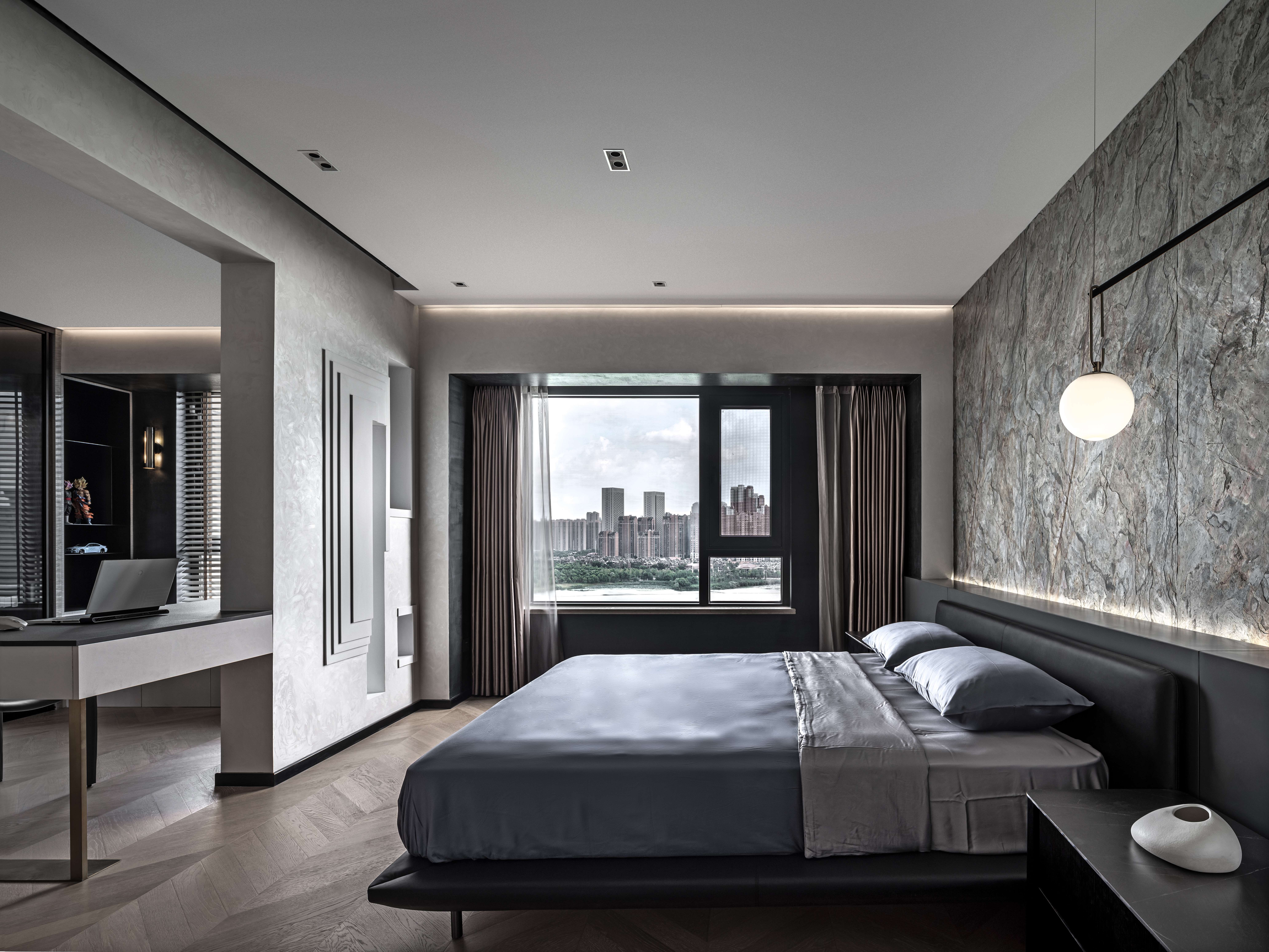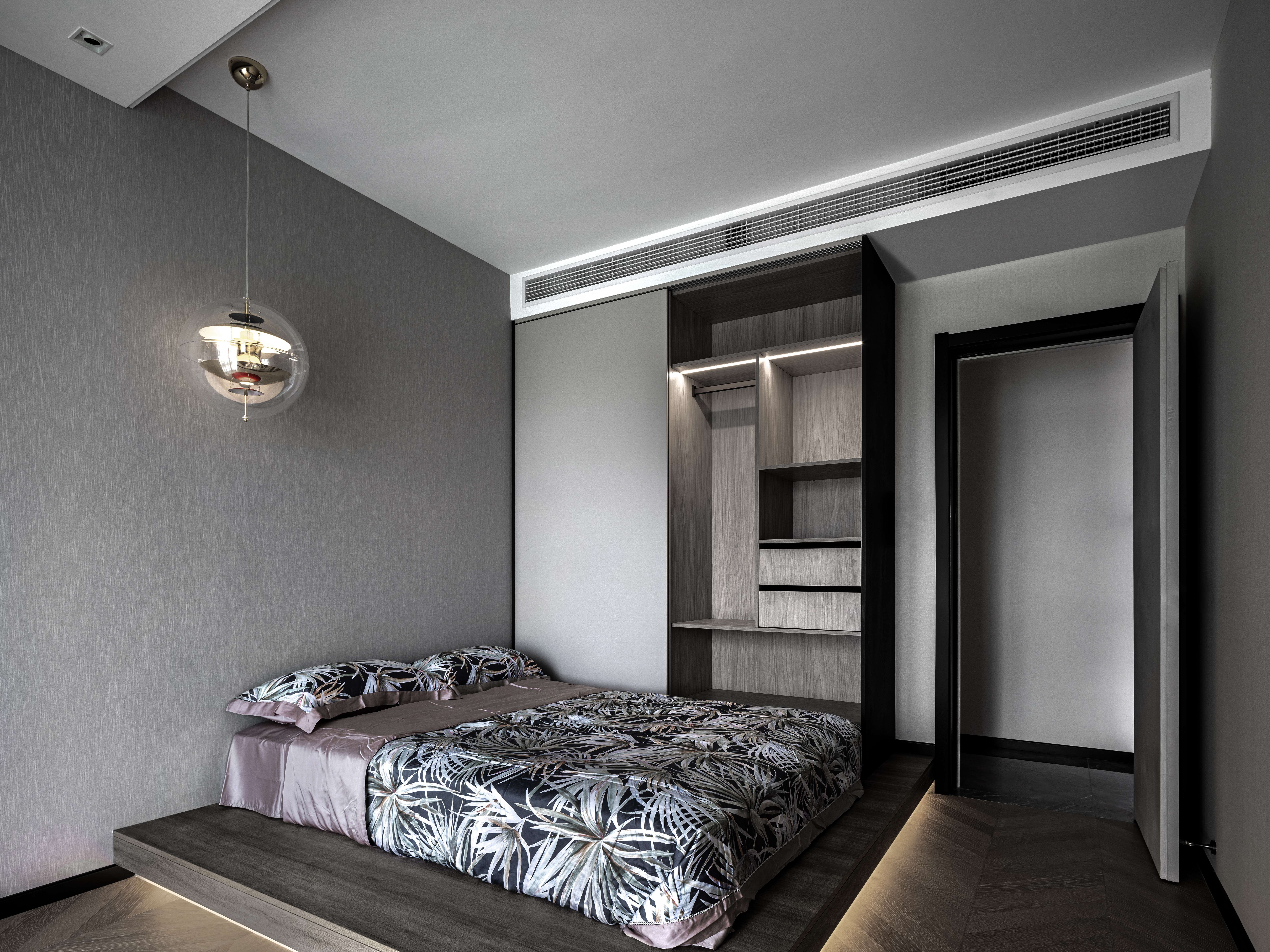 次卧延续空间的整体风格,纯净的灰色墙面和带有设计感的木纹展柜有一丝微妙的对比,圆形吊灯中和了卧室的硬朗,床下自动感应的灯带让空间的氛围感满满,简约而不简单。