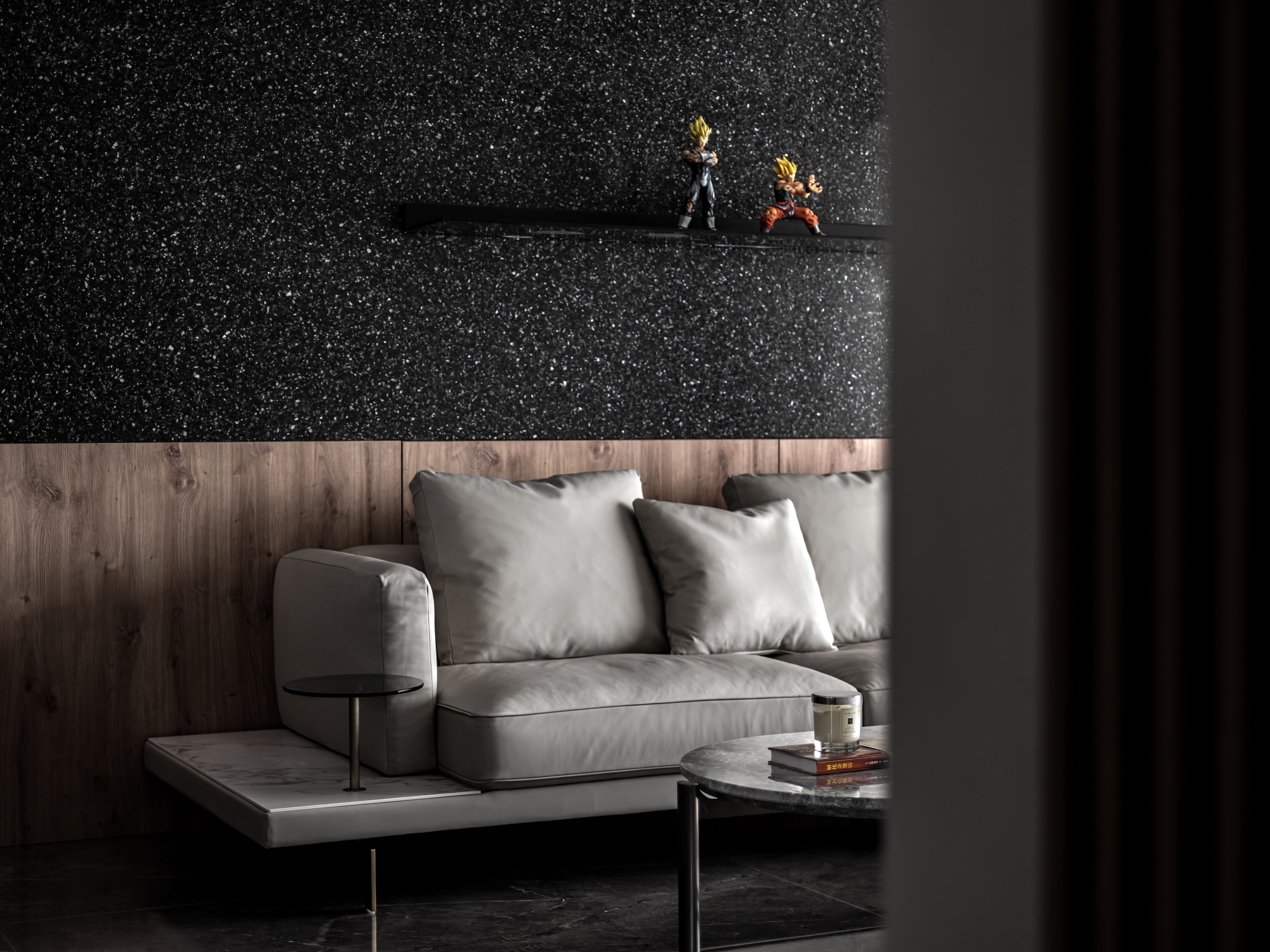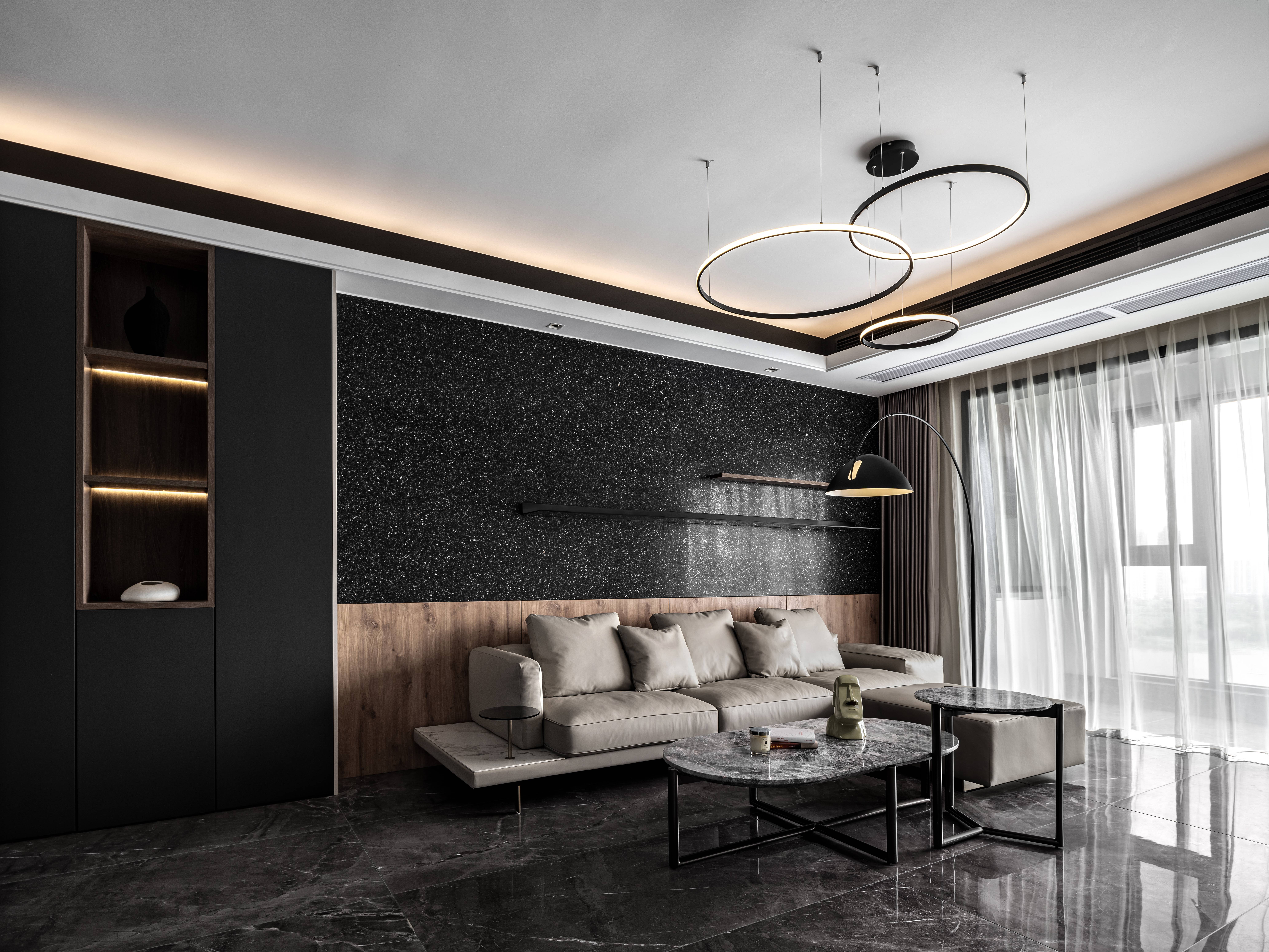 沙发背景墙由原木半墙+黑色水磨石组成,层次感丰富又与电视背景底色相呼应,让空间感更整体。