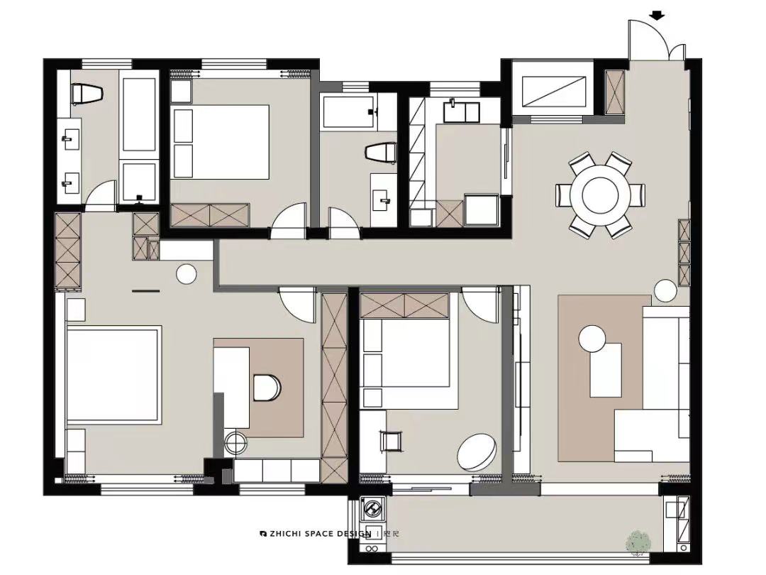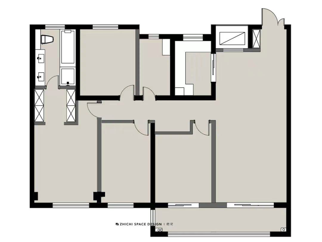 项目定位:精装房改造项目在大部分情况下原始的装修是让业主和设计师都很头疼的点,原始的固定布局与居住者生活需求的冲突也需要通过改造来达到一个较为满意的效果。此方案在保留原始厨卫的情况下满足业主的生活需求--主卧套房、儿卧、次卧,给每个空间在前期就做好准确的定位有利于提高长期居住的舒适。因为是年轻一代的小两口居住,考虑到后期孩子出生,父母带娃的情况,在满足主卧改成套房后足够舒适的情况下另外将两间卧室定位为儿卧及次卧。通透开阔的客餐厅也满足年轻一代人对家的期望,此楼盘优越的窗景也提升了整个空间的质感。