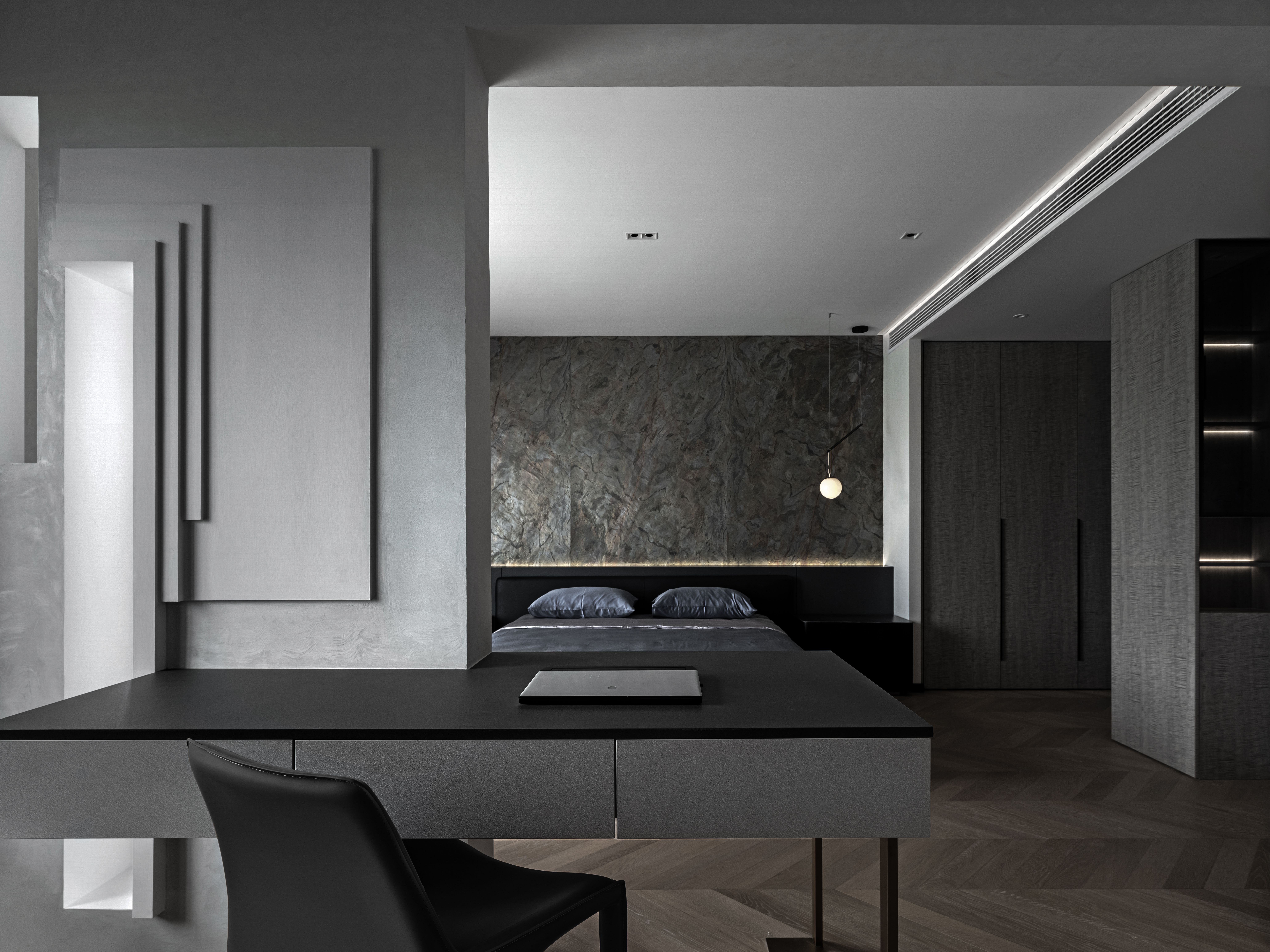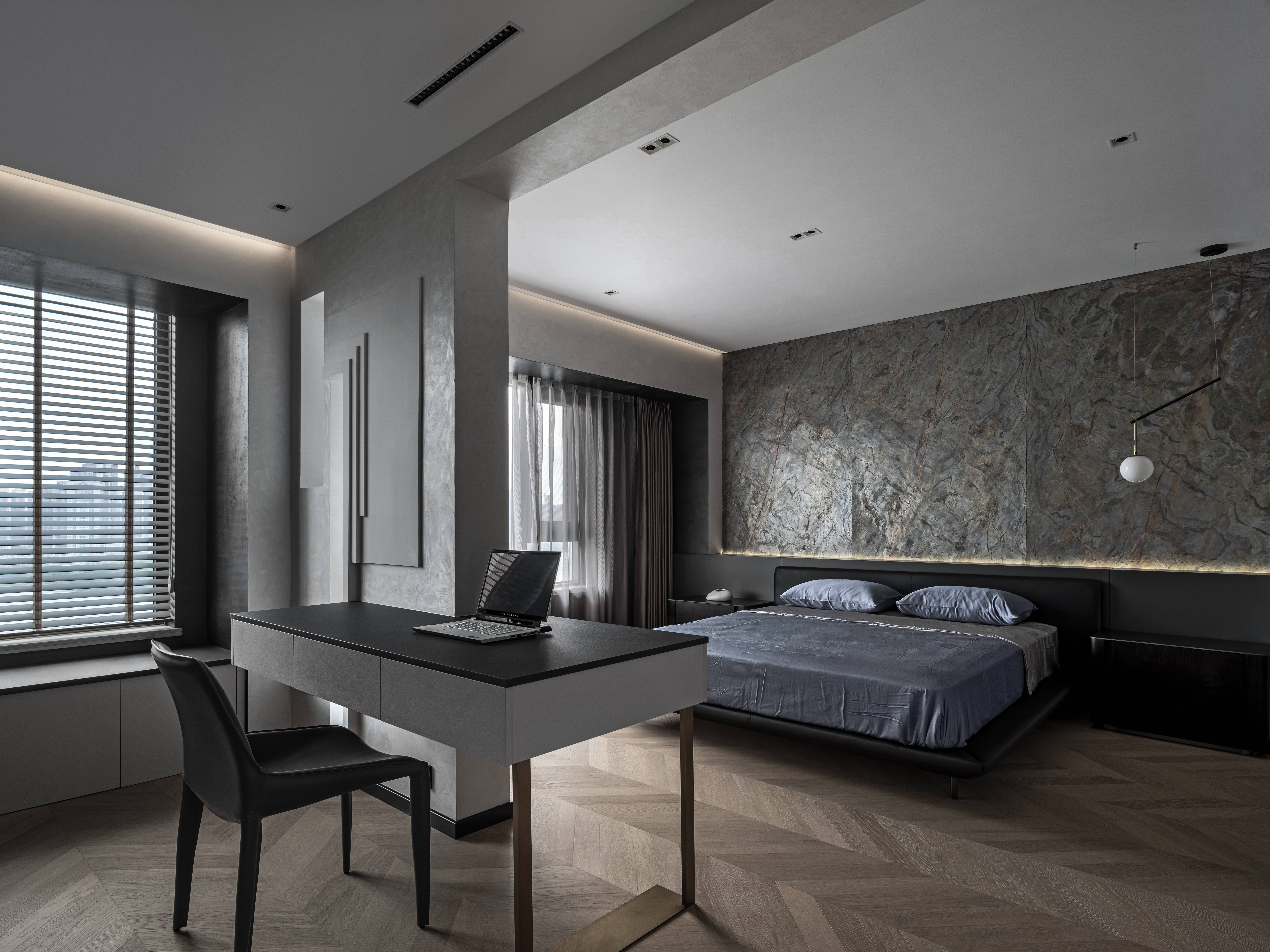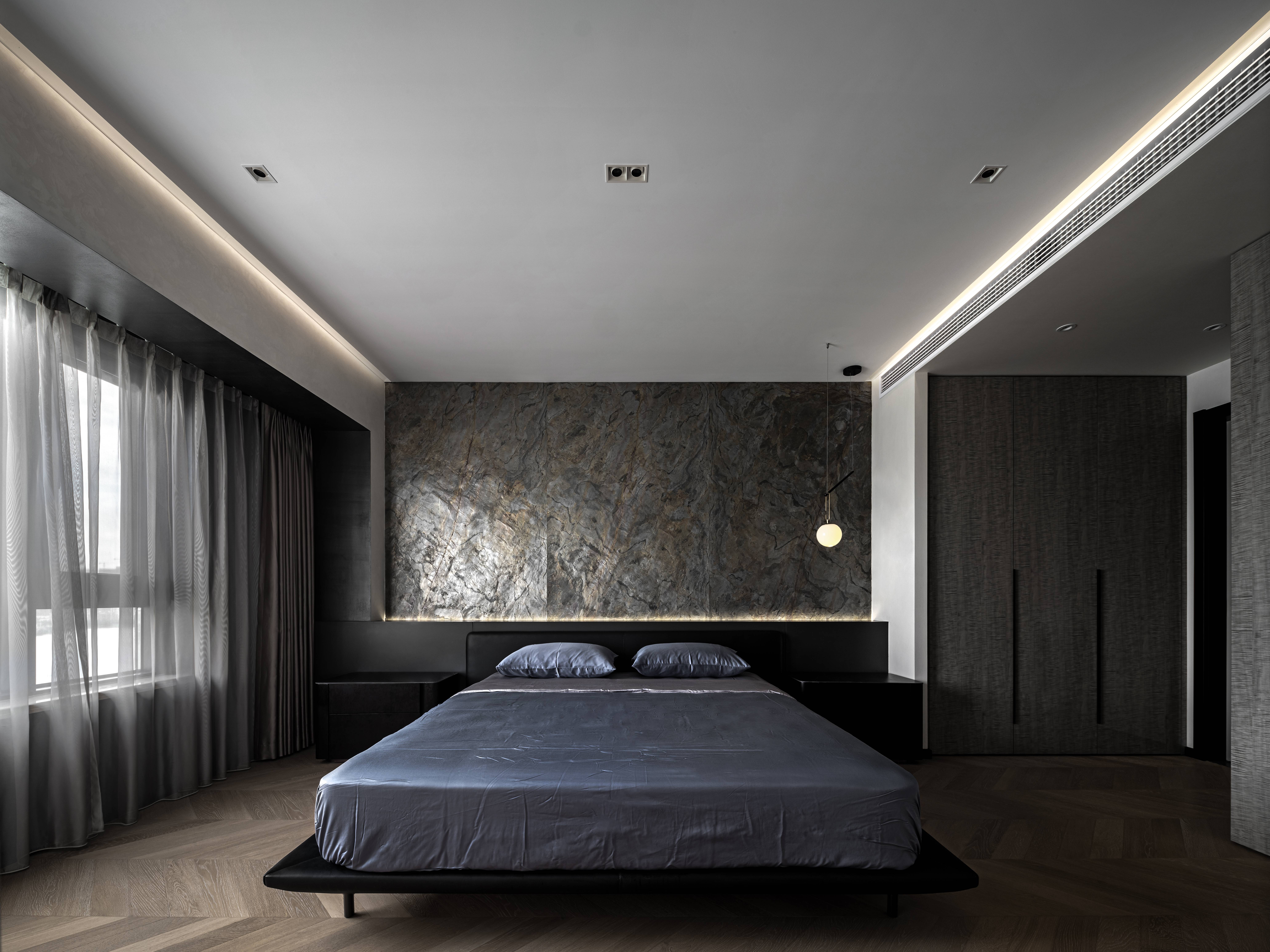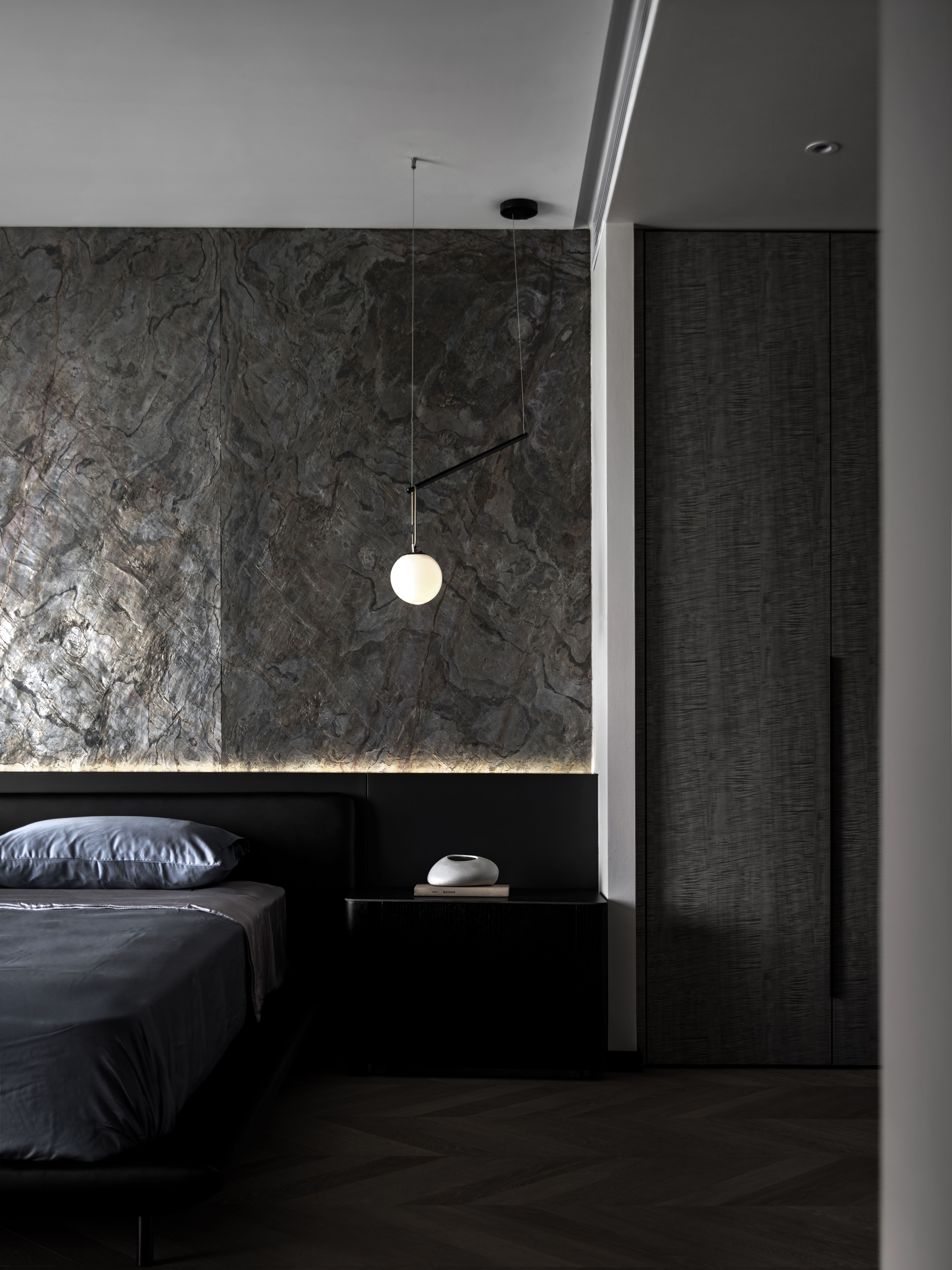 黑色半墙与超薄石材融为一体,超薄柔性石材的自然纹理质感满分,细腻中的粗犷,柔和的橡木色地板,绵软的床品中和了屋内黑色的深沉,给卧室区域增添了一份温馨与淡然。