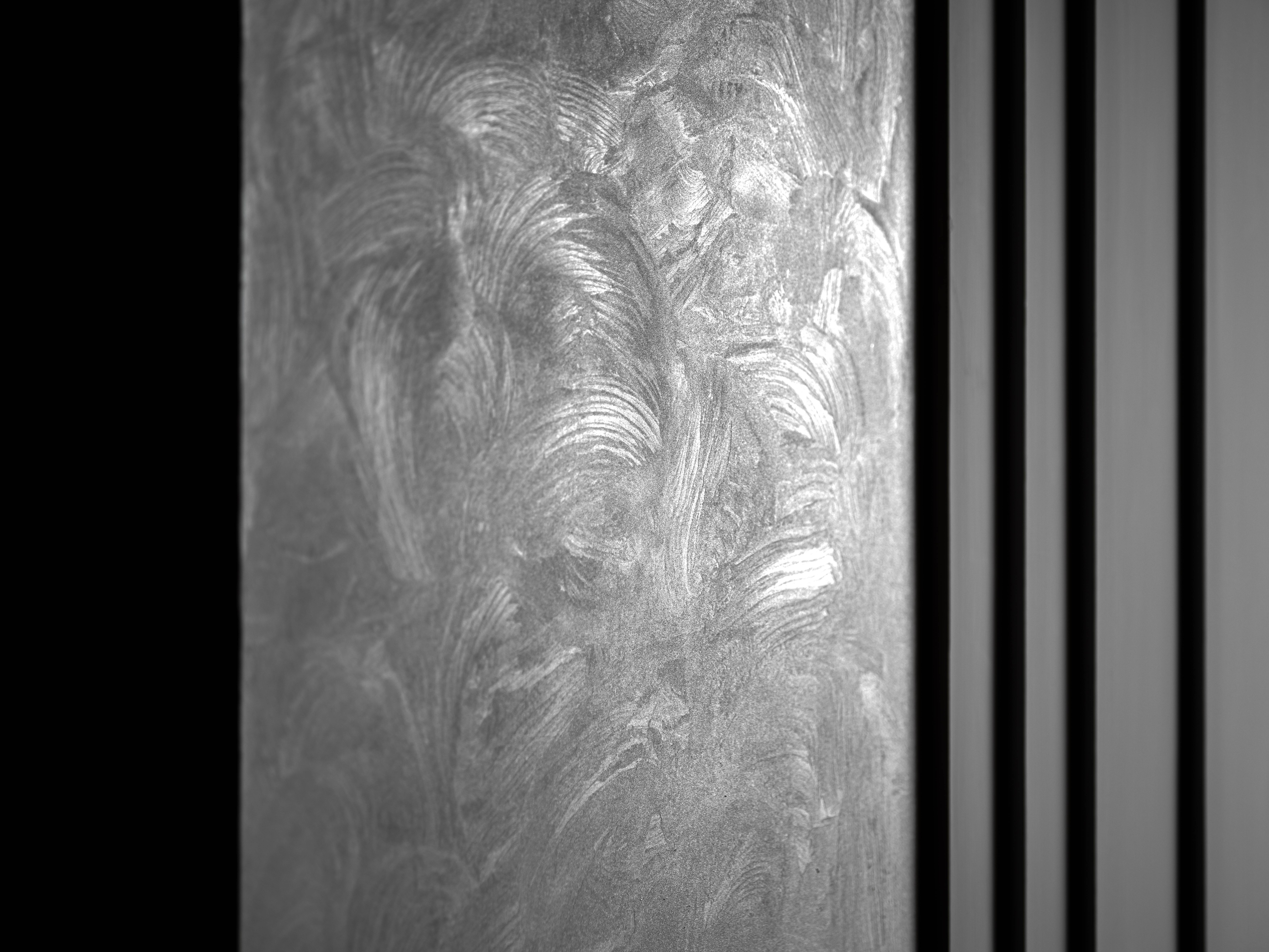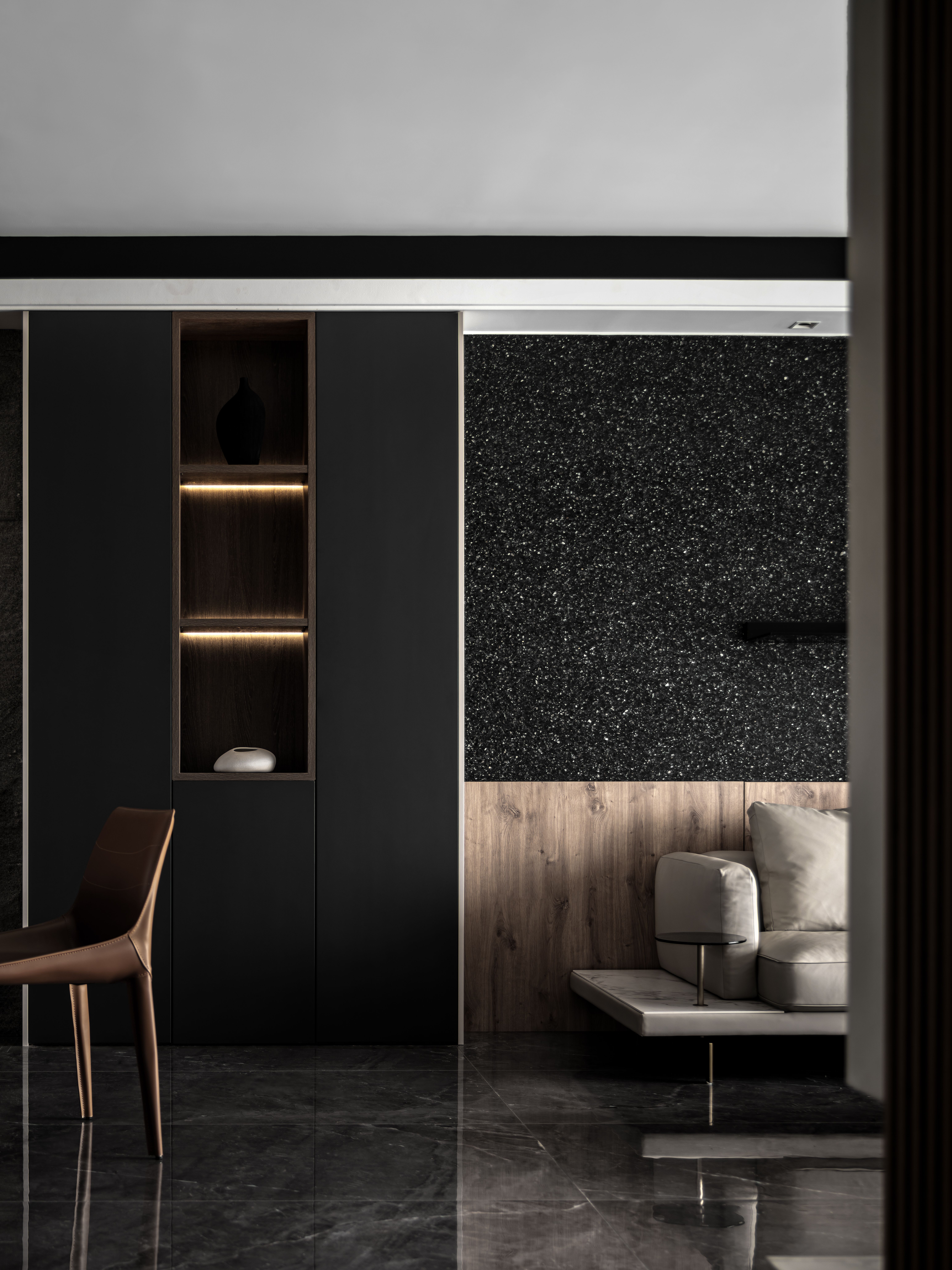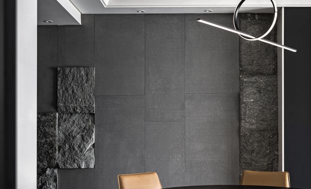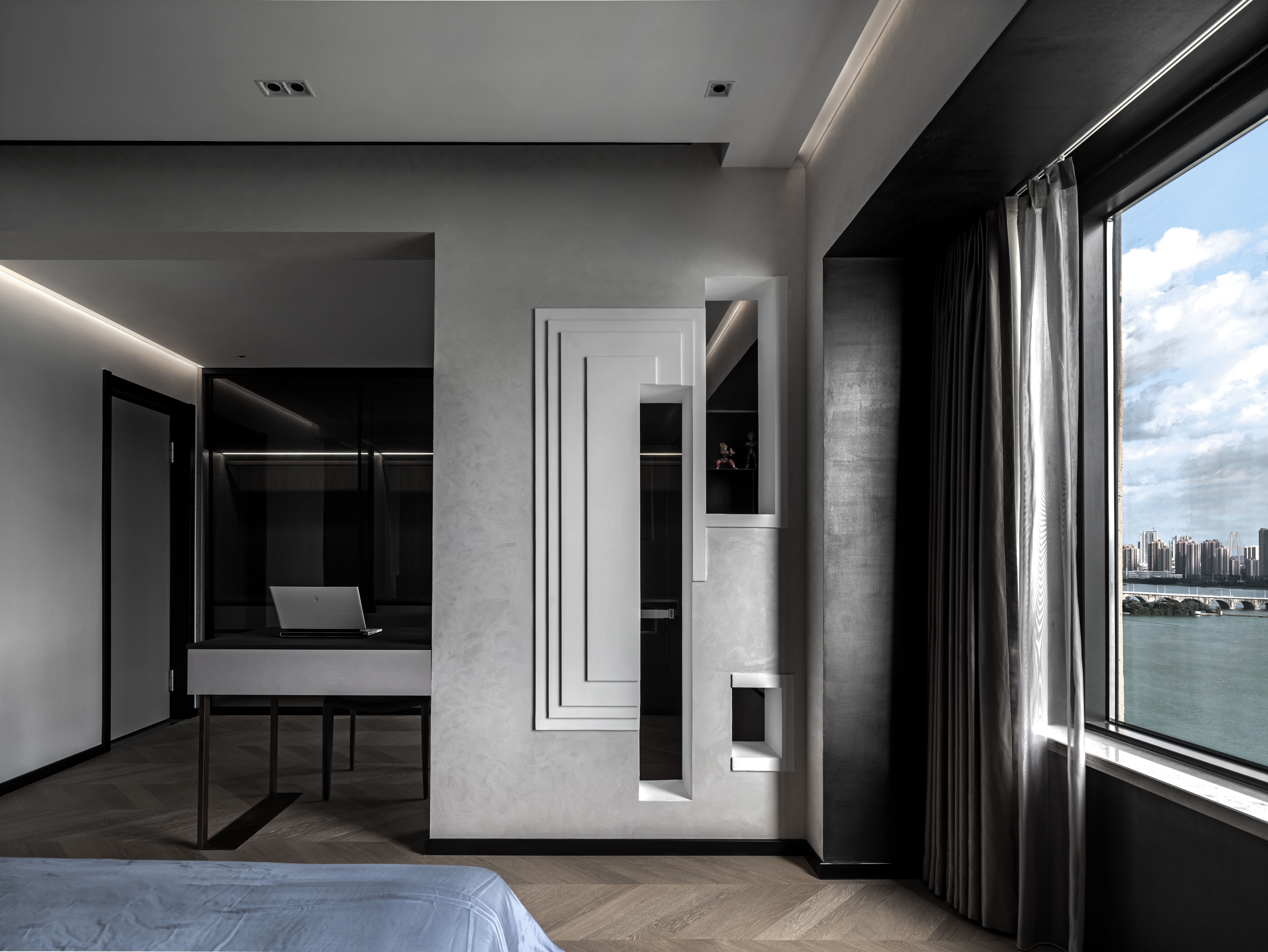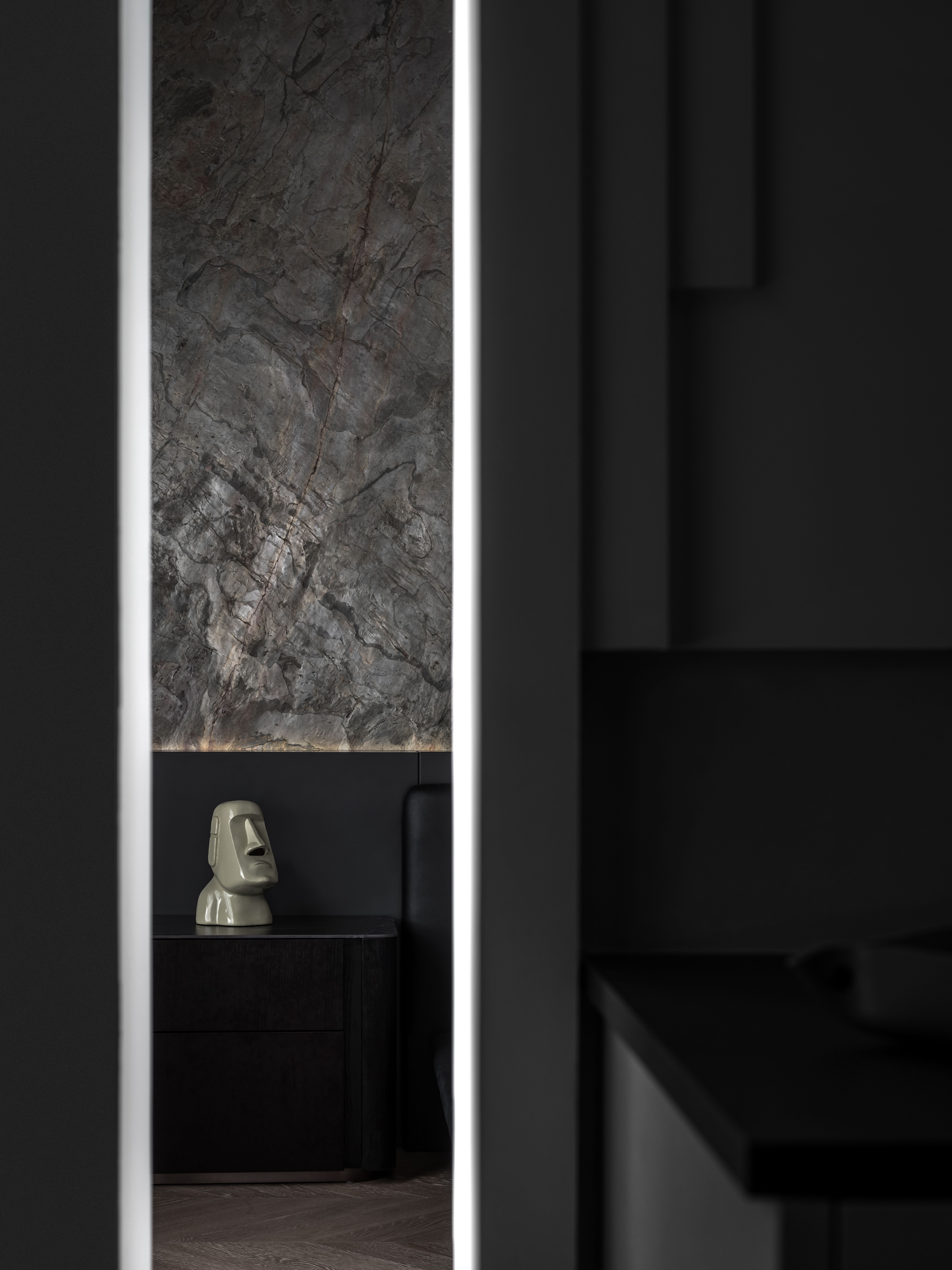 黑色半墙与超薄石材融为一体,超薄柔性石材的自然纹理质感满分,细腻中的粗犷,柔和的橡木色地板,绵软的床品中和了屋内黑色的深沉,给卧室区域增添了一份温馨与淡然。