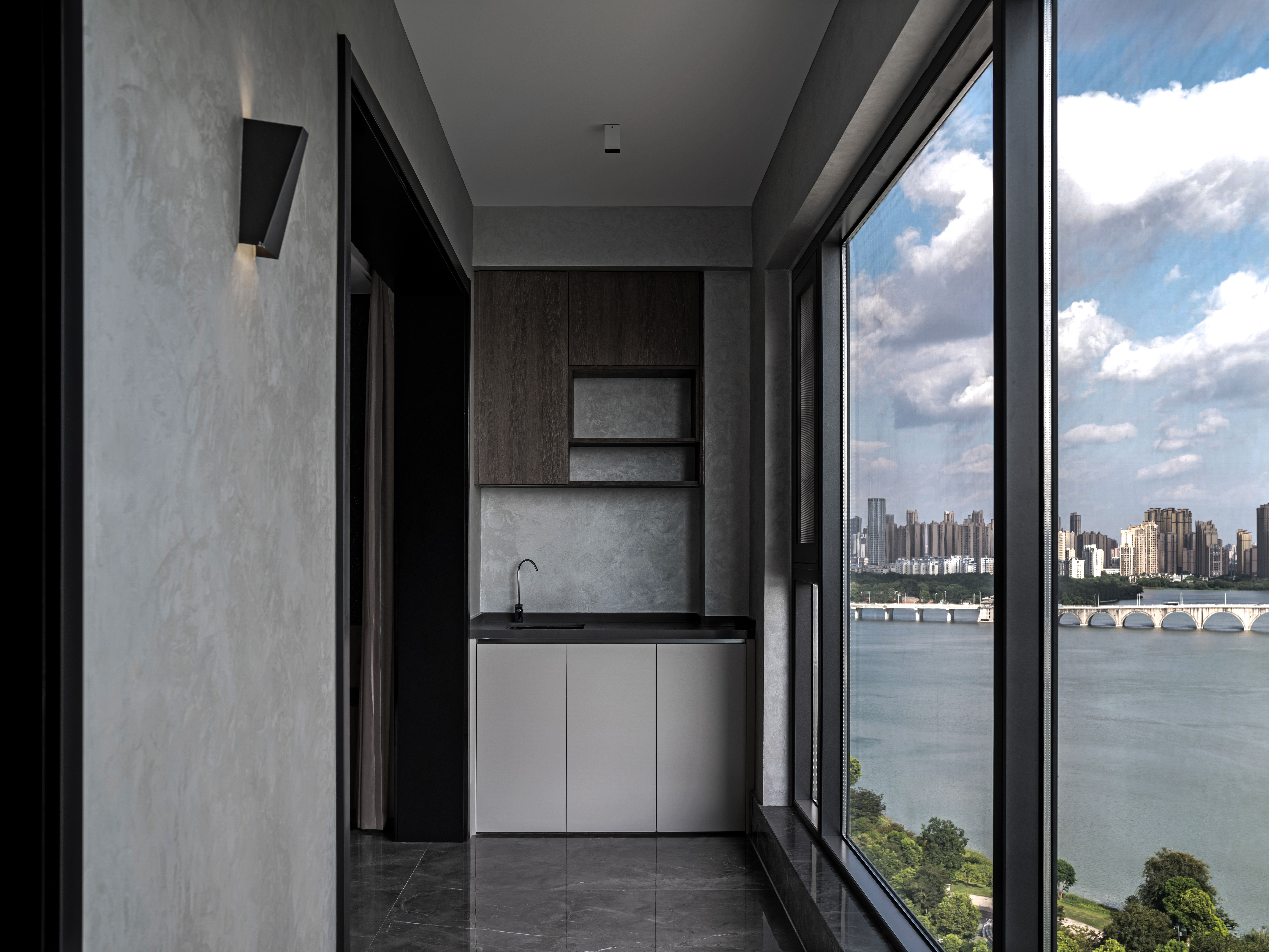 将自然与都市结合,阳台的大落地窗增强了室内空间与室外自然的沟通,缓解高层相对闭塞的通病,也有了细致与粗犷的反差为生活增添活力。