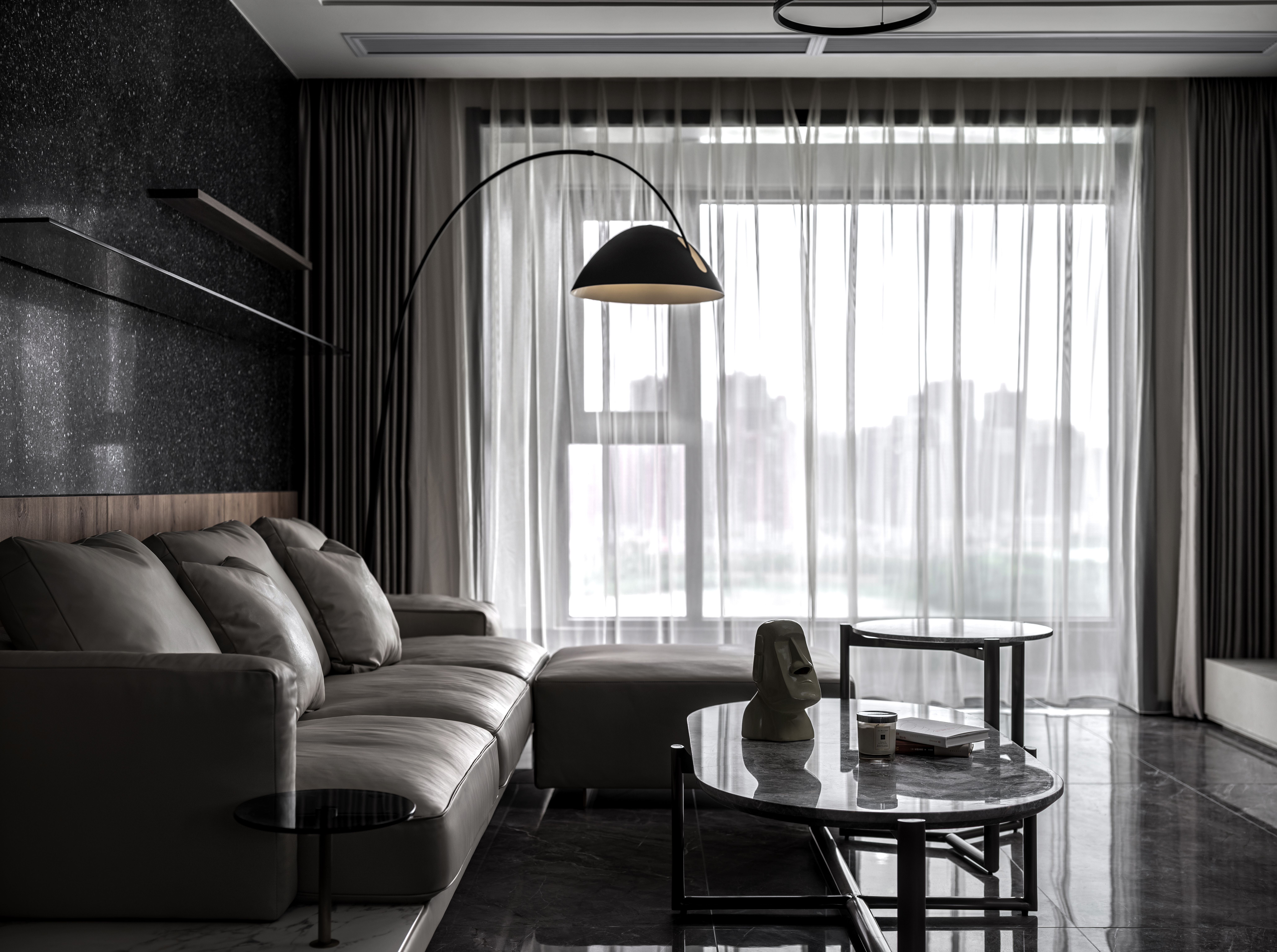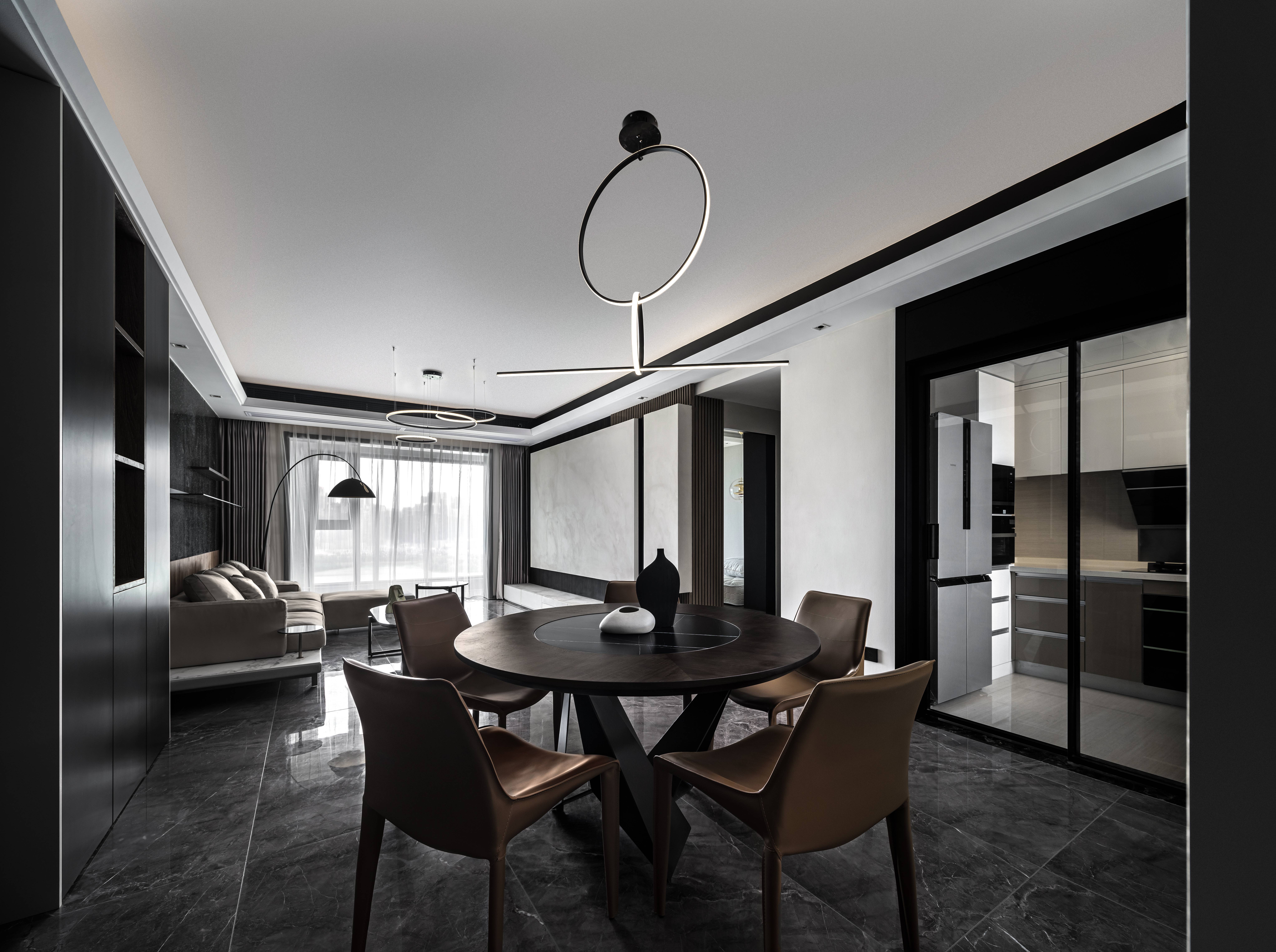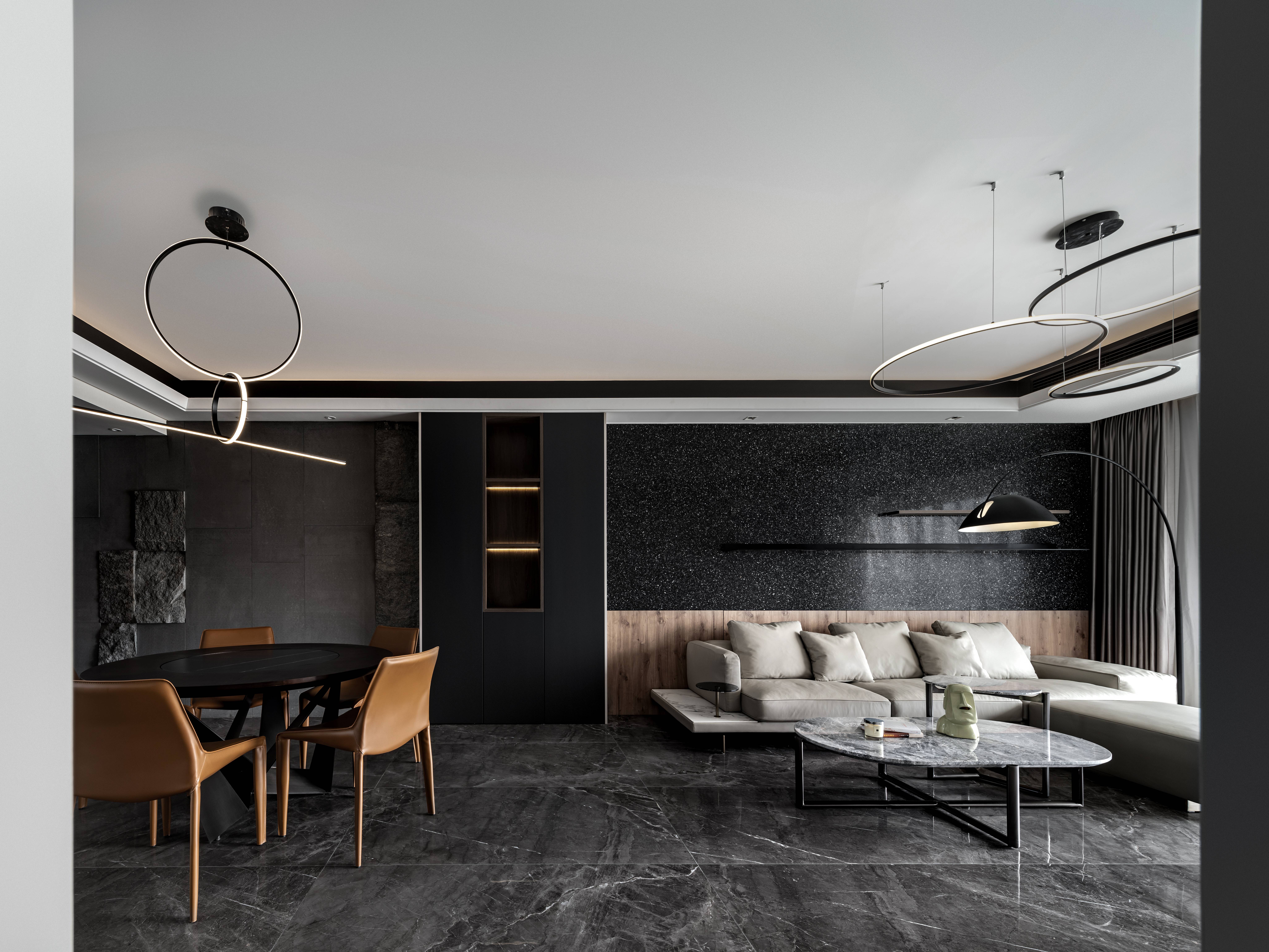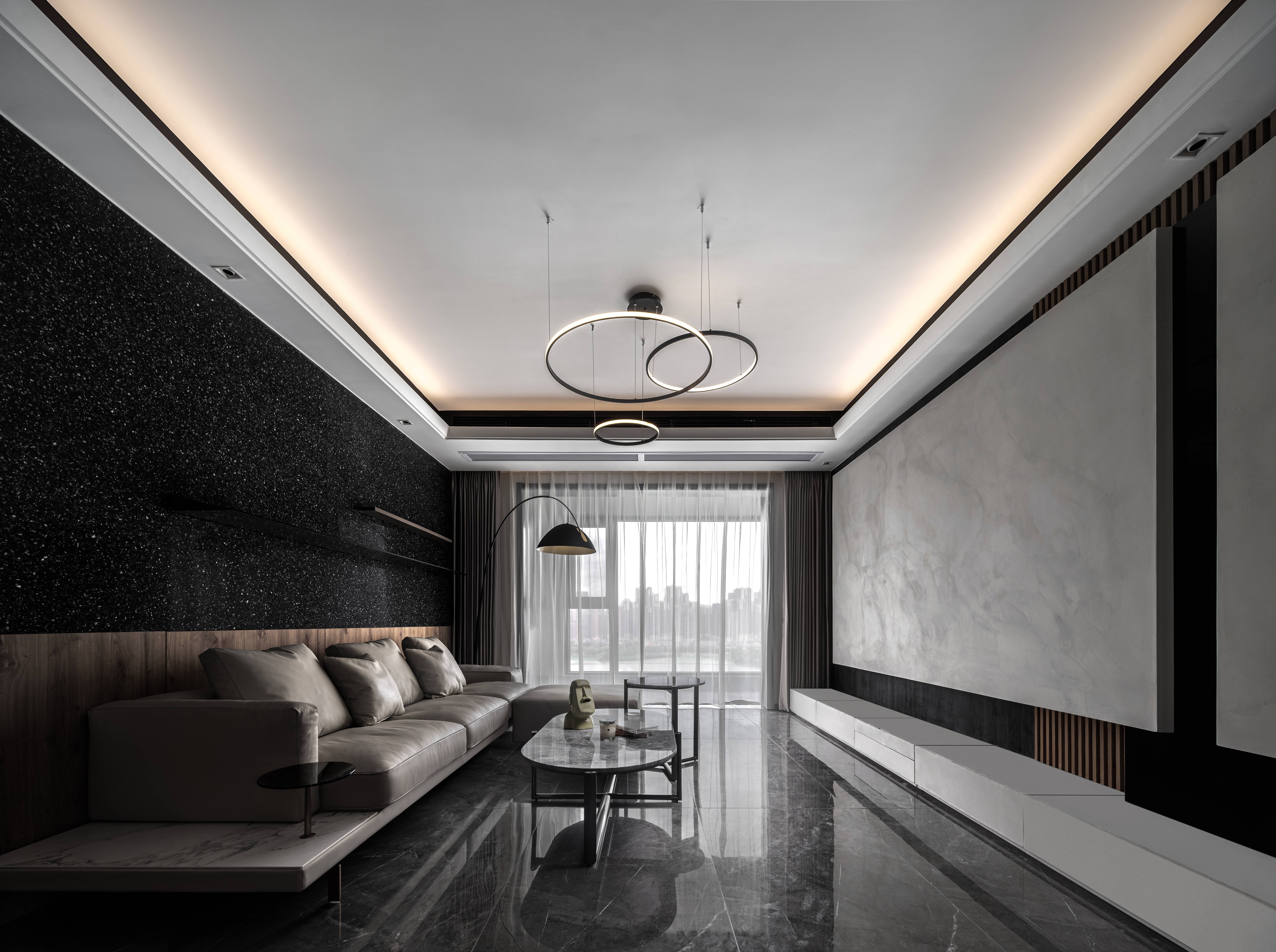 空间意境:业主自身的风格就是简约气质,偏爱深色和硬朗的线条感,希望自己的新家能在黑、白、灰的基调中展现独有的气质与风格。黑白灰这三种基调色都有各自不同的美。黑有各色的黑:大理石的纯净的黑、水磨石粗狂的黑、木板质感的黑、涂料细腻的黑;白也各色的白,全房大面温柔的乳白墙布,肌理感丰富的灰白涂料,吊顶大面的素白乳胶漆,这些个种种不同质感的黑白矫揉造作在一个空间再辅以中性的灰色来过度,让空间整体呈现出深沉的质感后在软装搭配上辅以暖色去柔和黑白灰的生硬,给这个家增添一分温馨与淡然。
