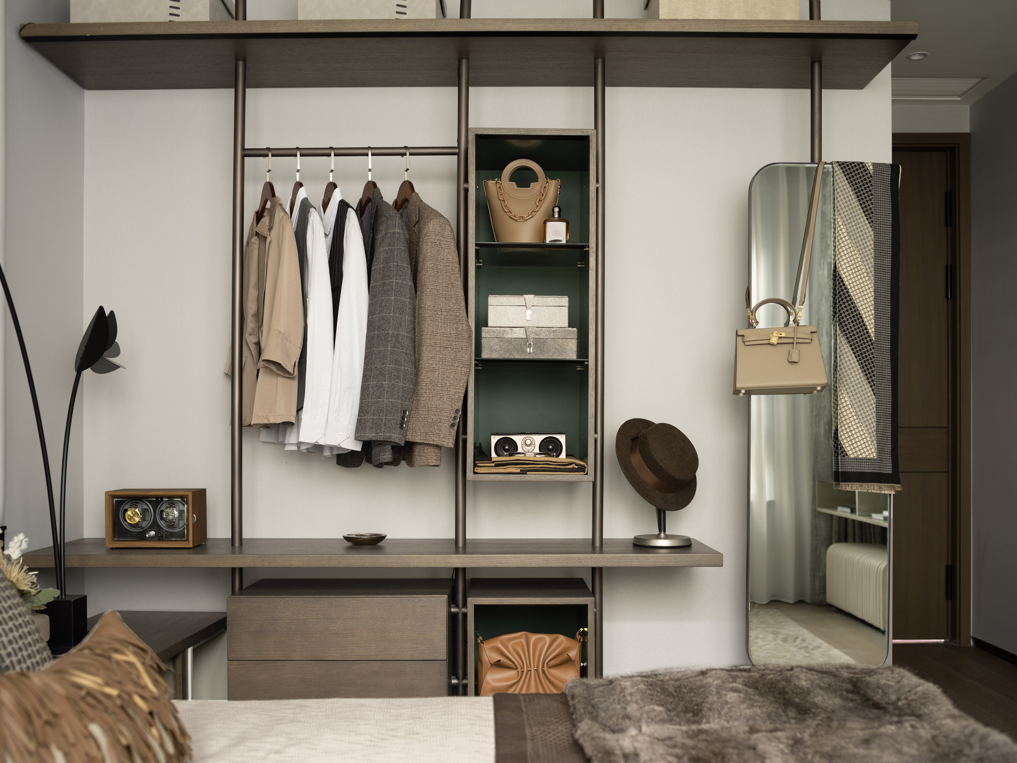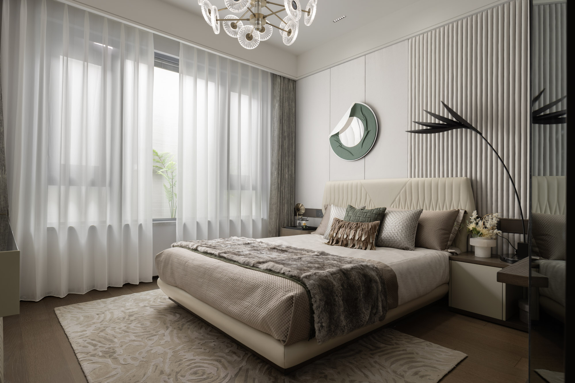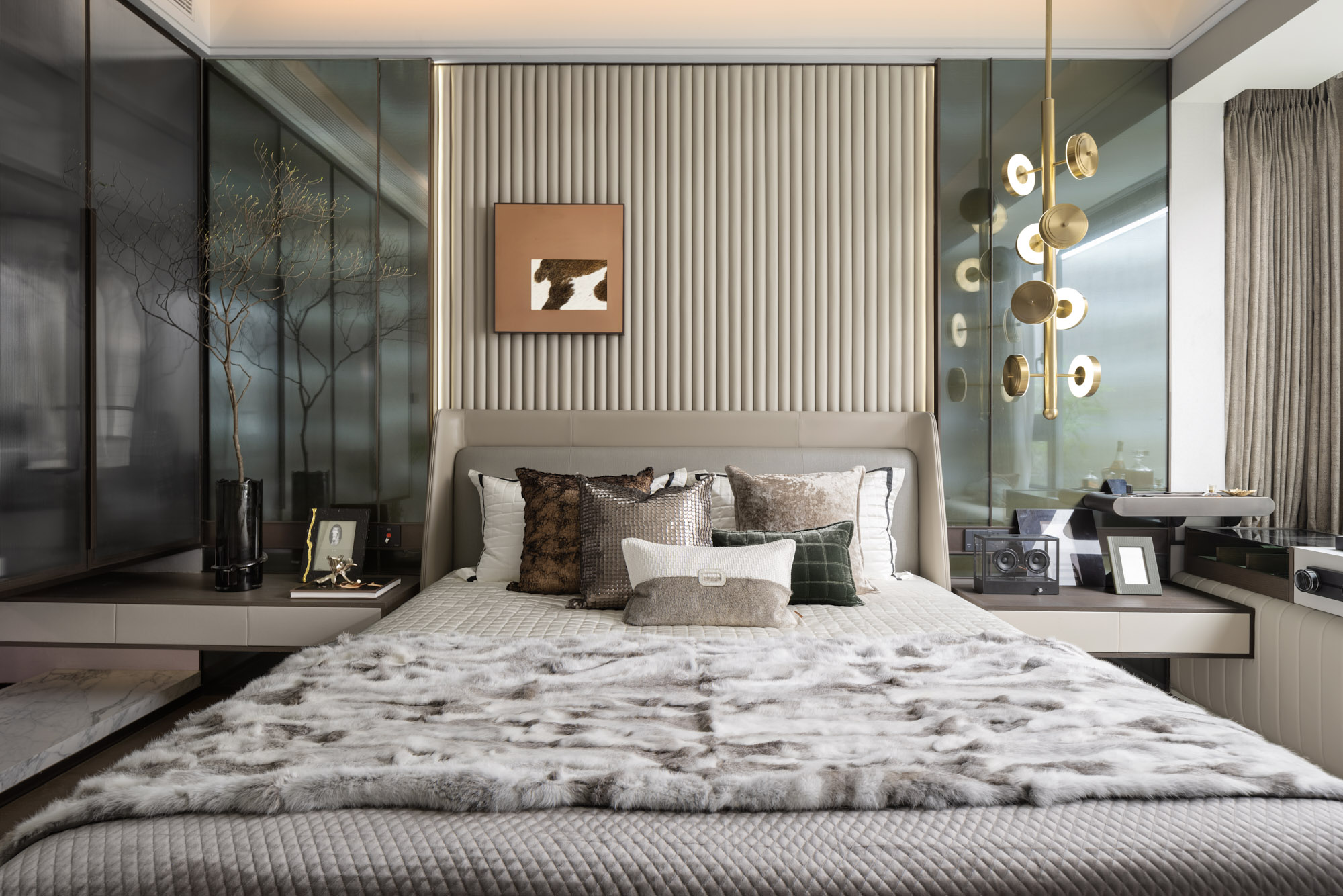 主卧背景墙与床头柜及地台交错融合,线条干净利落,组合衣柜与床头柜一体的设计,皮质硬包浅灰色主色调给人一种温暖、舒适的感觉,力求实现新奢空间造型的完美平衡。