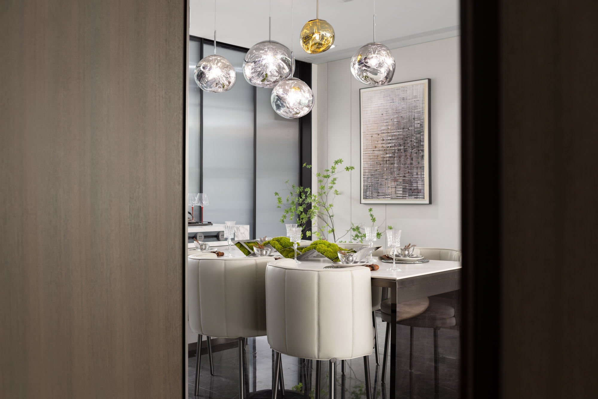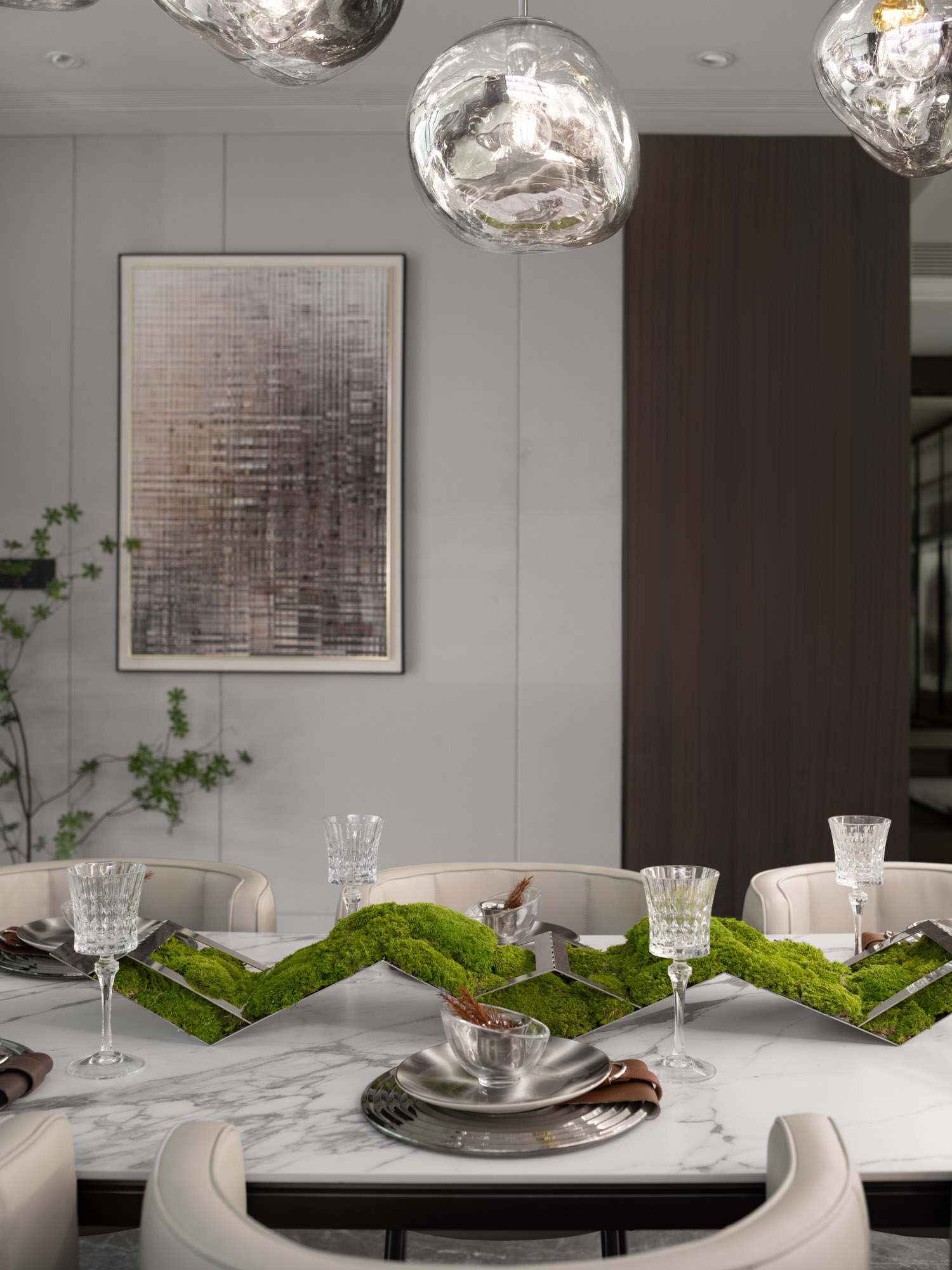 大理石餐桌和皮革餐椅,搭配精致的器皿,造就了简约雅致的气质。自由流畅的动线让生活更无拘自在,一半滋味一半浪漫。女主人在此举办小型聚会,艺术性的插花也会成为招待客人晚宴上的一道风景。男主人也可以与朋友们在餐厅品酒用餐畅聊人生。