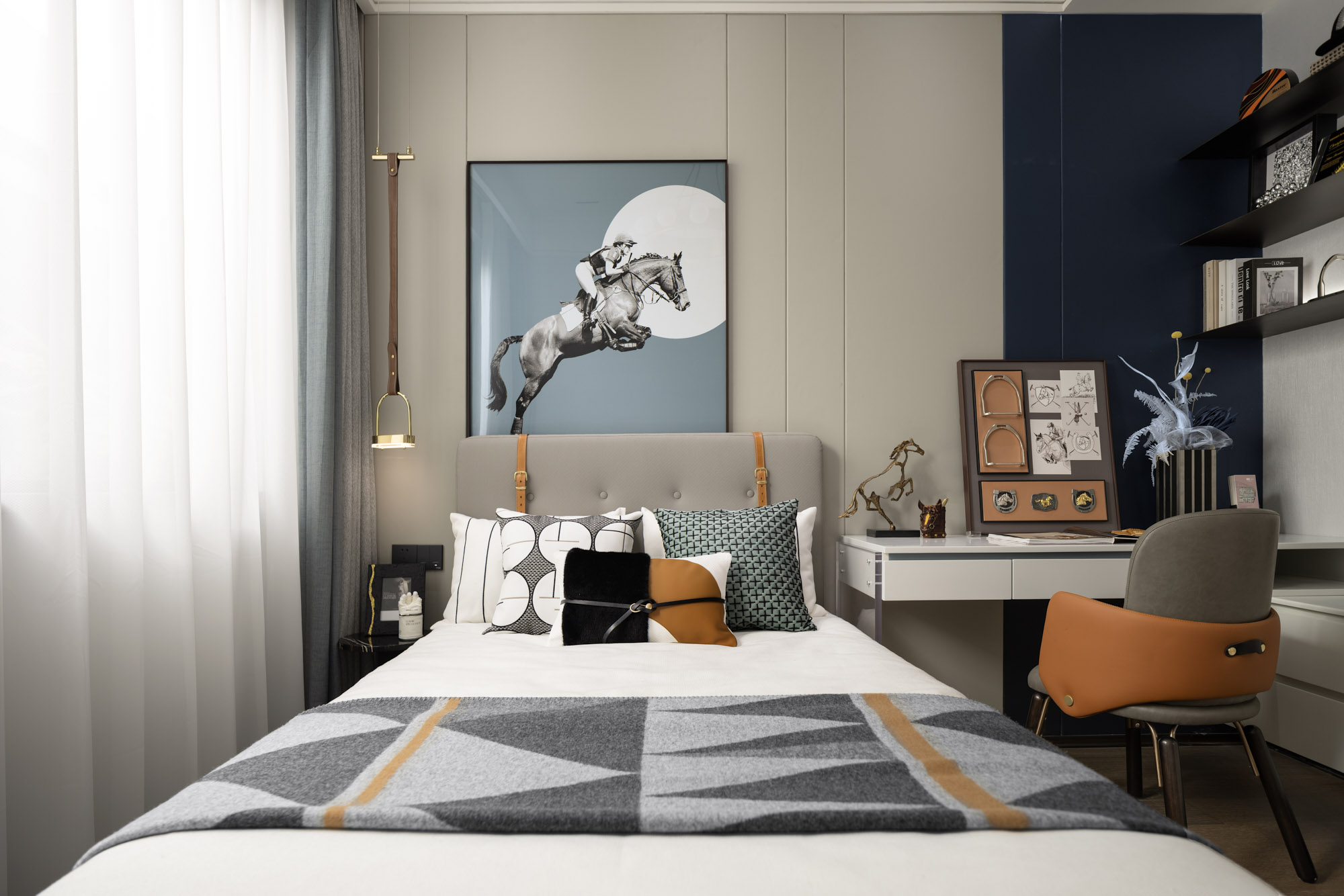 从小接受马术教育并享受驰骋在马场上的敏捷与速度,房间自然融入小主人的爱好,记录他在马术俱乐部的精彩瞬间和成长故事,感受一个少年的活泼帅气。背景墙用浅色和蓝色充满野性元素的皮革硬包,表现了小男孩的勇敢的性格。房间的储物吊架陈列着马术用具,装饰画及床品、吊灯、桌椅都带有马术的元素,体现了小孩对马术的热爱。