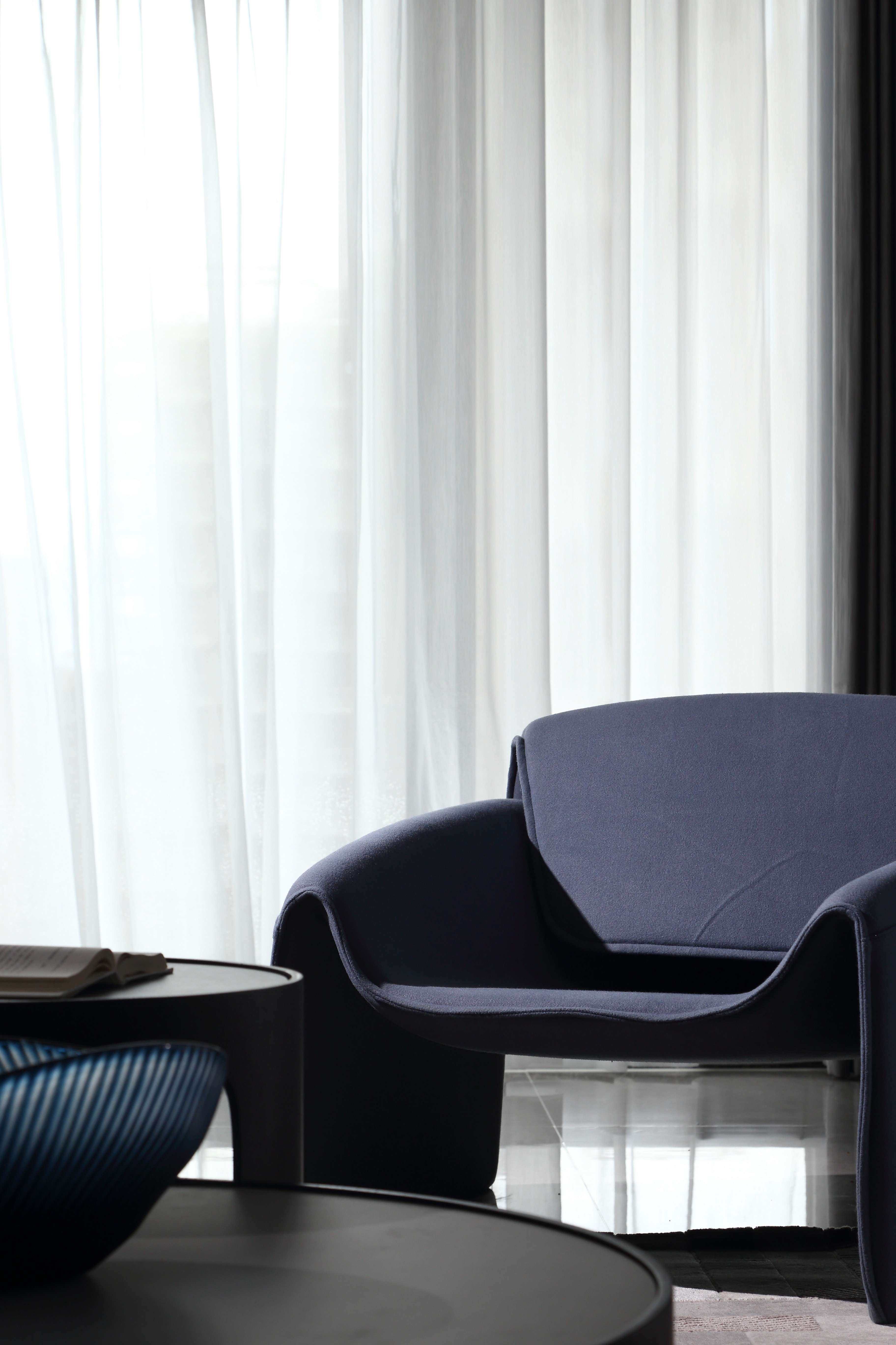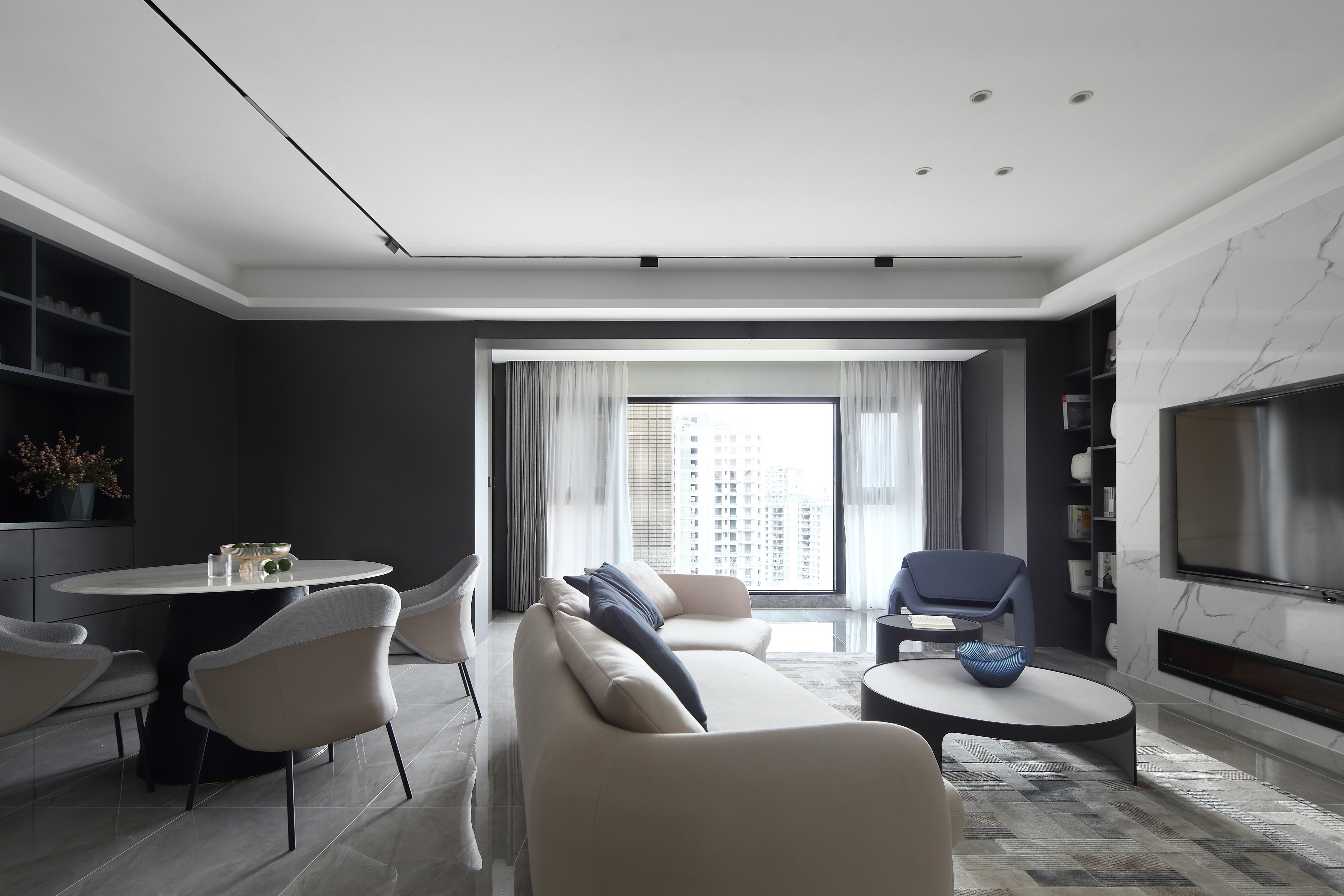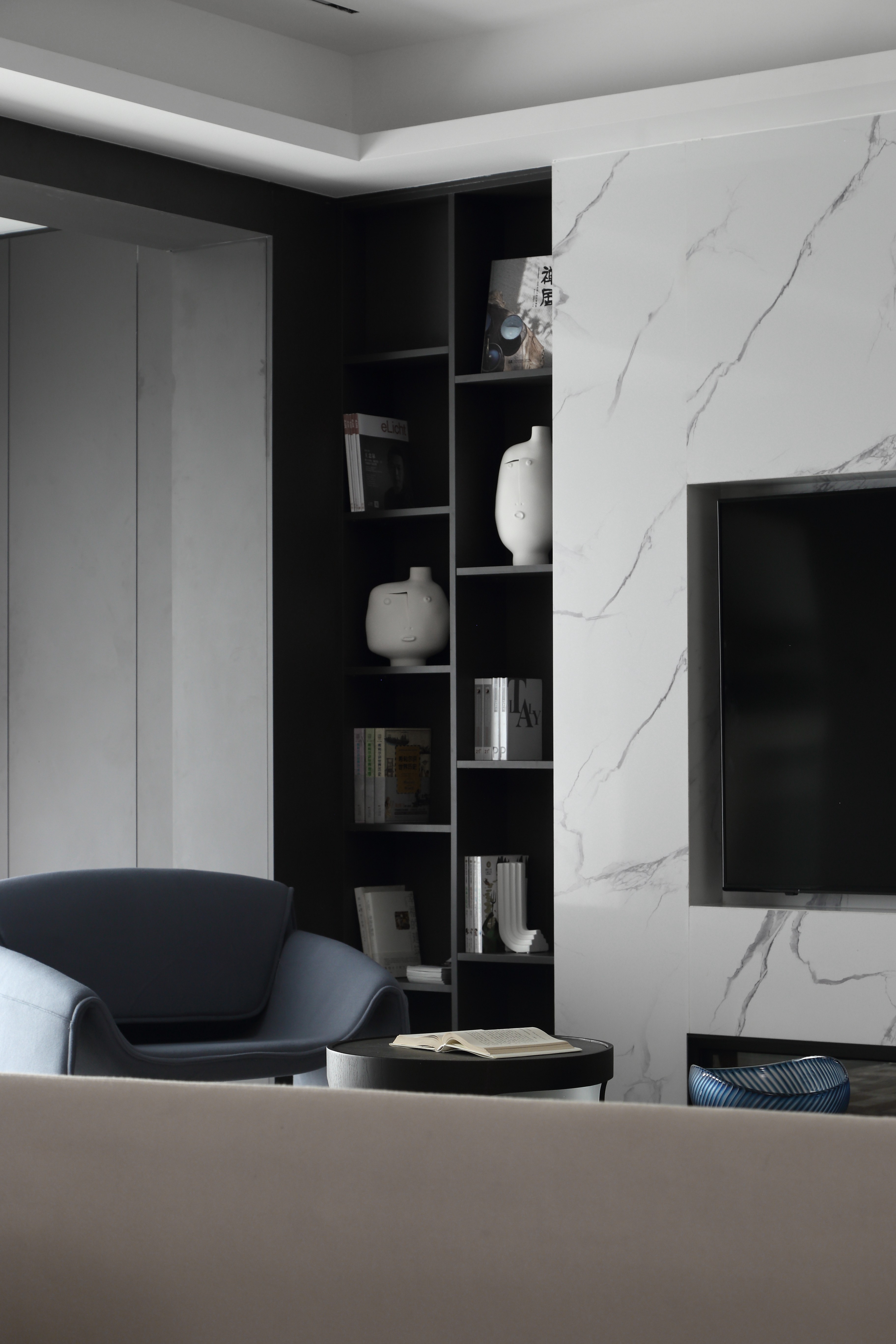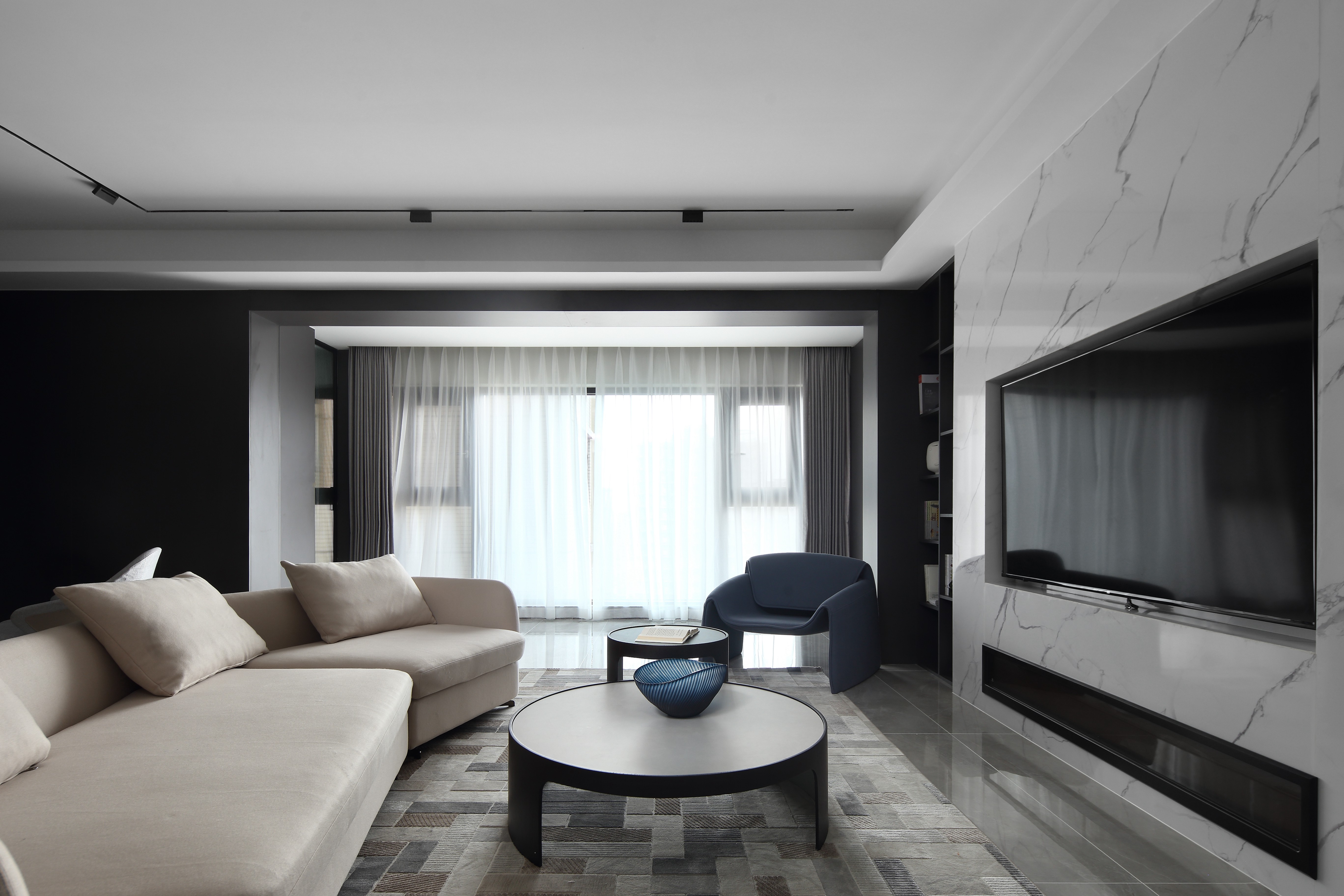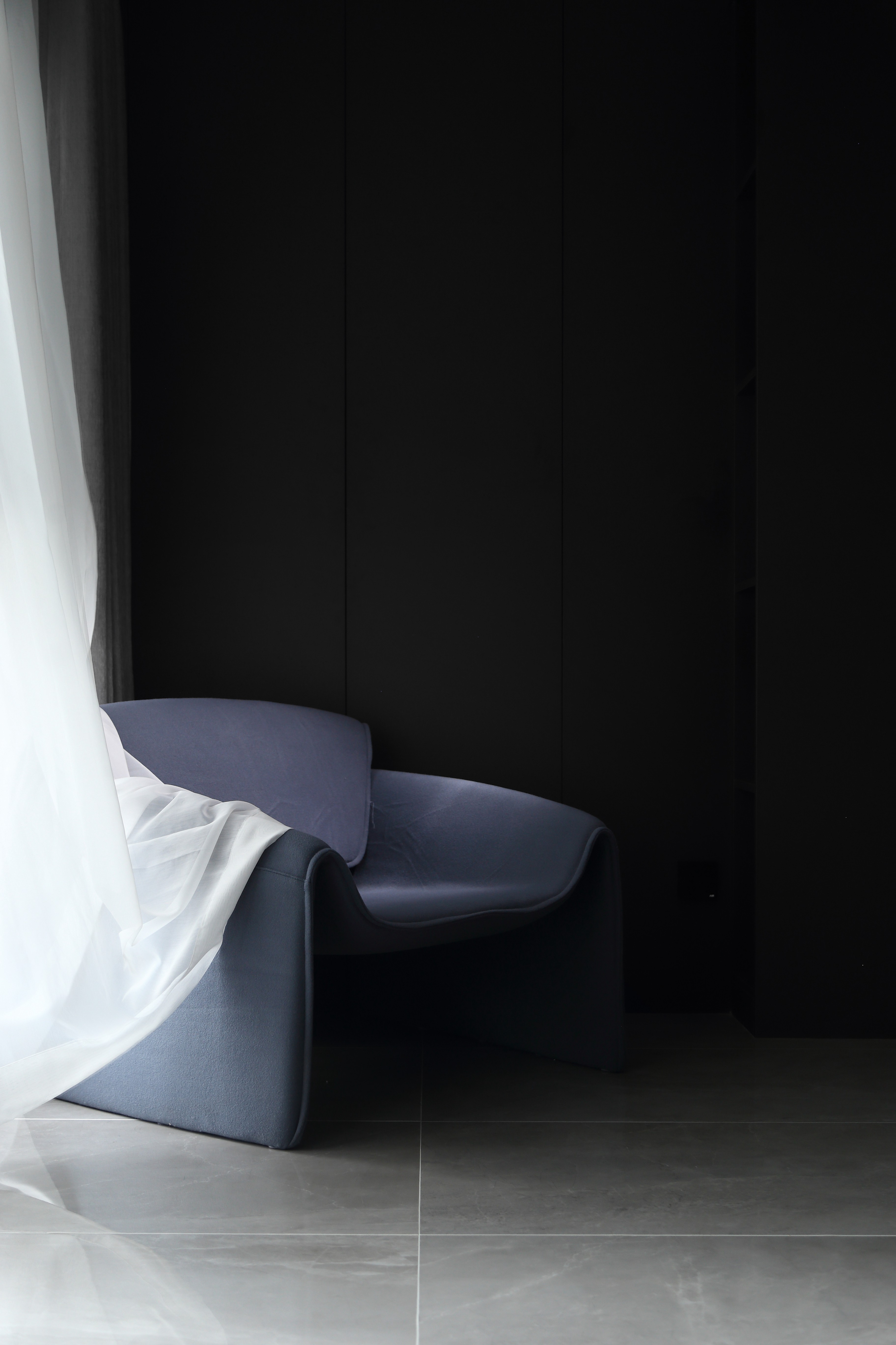空间意境:黑白灰基调增添一抹蓝,在理性中孕育温情