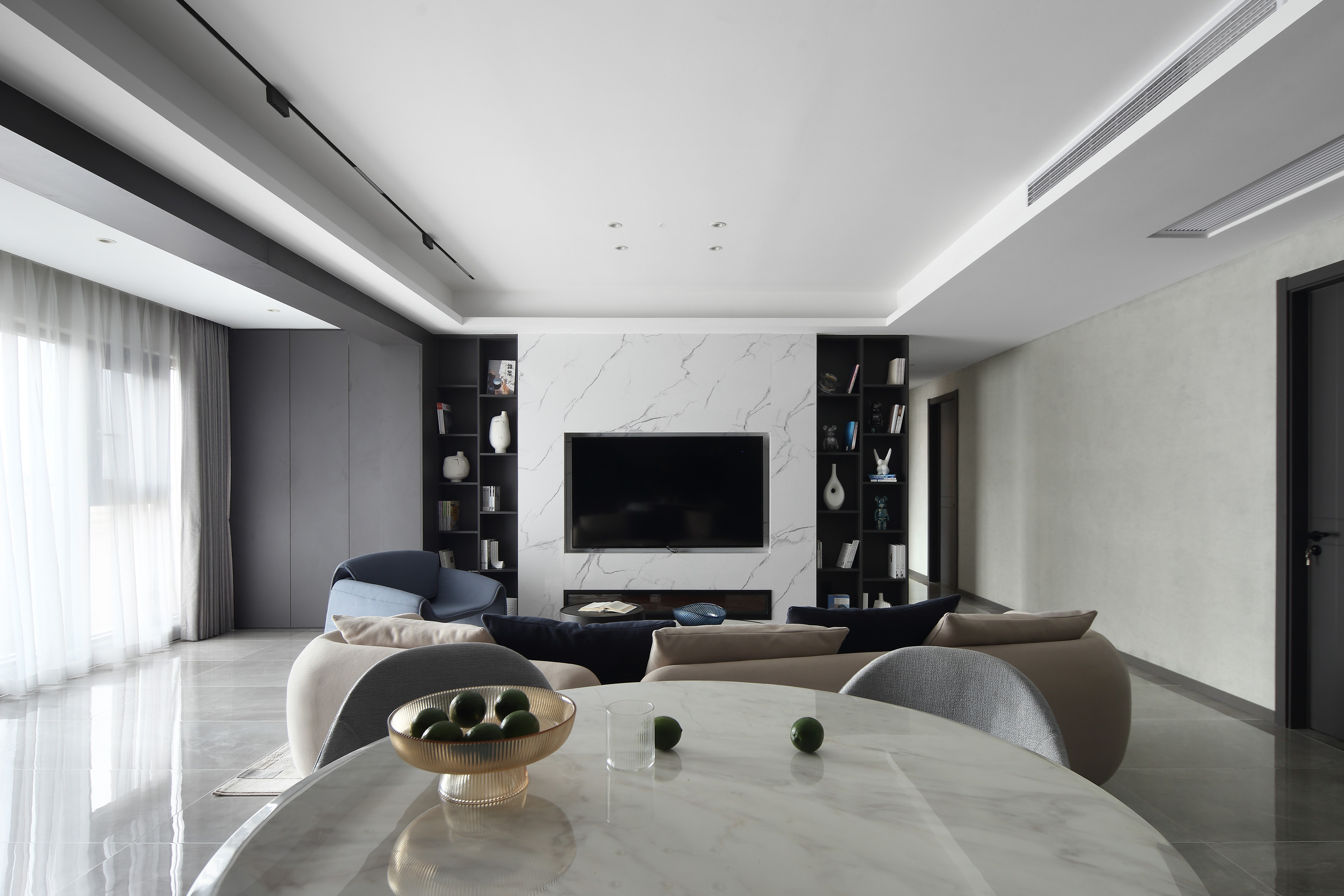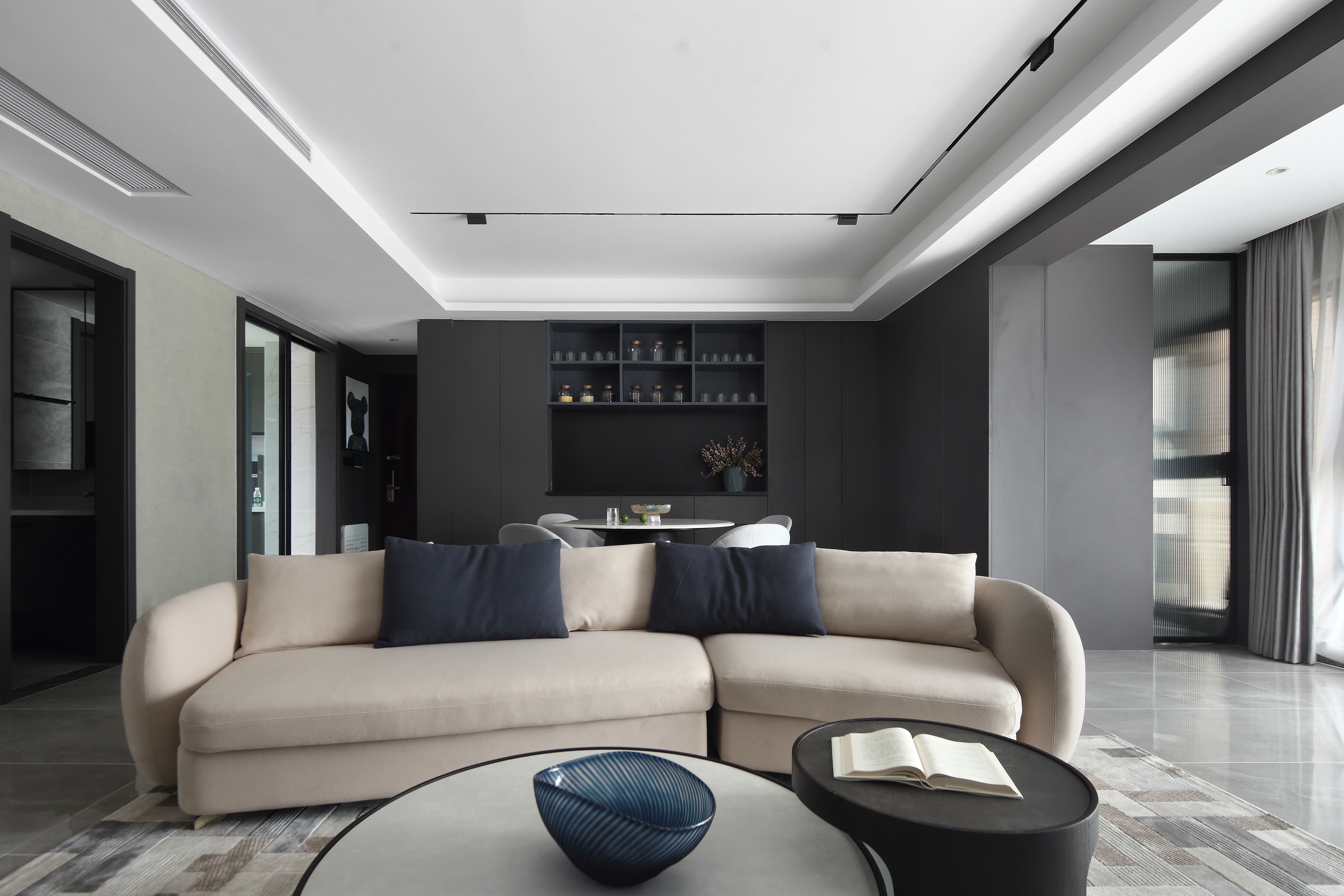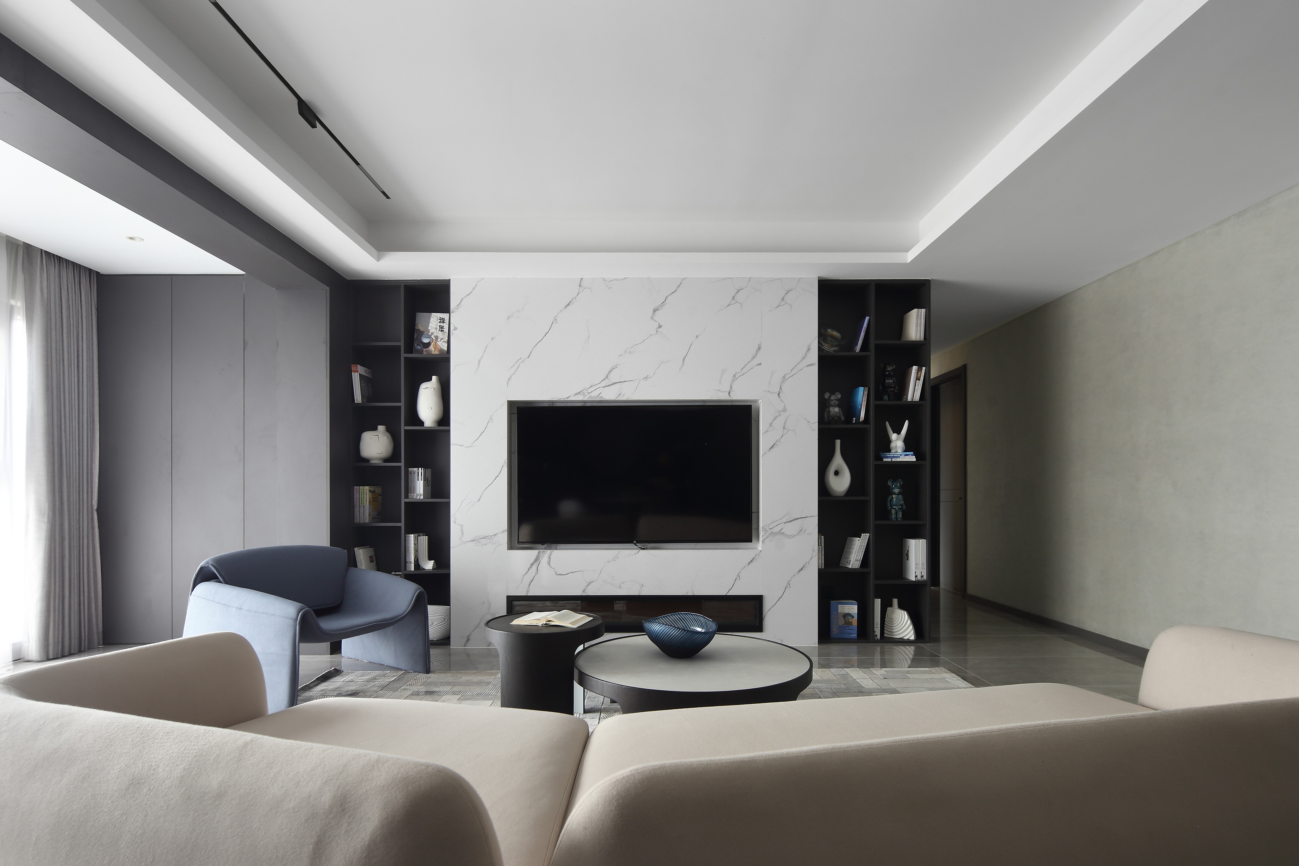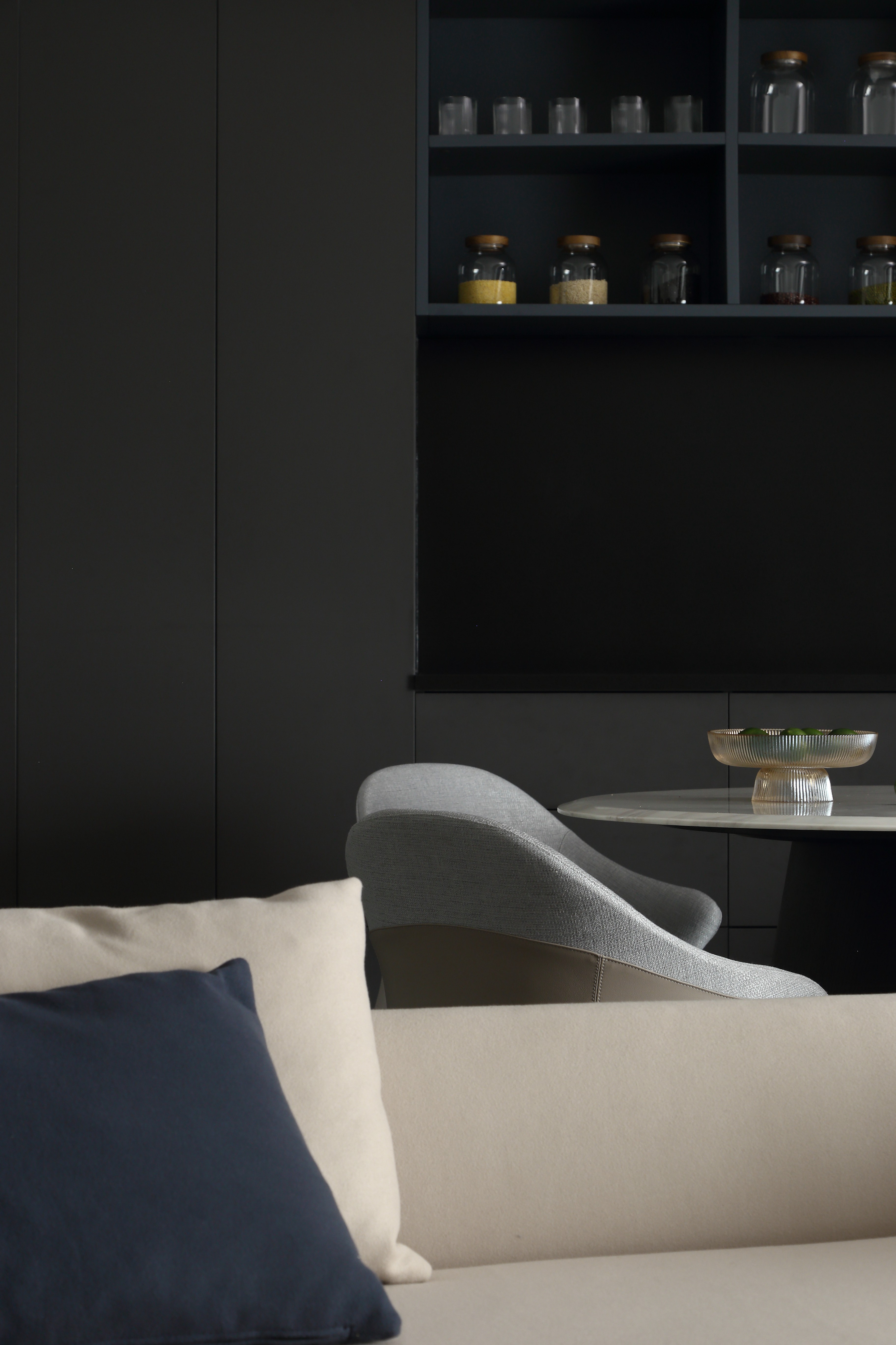 空间意境:黑白灰基调增添一抹蓝,在理性中孕育温情