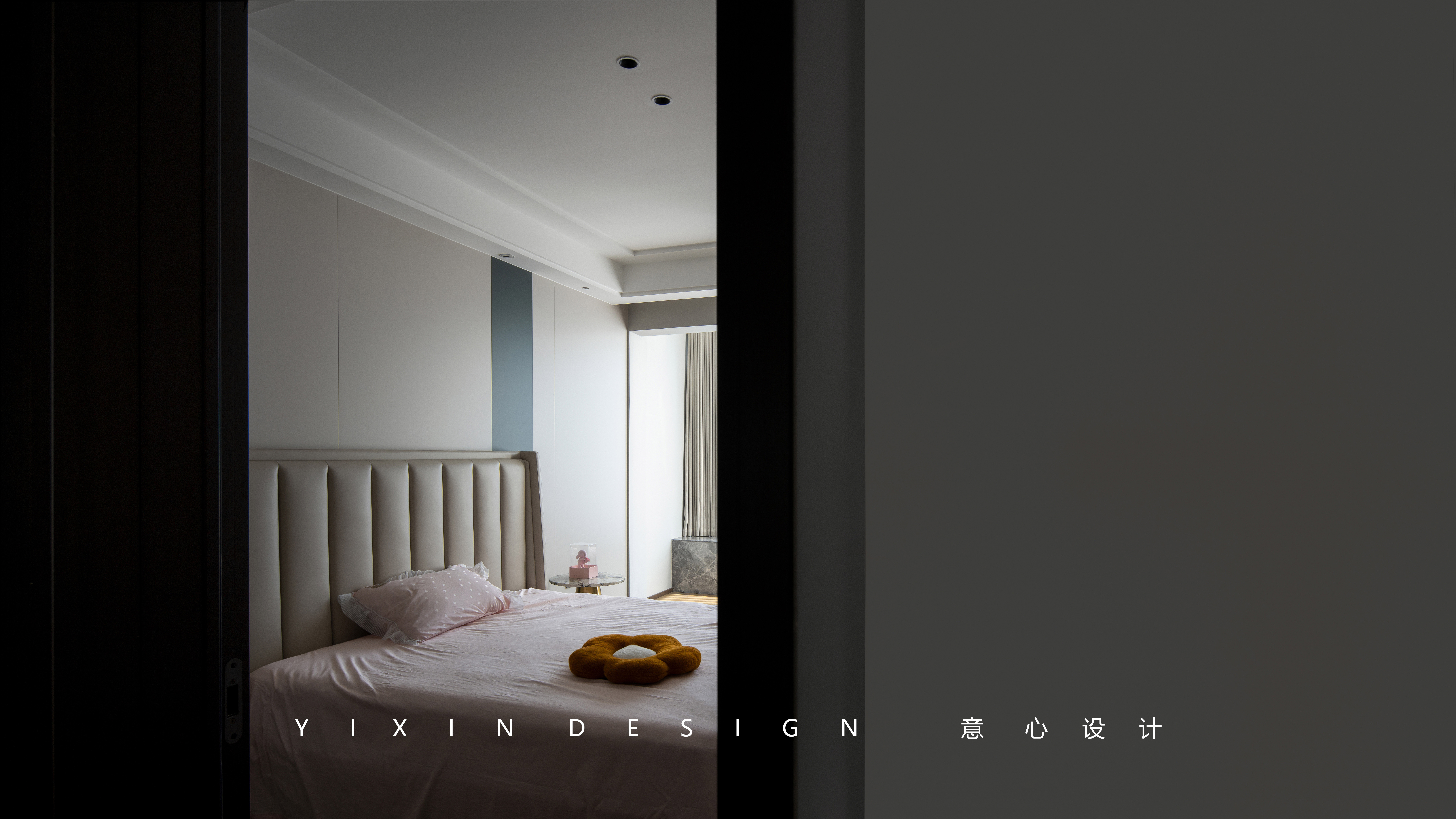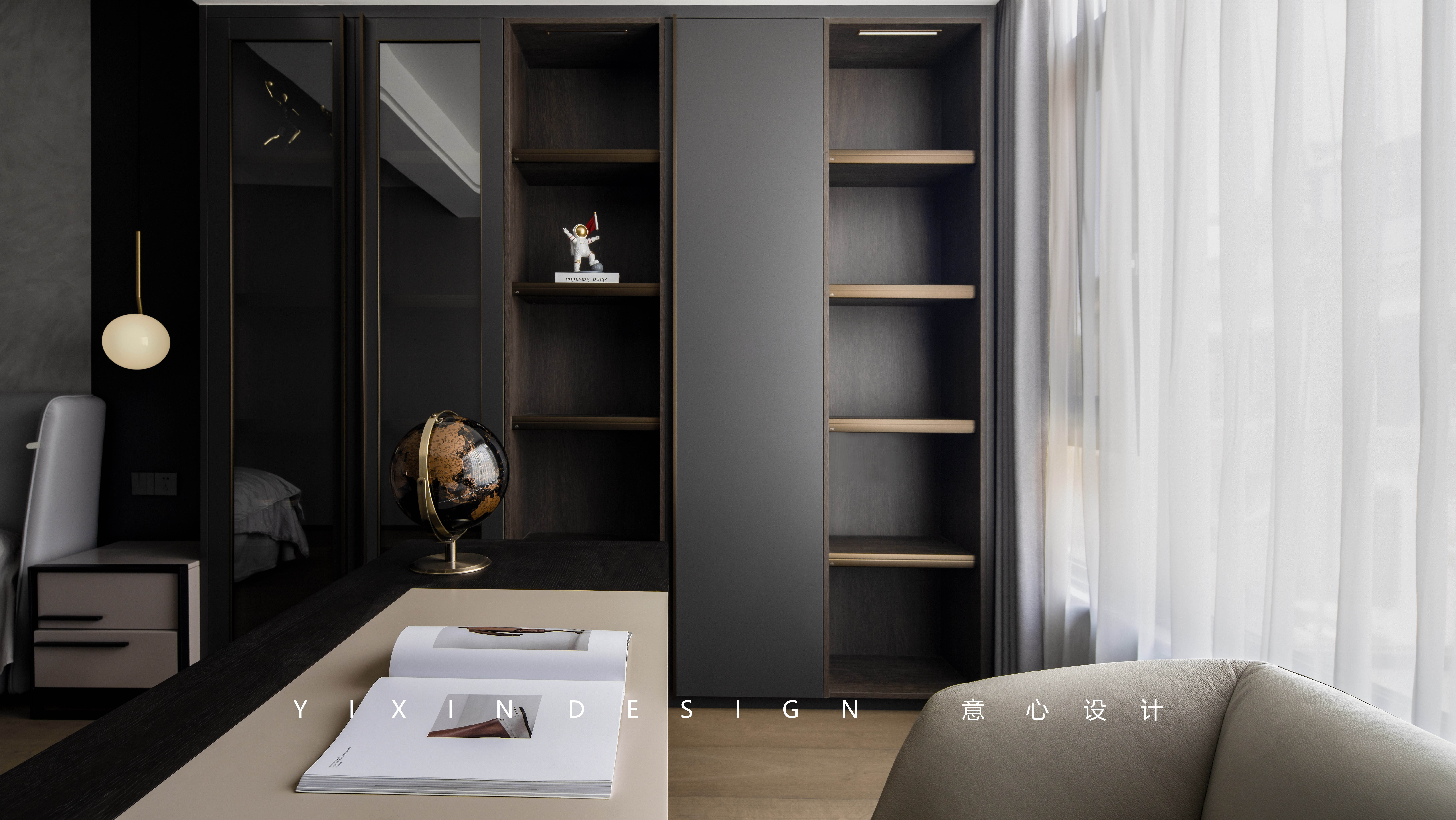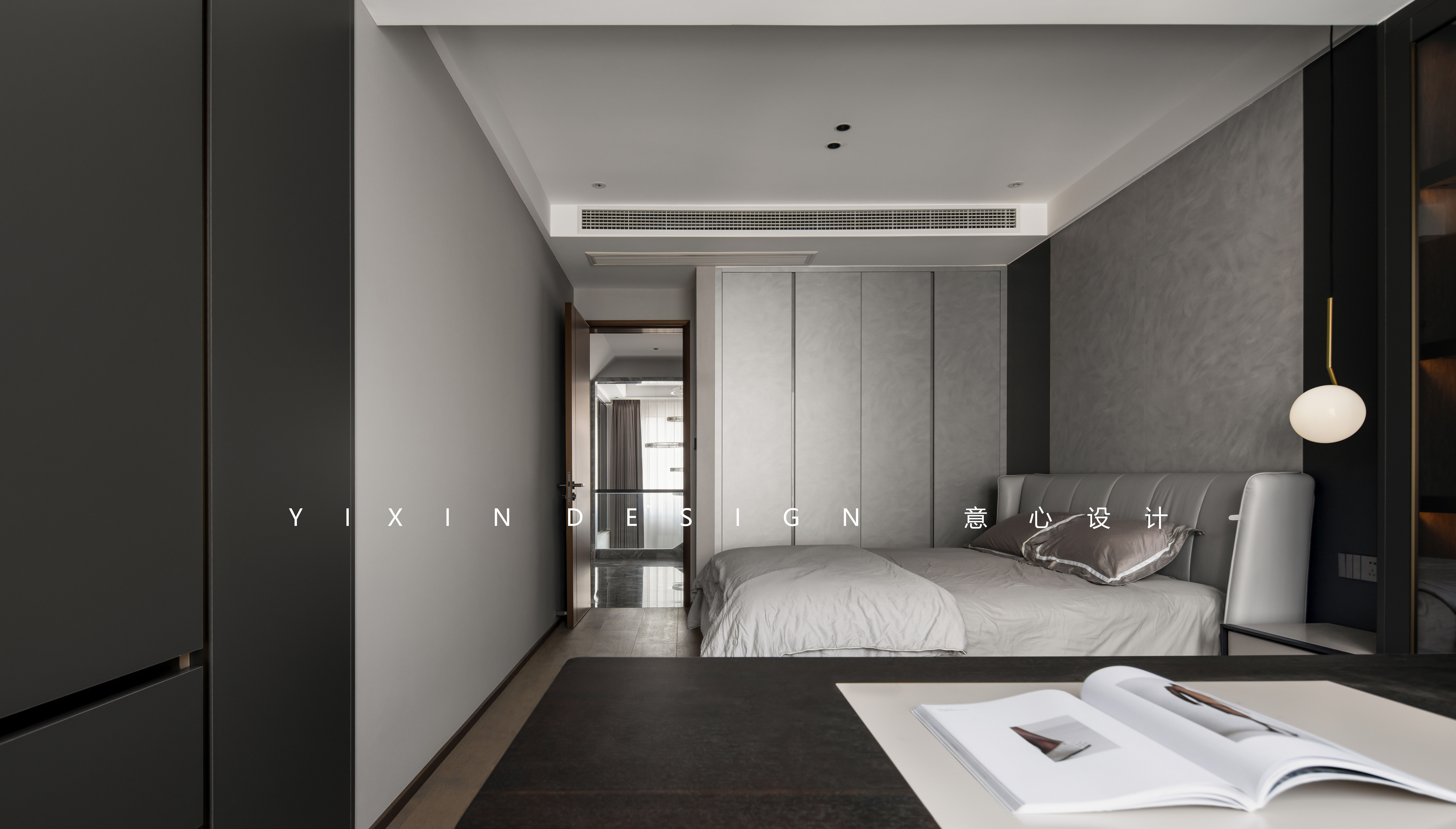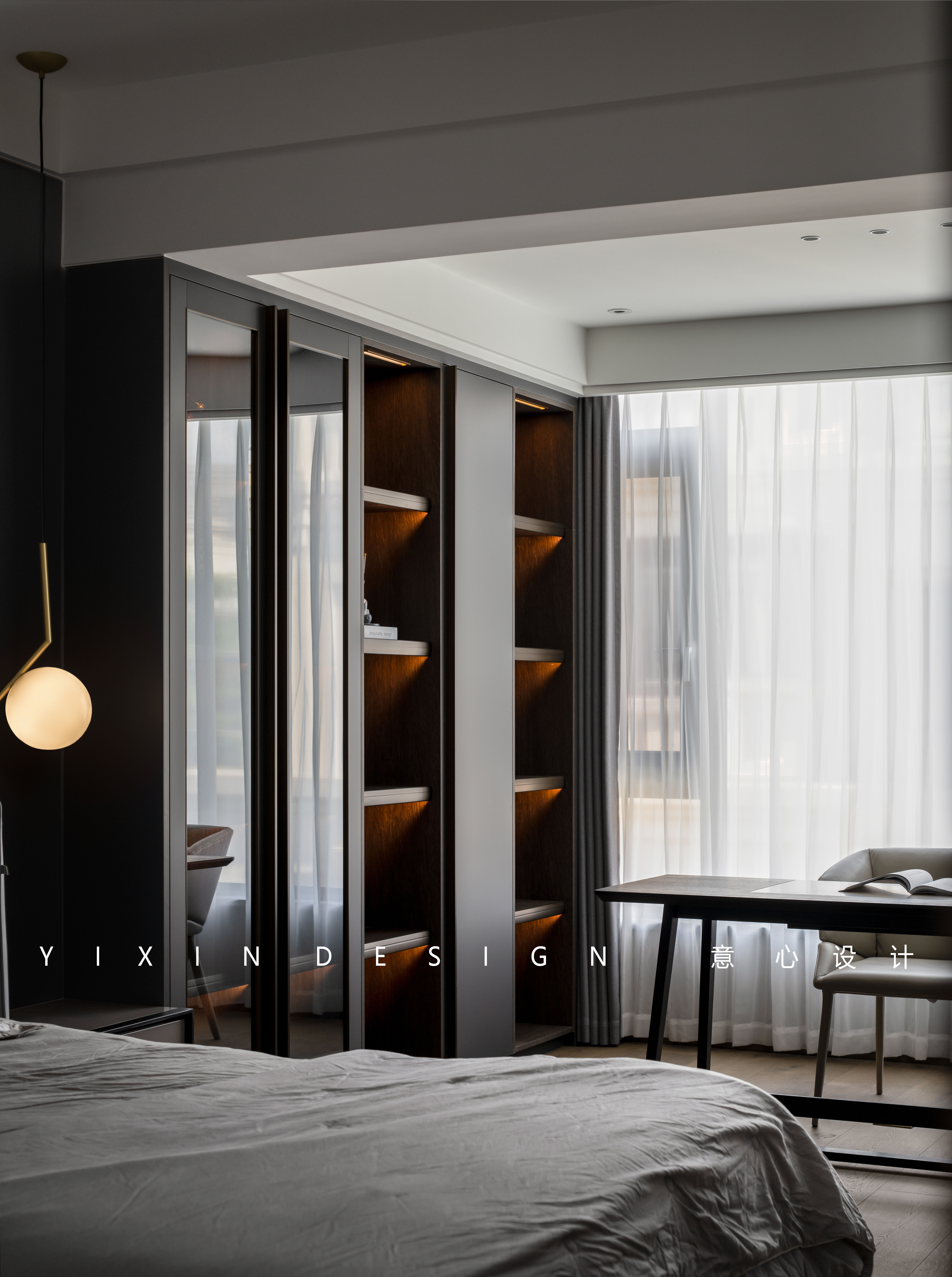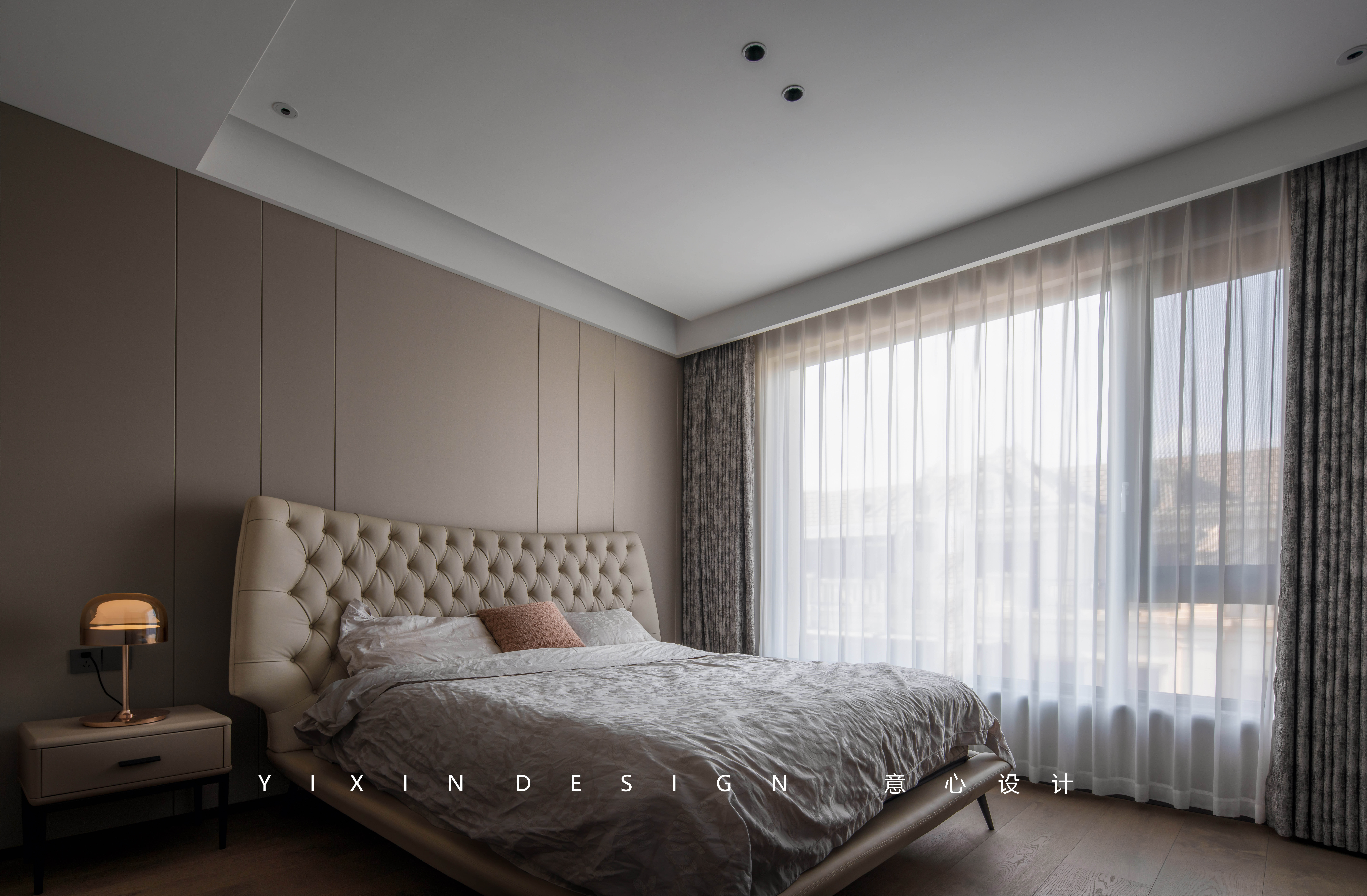 木质的深色与软配床品的对撞中达到一份静谧的美感