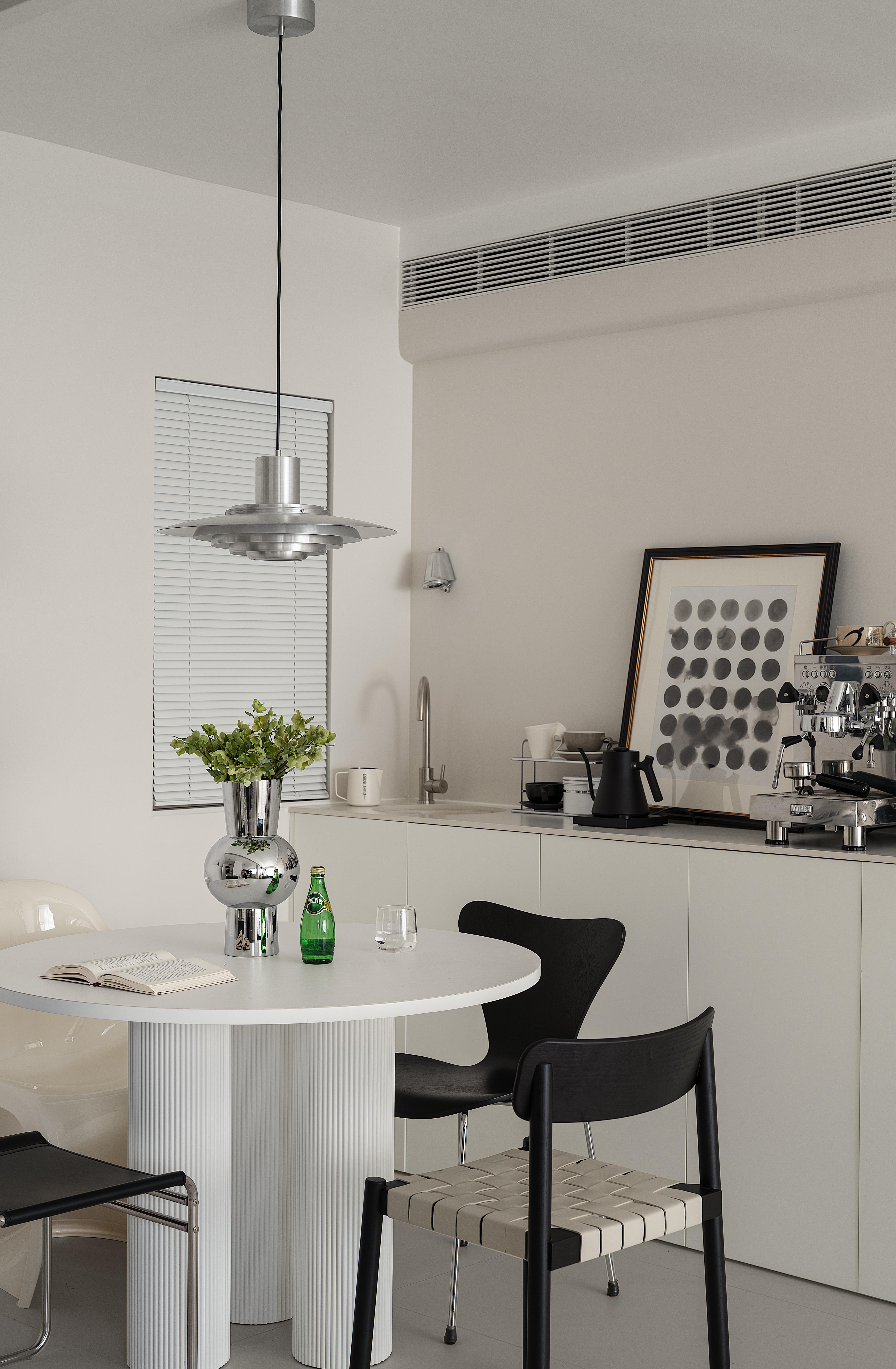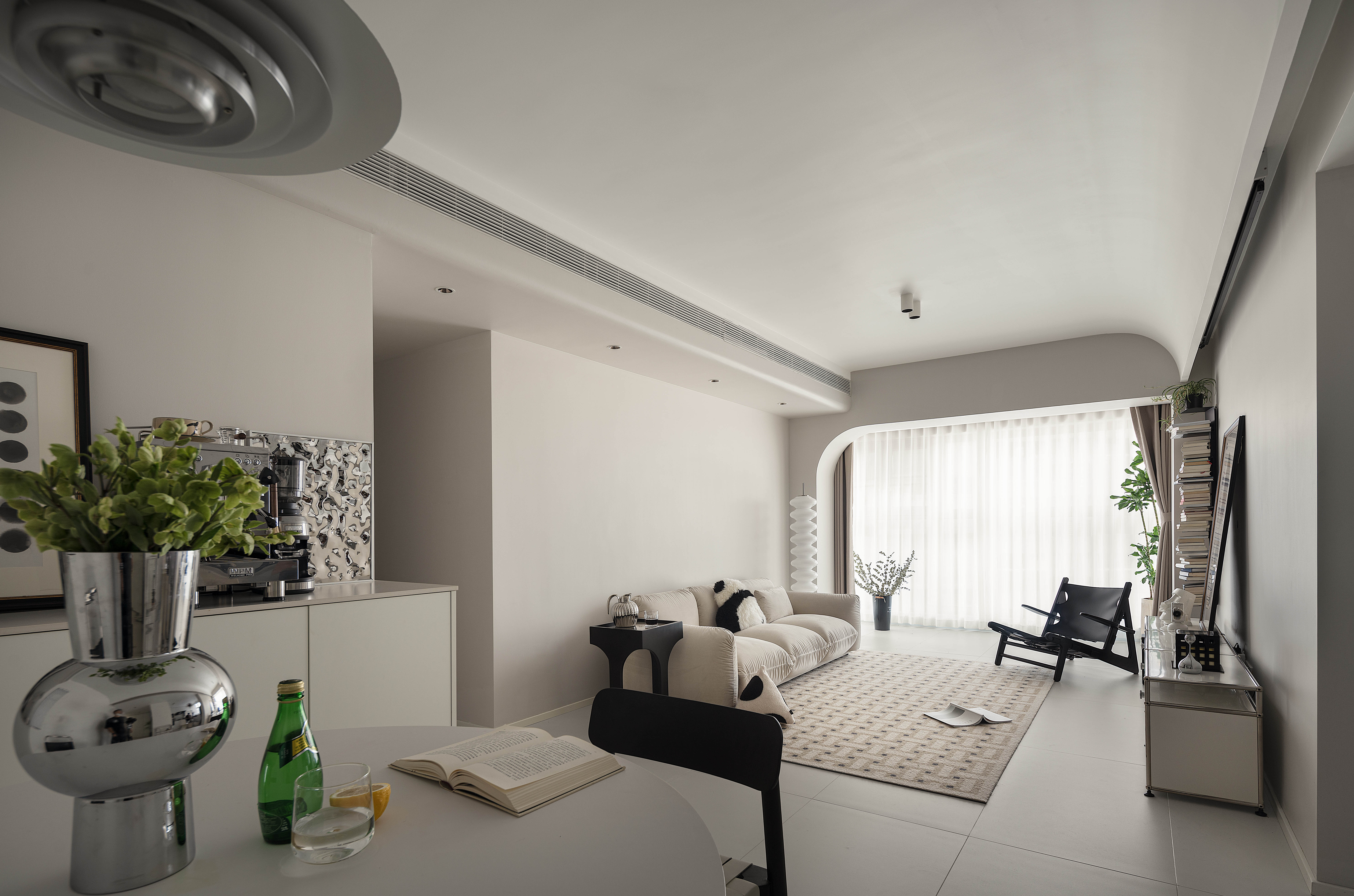 延伸的吊顶和出风口,加强了客餐厅的视觉整体性。基于对理想生活情景的考虑,用简洁素雅的色调和家具,塑造出简约精致的轻侘寂氛围。