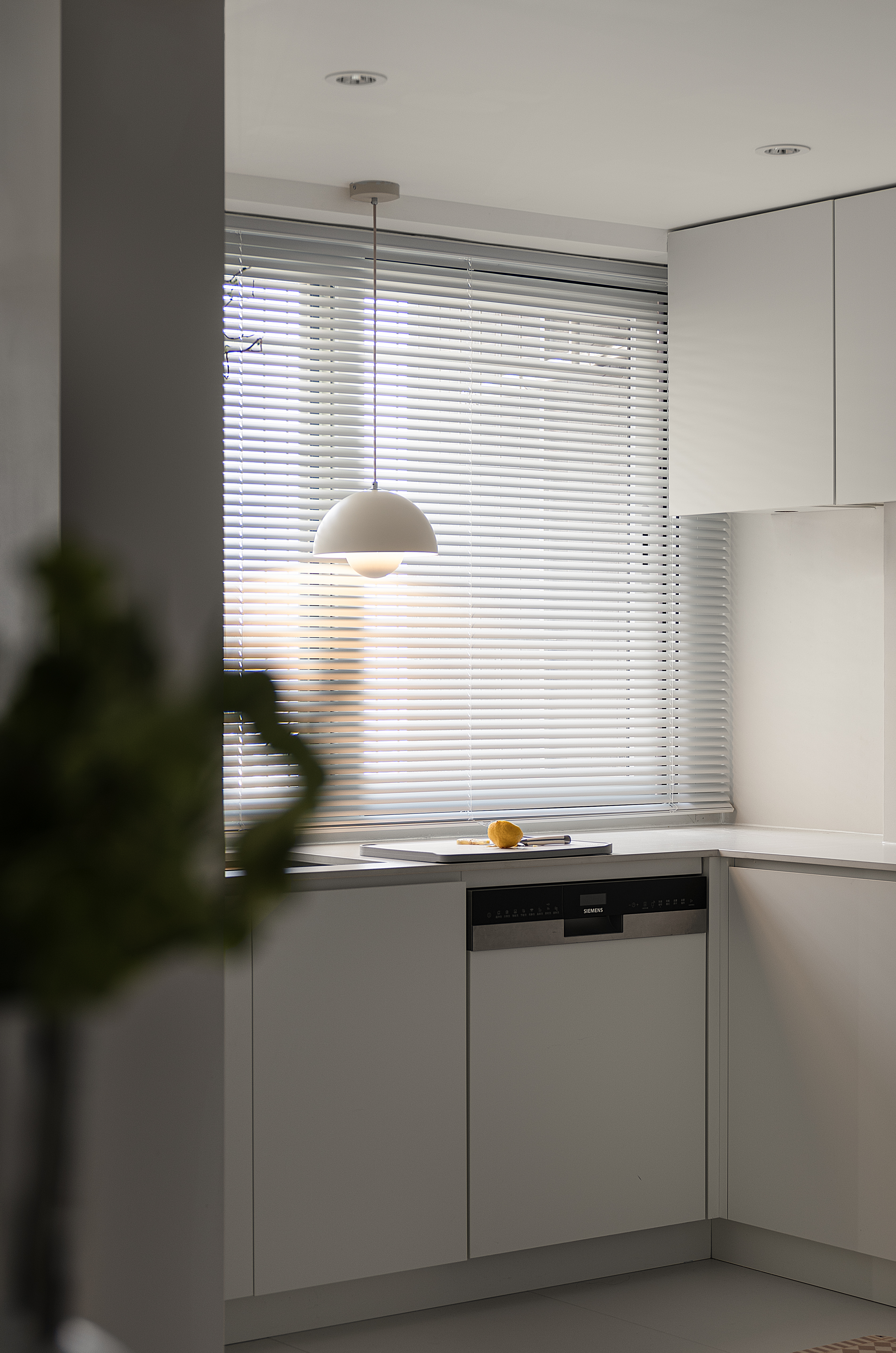 厨房主照明选择隐藏筒灯,避免繁复灯饰对空间的压迫感。洗菜切菜区加装辅助照明吊灯,处理食材更加便利。
