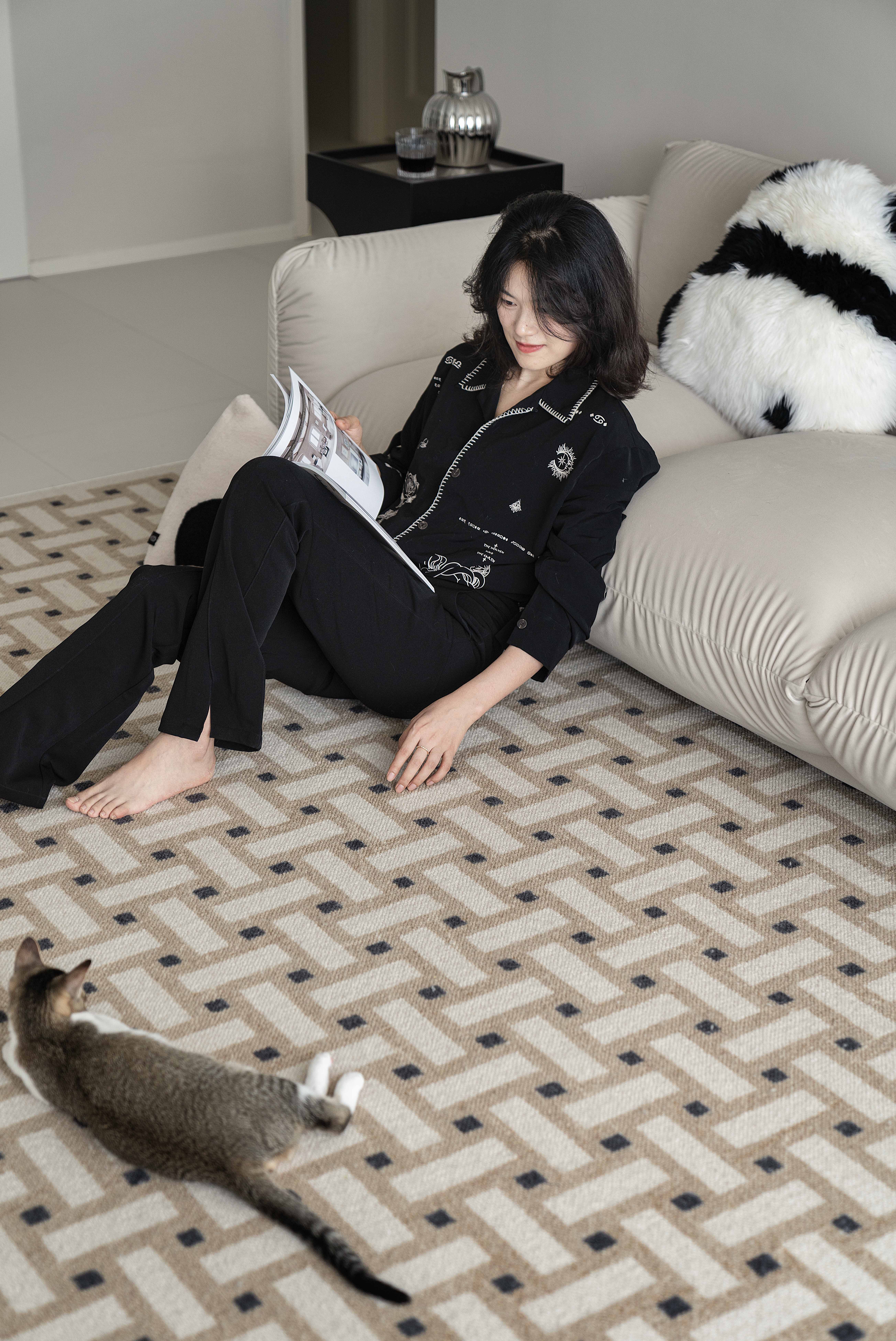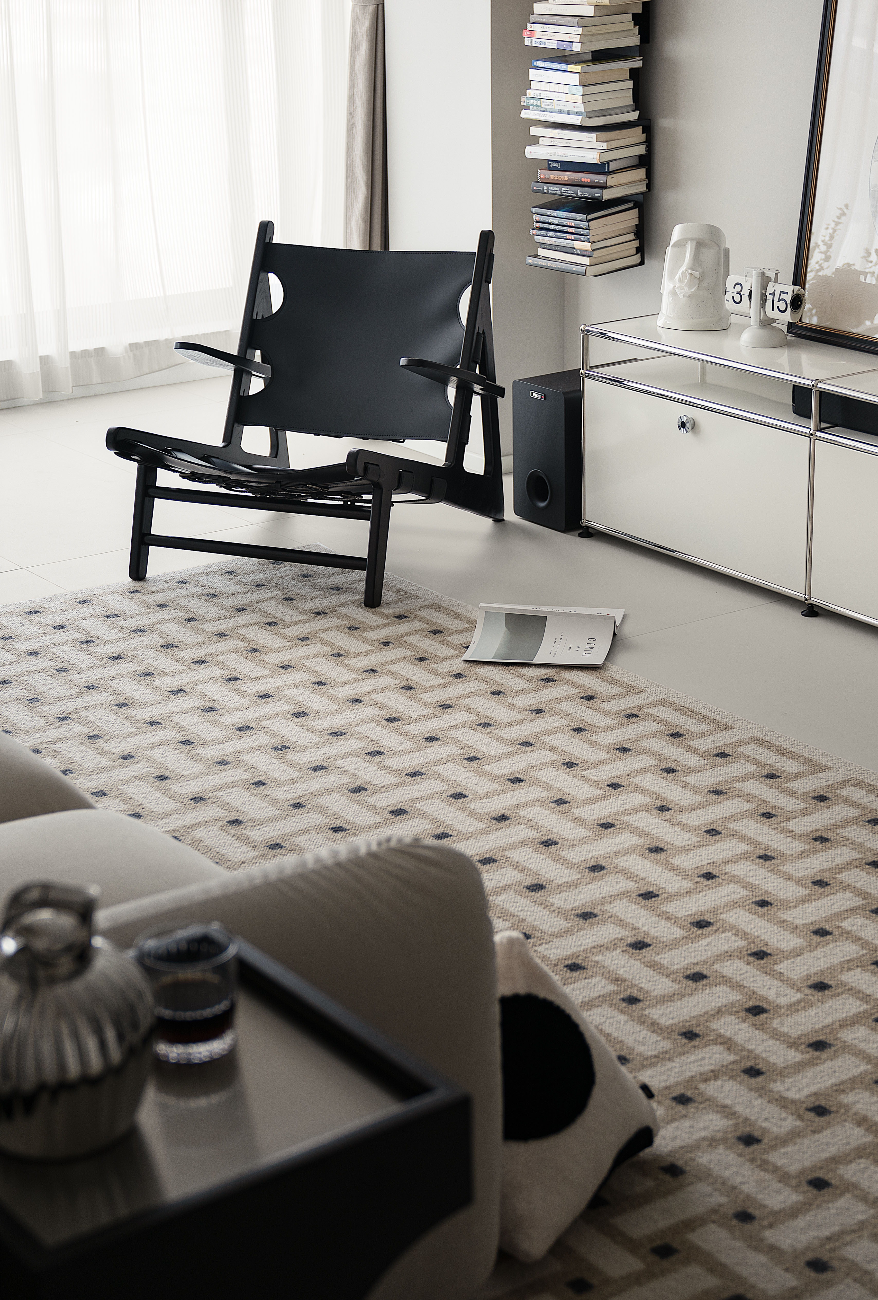 几何艺术纹理地毯,规划出人宠互动区域,艺术与生活,在具有哲学般的简与奢中交融荟聚。