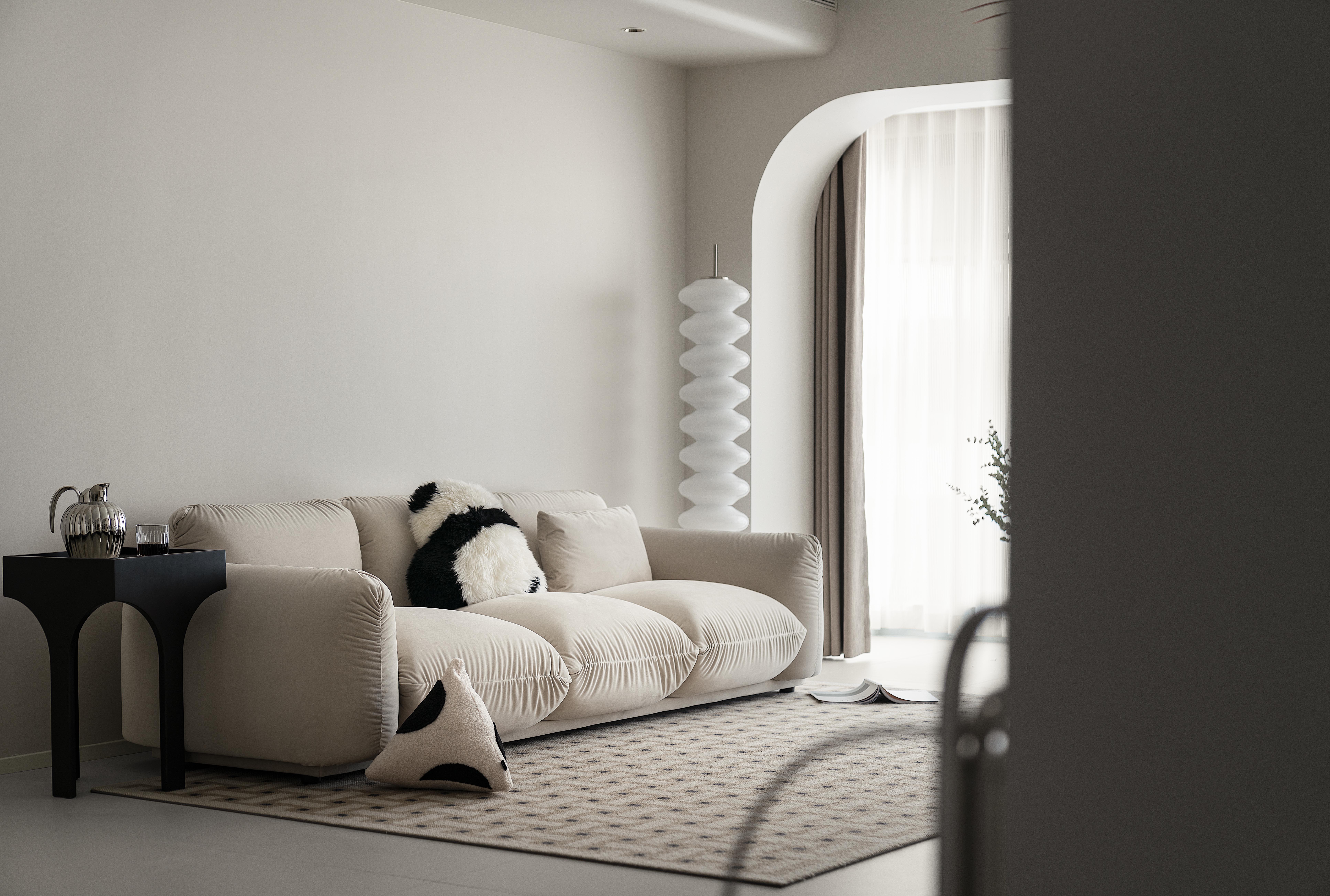 115平的房子常住两人,既不会显得空寂,也没有拥挤的烦恼,设计上可以根据屋主的喜好尽情发挥。以温柔简约的奶油白为主调,减少视觉上的繁乱感,空间犹如一张上好画布,用弧线、灯光、艺术材质,描摹出一个隐奢生活空间。