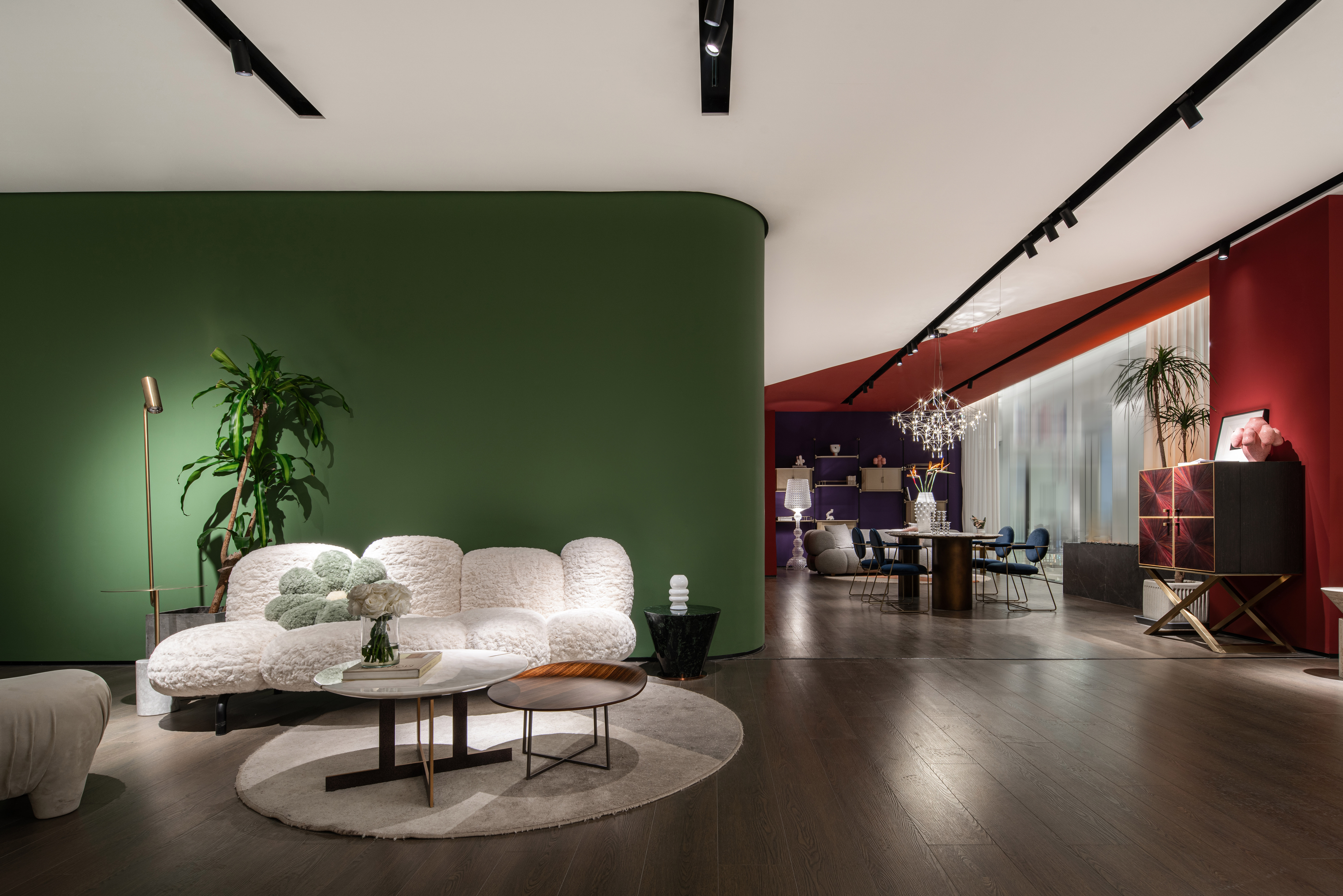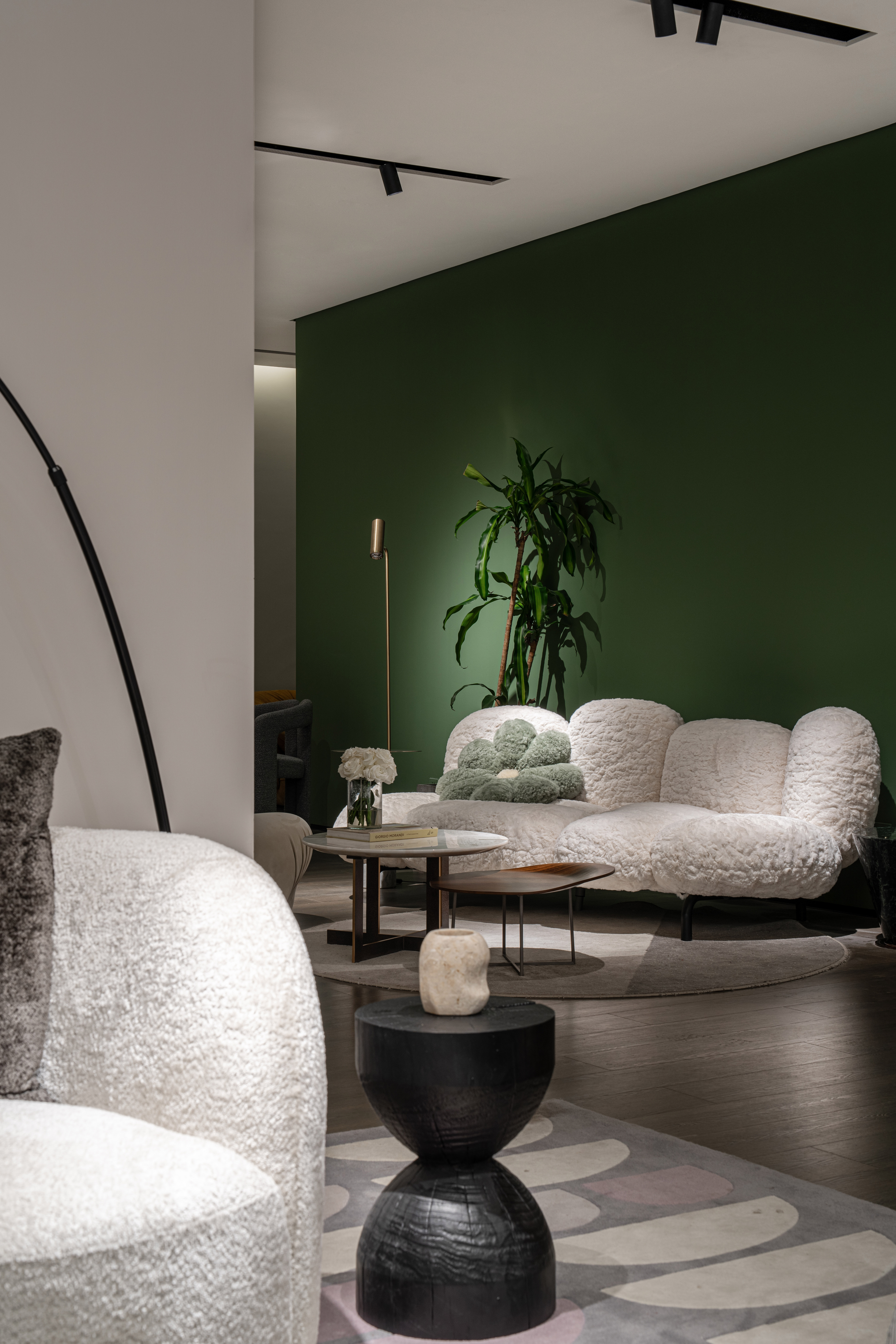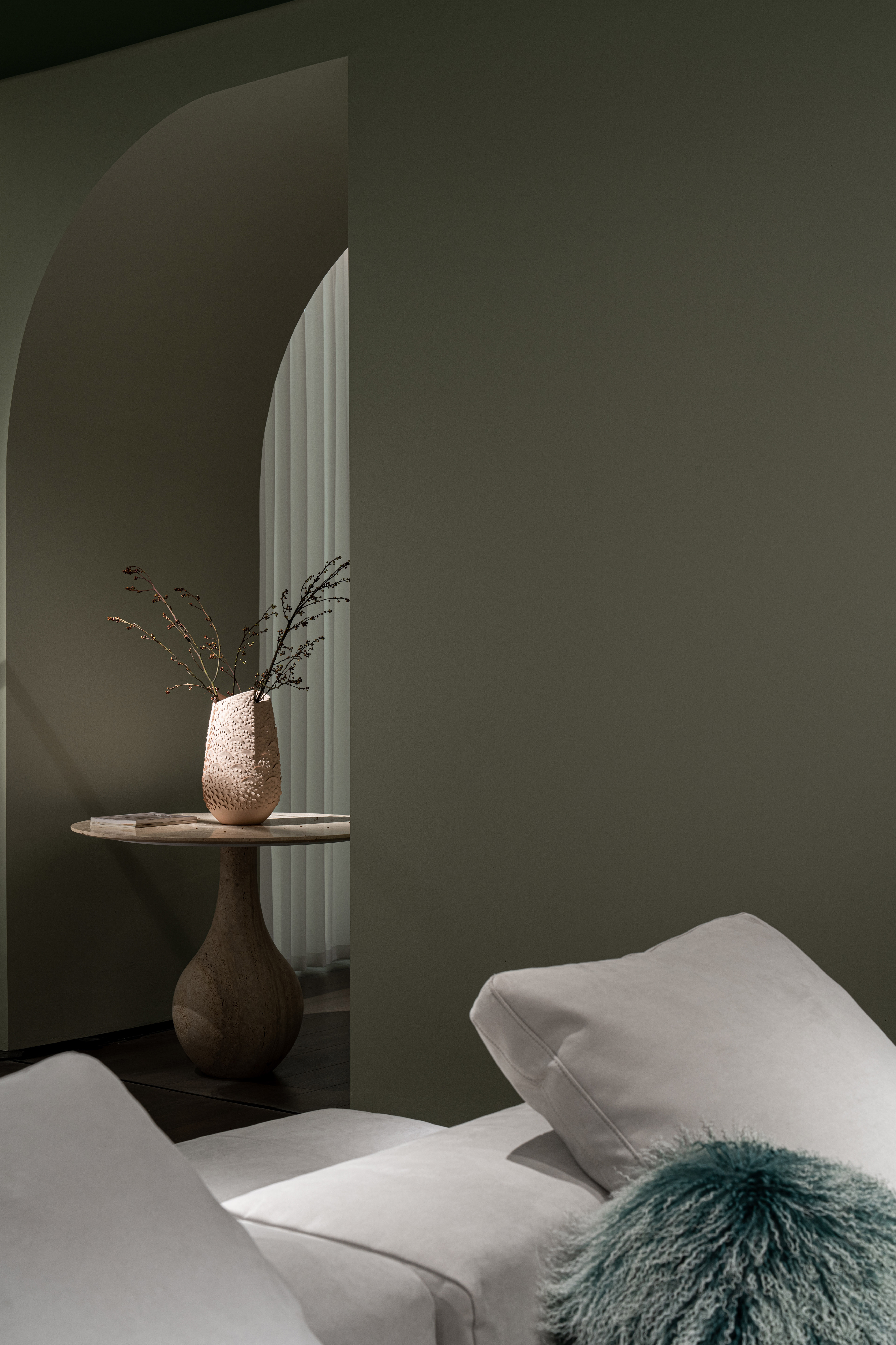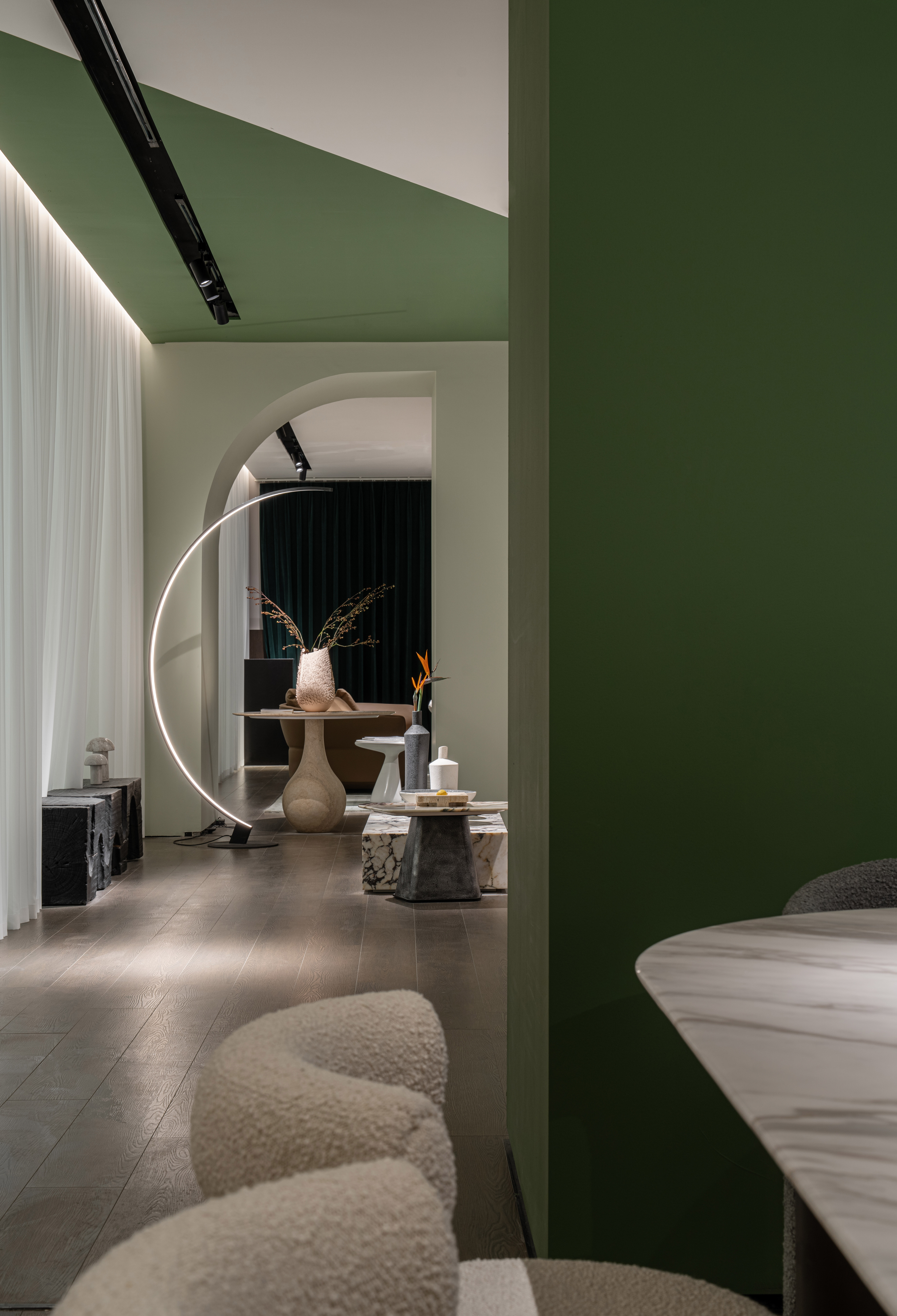 竹青秘境这一空间,绿色系的宁静清新自然,给人平静安稳的心理暗示,放置现代年轻化或者诧寂风自然系的软装家居产品,治愈人心的同时,也给消费者营造出舒适的场景。