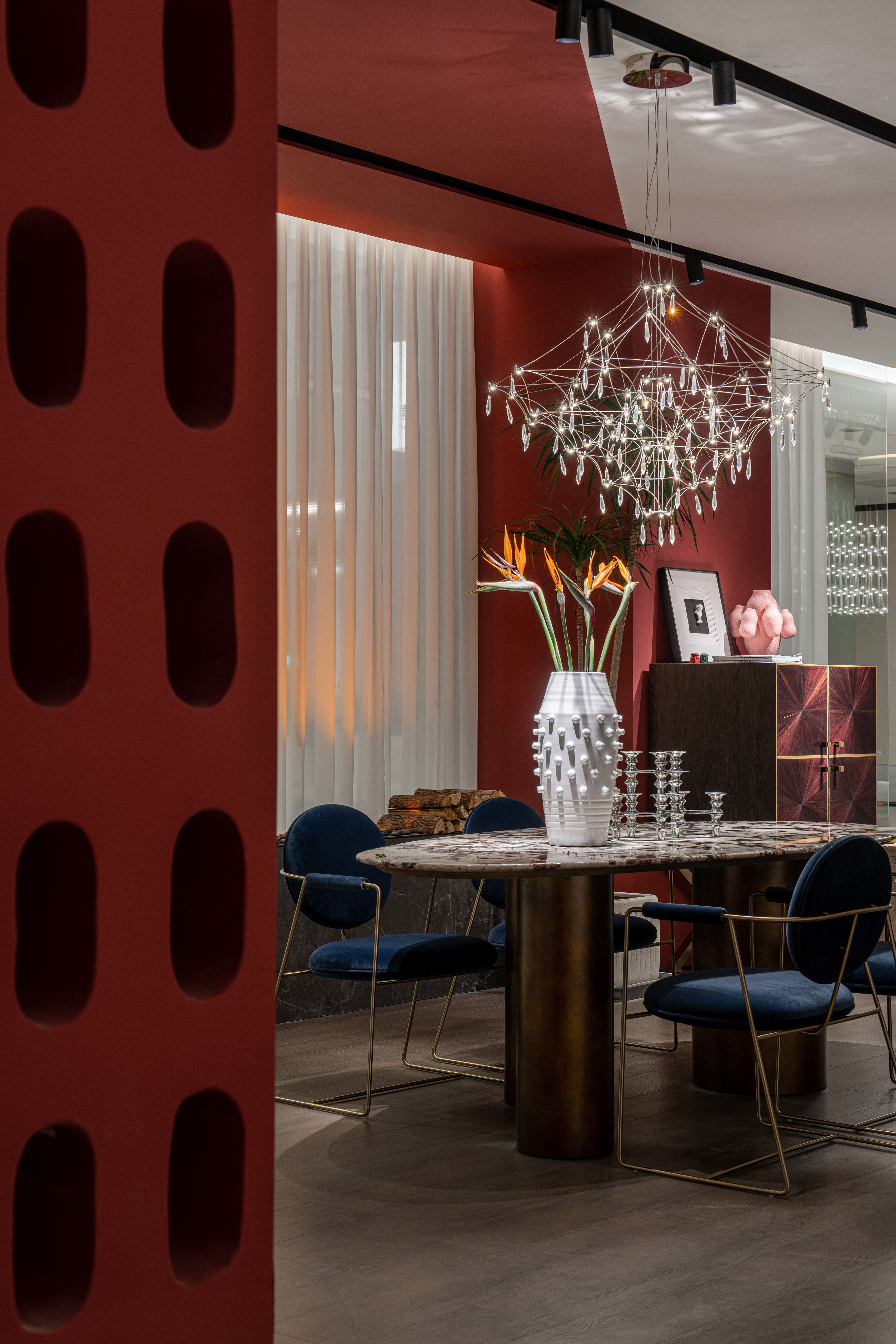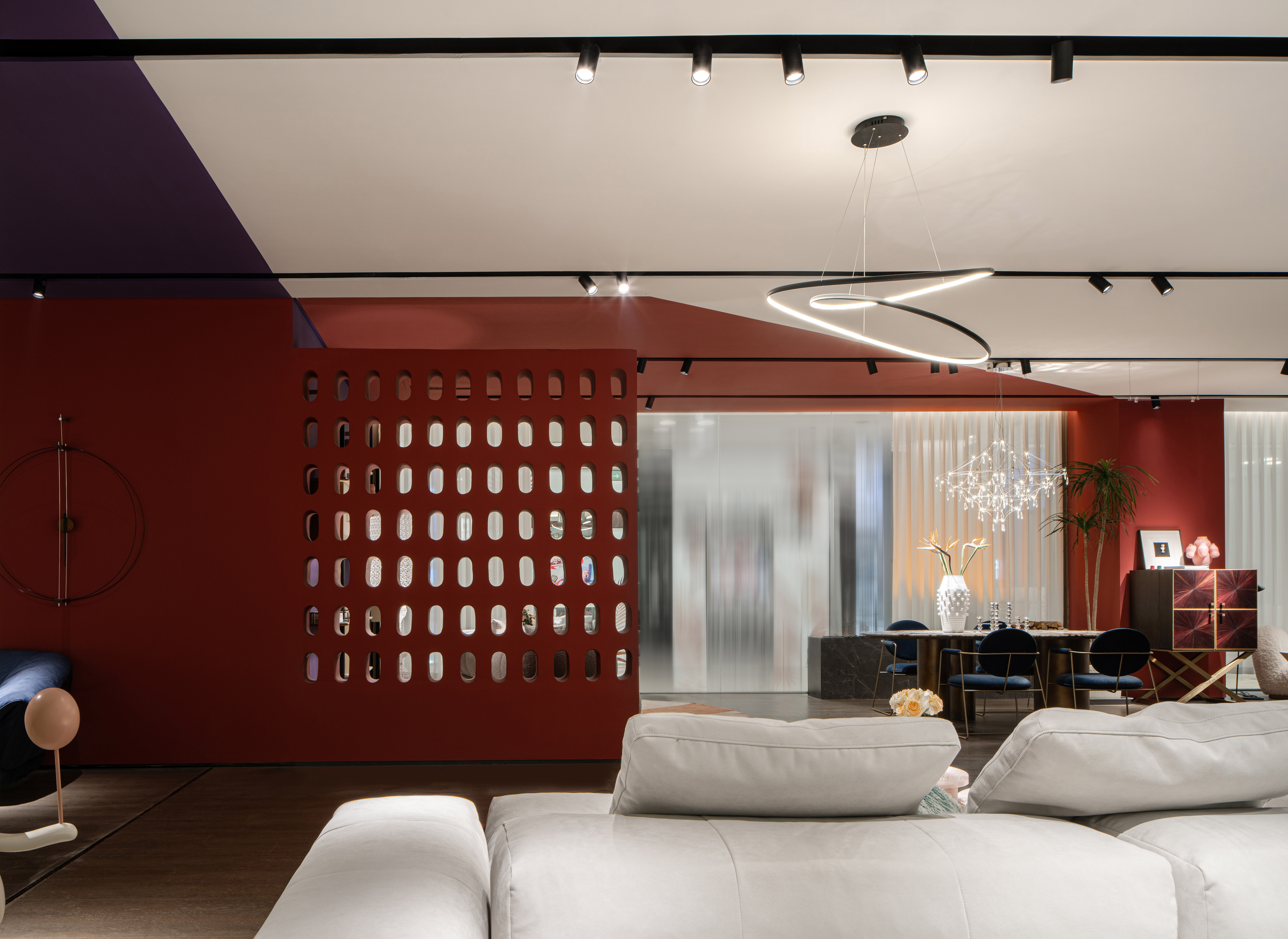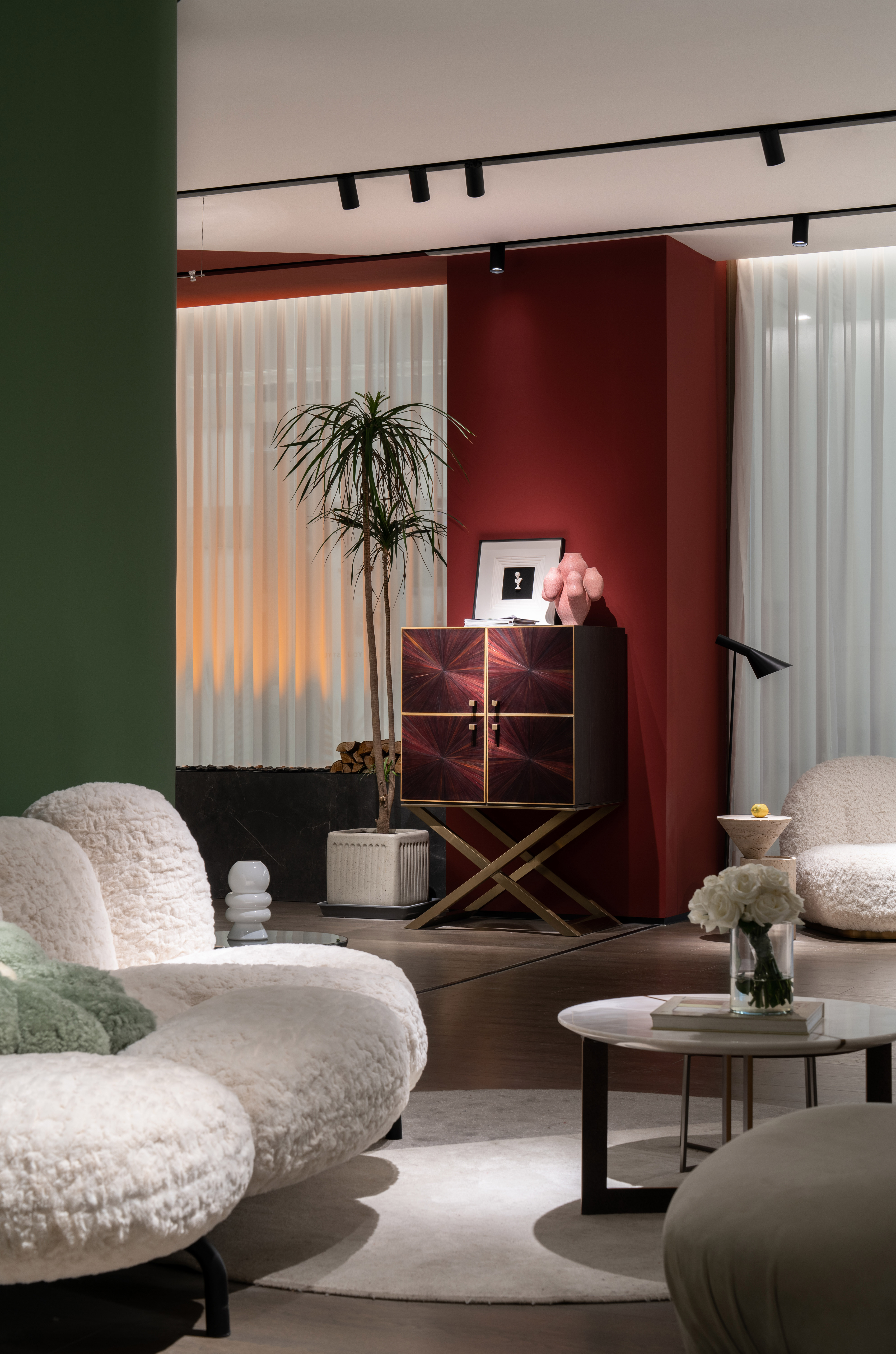 蘓芳韵律展示轻奢优雅精致的软装家居产品,浓烈的红色系,视觉冲击感强烈,更具有空间仪式感和庄重性,而且作为橱窗区域,也能更加引人注目。