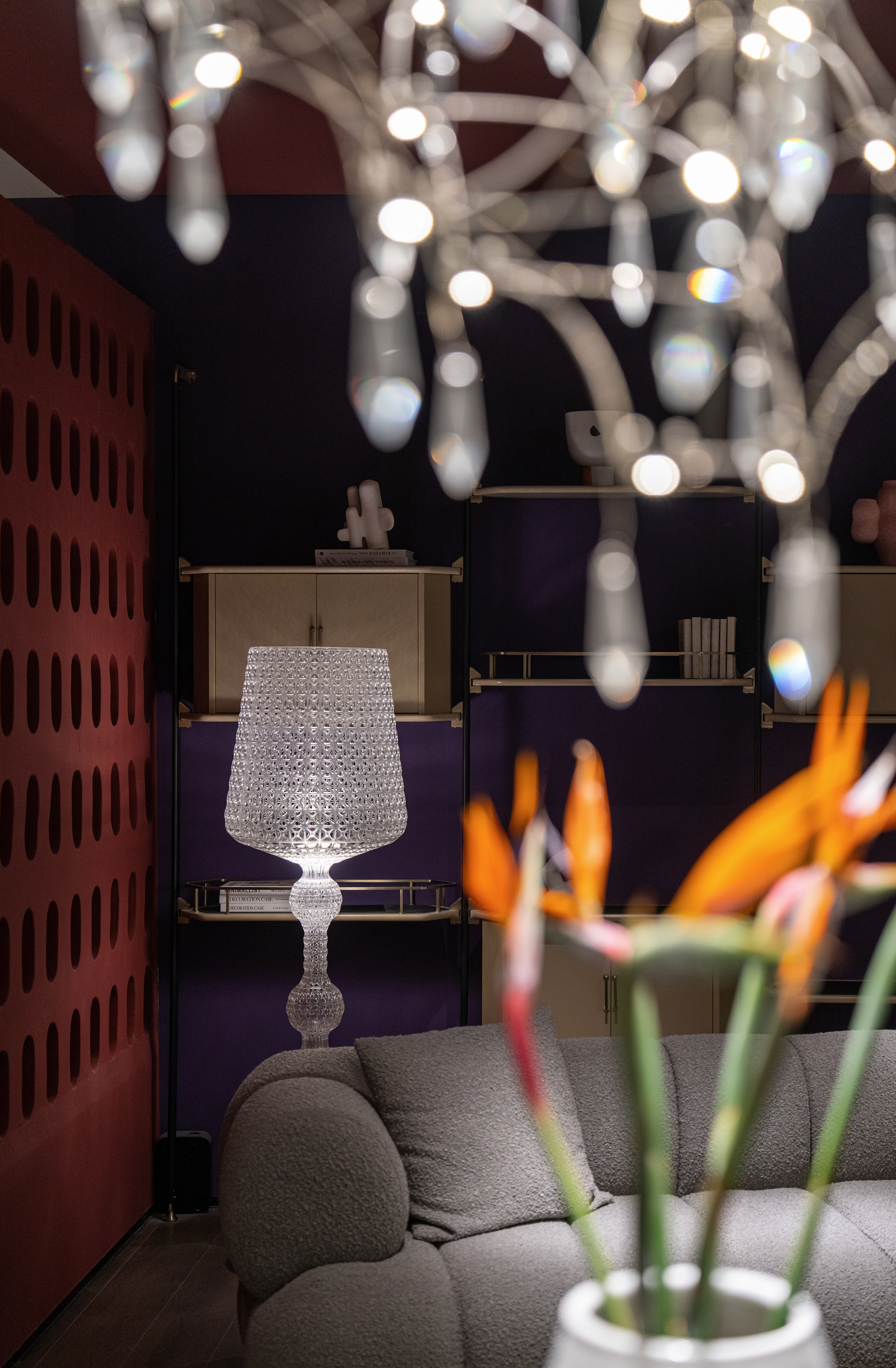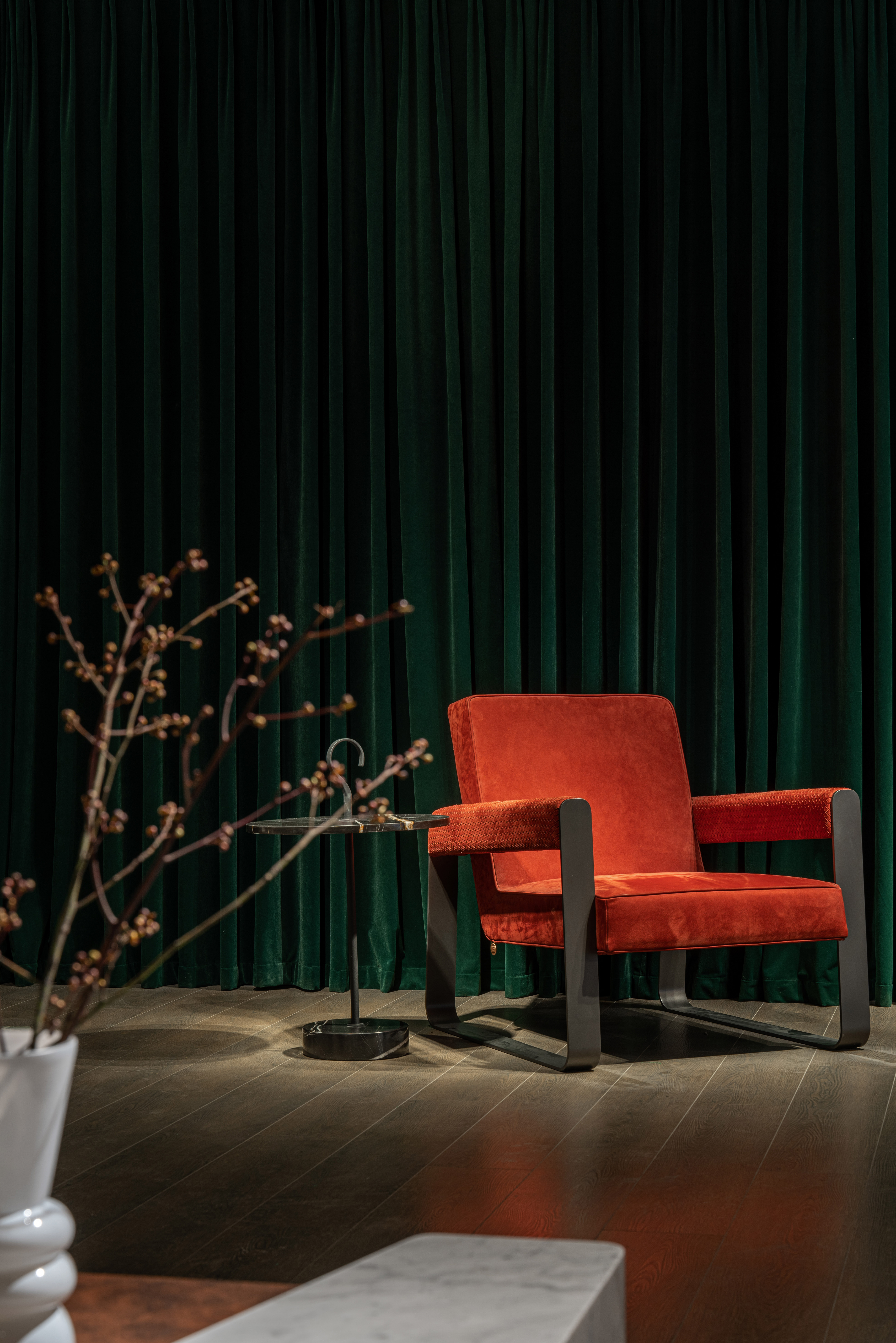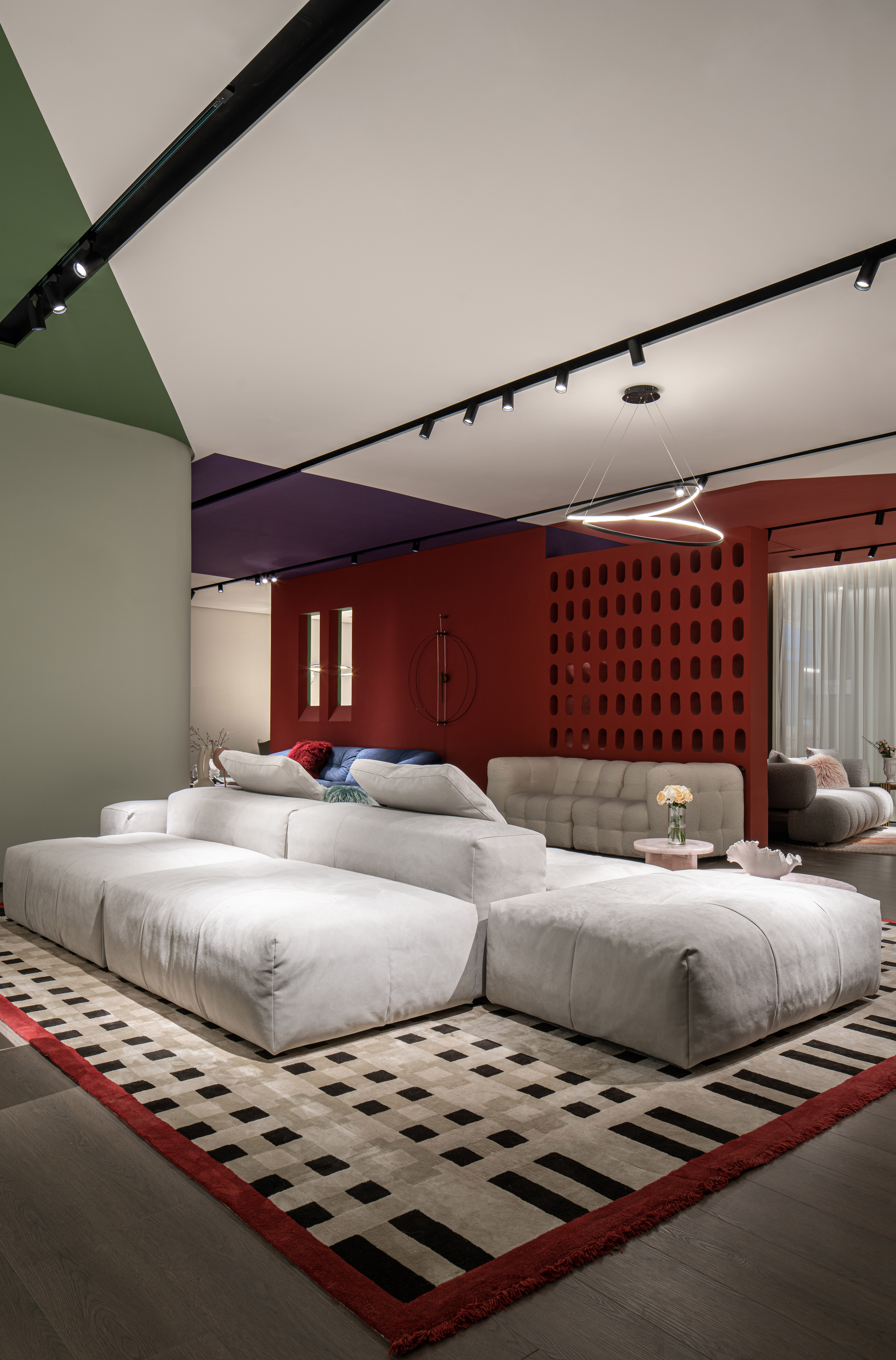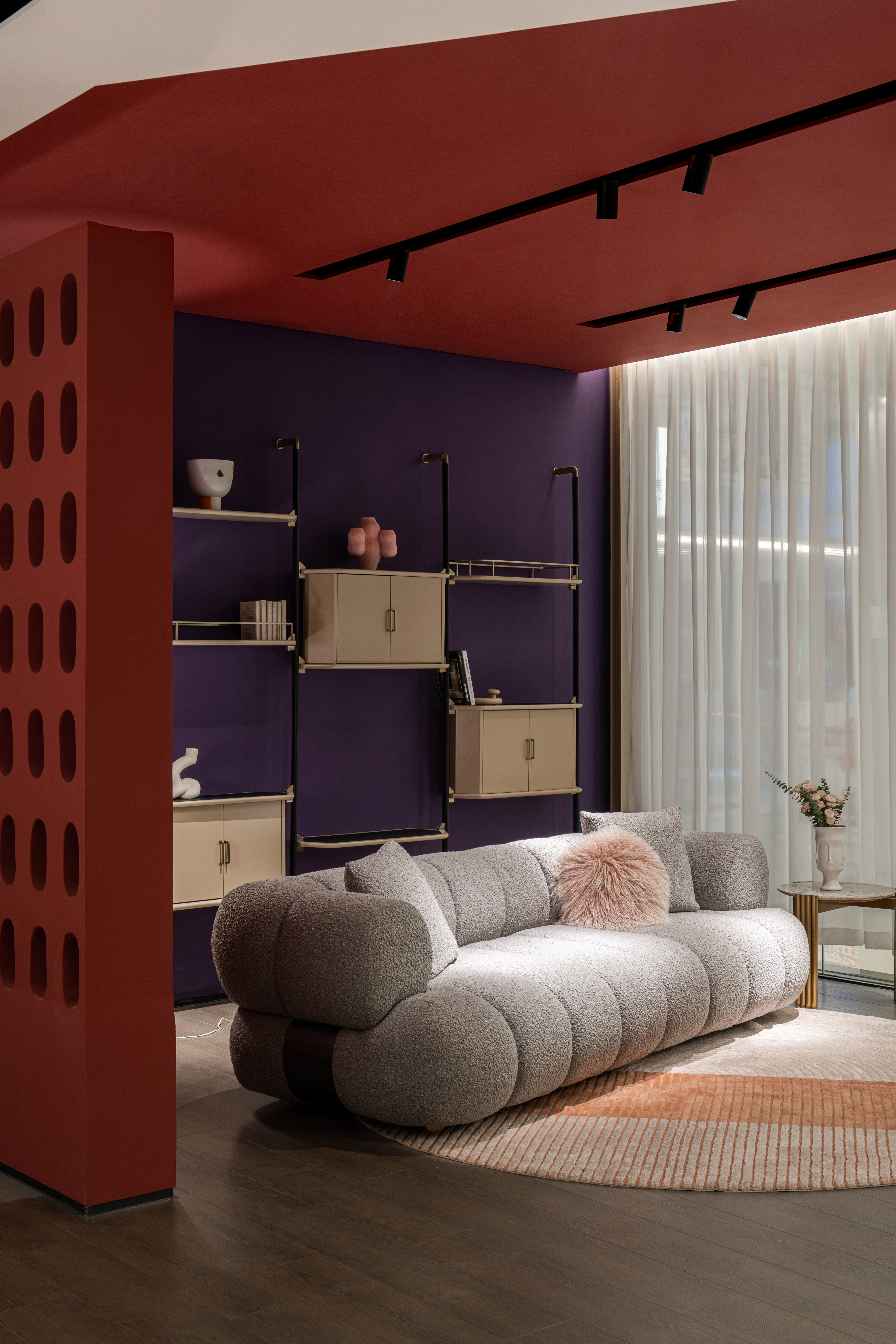 蘓芳韵律展示轻奢优雅精致的软装家居产品,浓烈的红色系,视觉冲击感强烈,更具有空间仪式感和庄重性,而且作为橱窗区域,也能更加引人注目。
