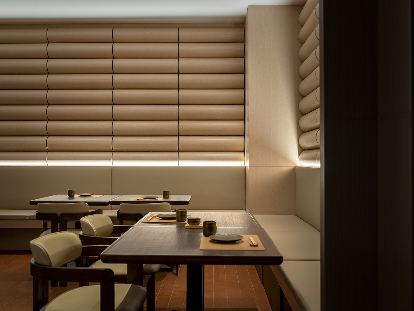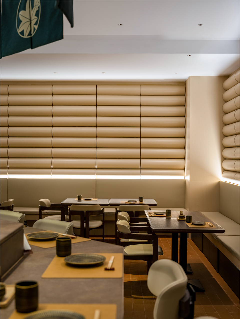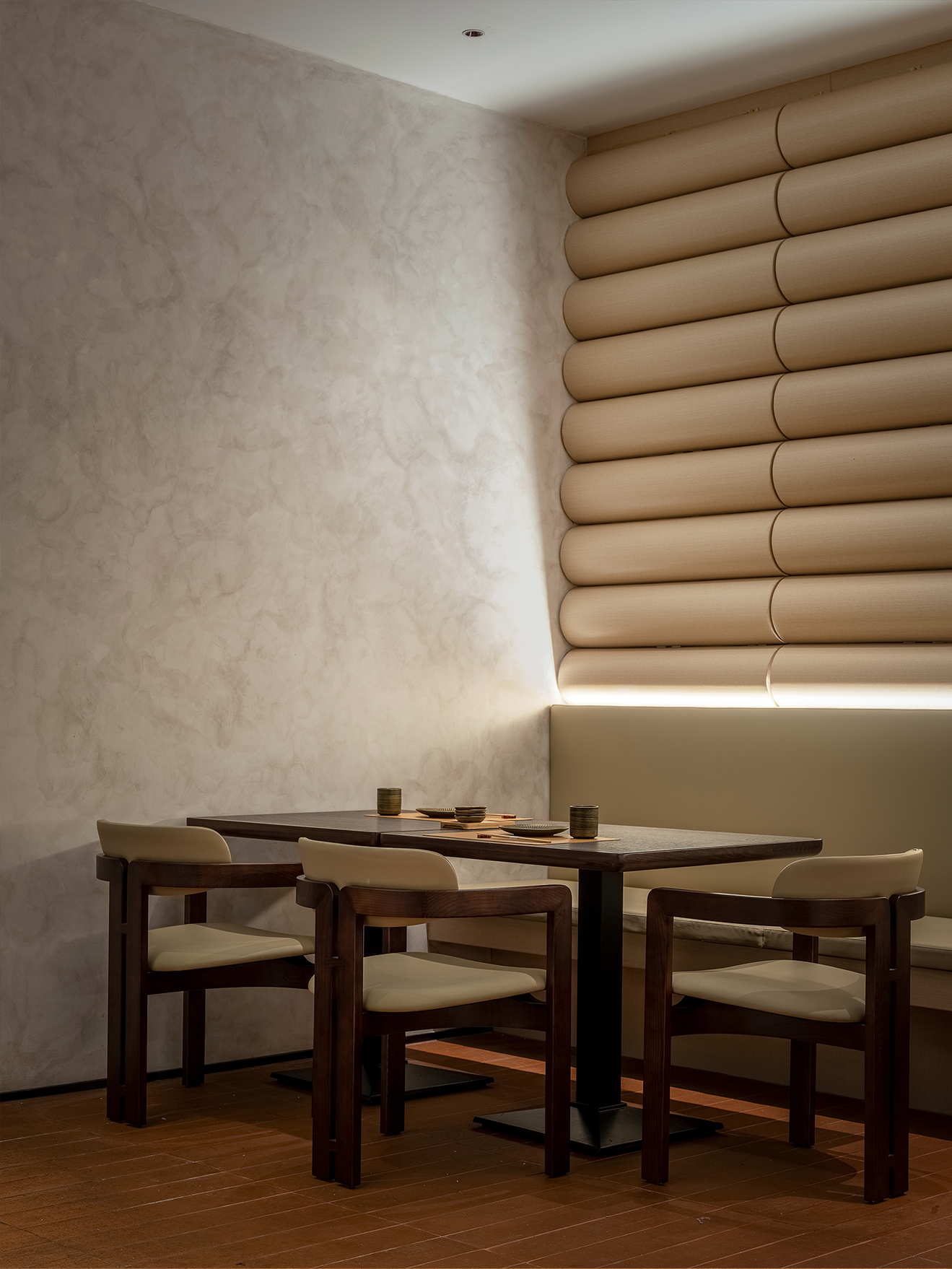 设计选材:材料运用了复古地砖,暖木饰面,米黄色艺术漆等的材料。为了突出整体氛围,通过中间的大寿司吧台,把空间以大吧台开始划分空间,借景透景,体现赏和玩的趣味氛围。选材部分除了希望带给客人愉悦感受外,最重要的考量是安全性,在硬件超过60%面积以上使用不燃或不帮助燃烧的材料,如石材、金属、砖类、特殊漆类.....等材料,降低木皮、壁布类等助燃材质的使用。