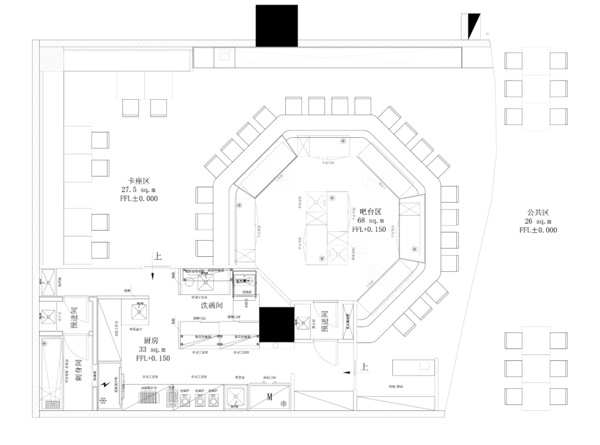 空间布局:空间以圆形吧台为中心分割客人行走的流线,在方寸之间,方中带圆,别有洞天。划分大吧台和卡座区域。