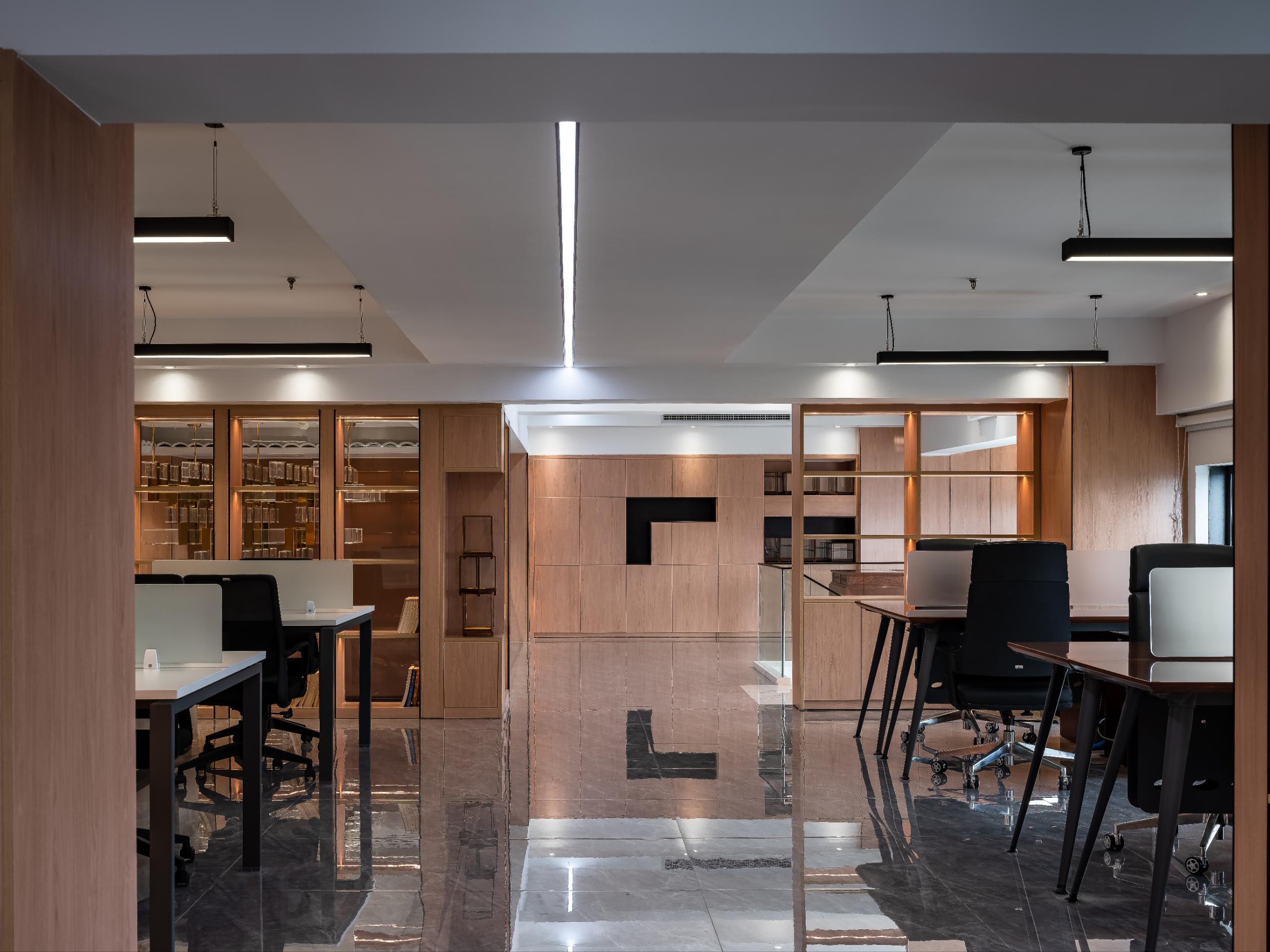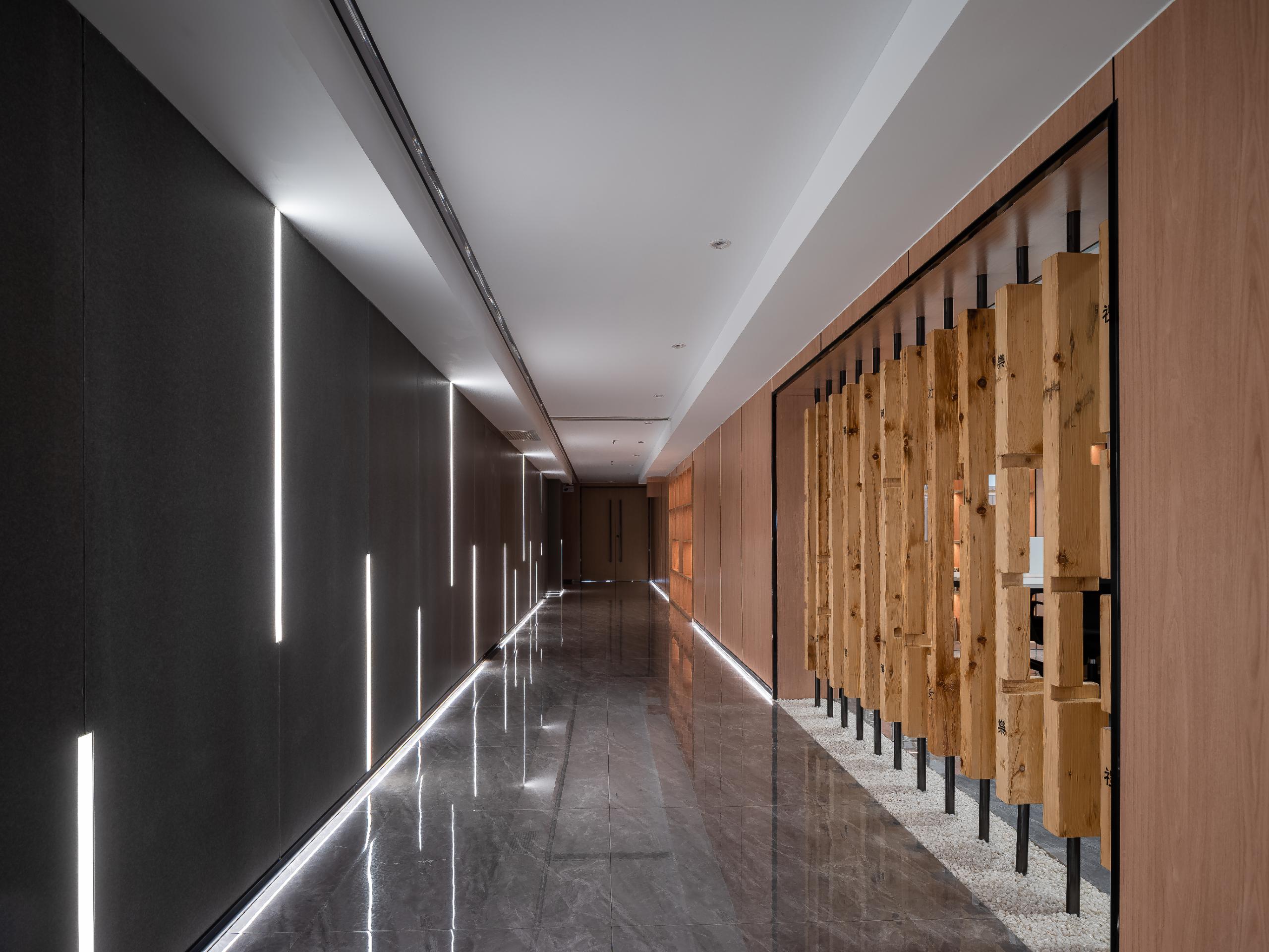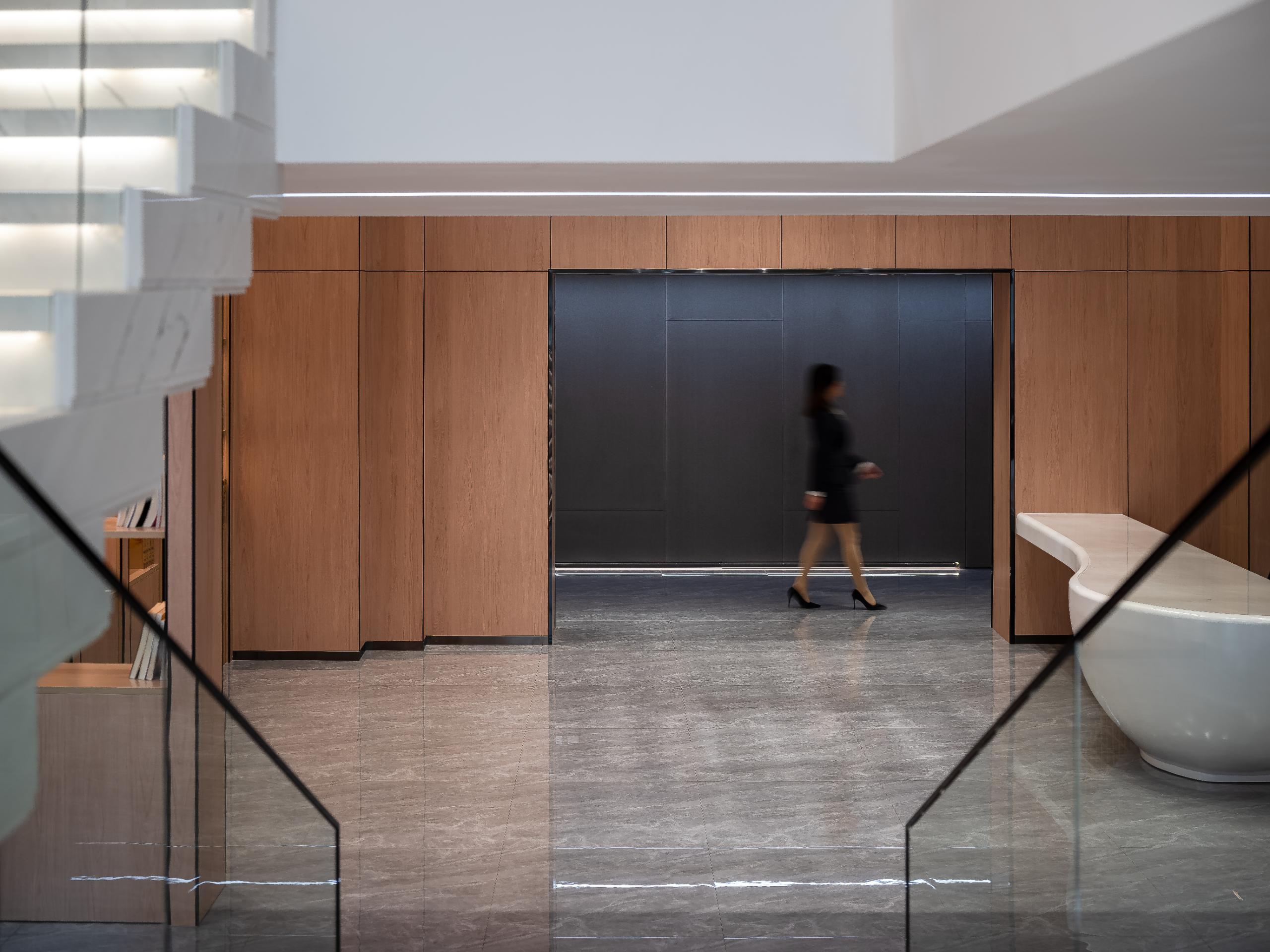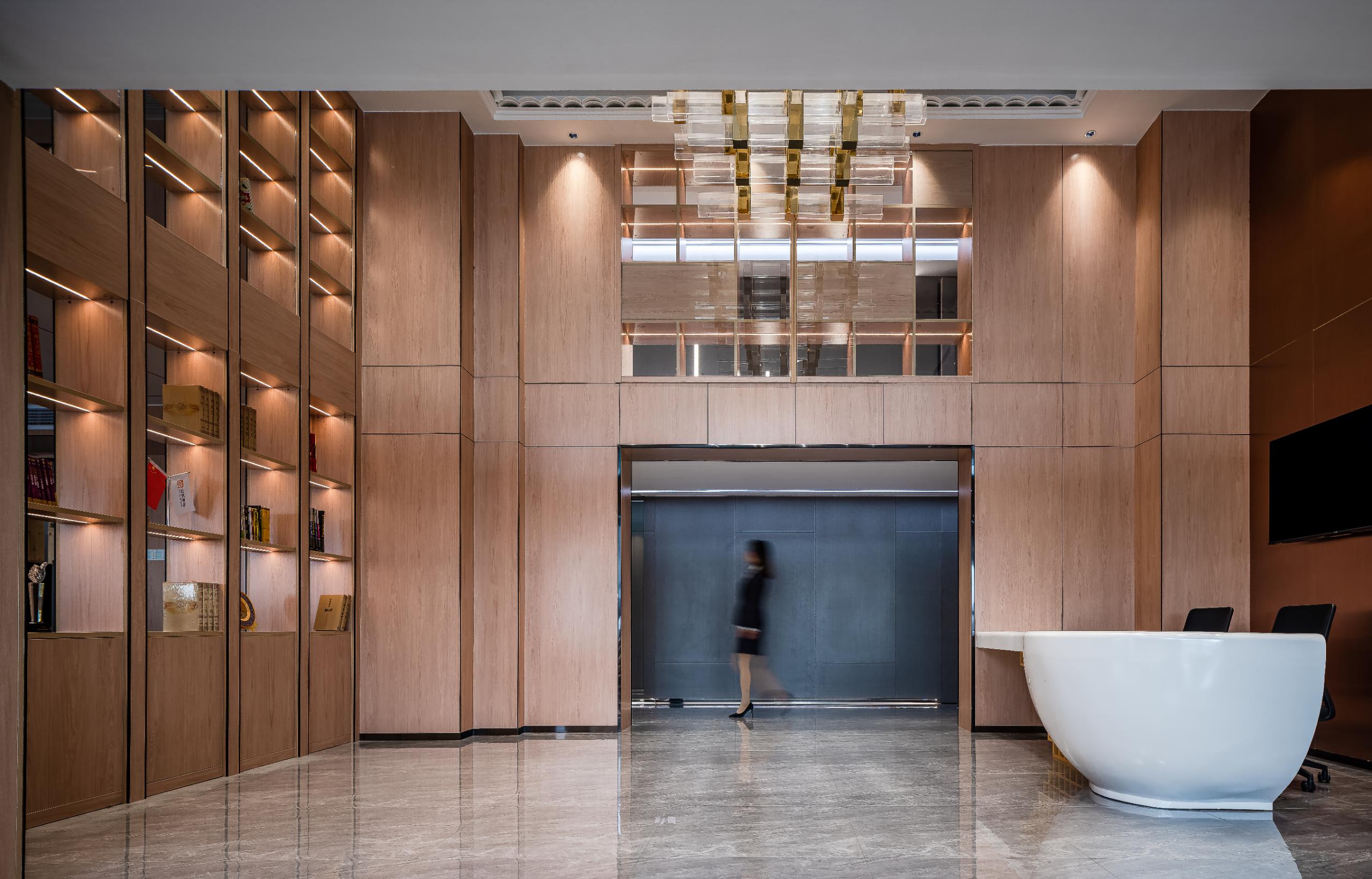大厅融合斗拱、四水归堂、瓦当为元素,挑高的设计,提高空间整体通透度,设计师通过有形的建筑传递无形的企业价值,塑造企业文化与工作场所之间的共振磁场。