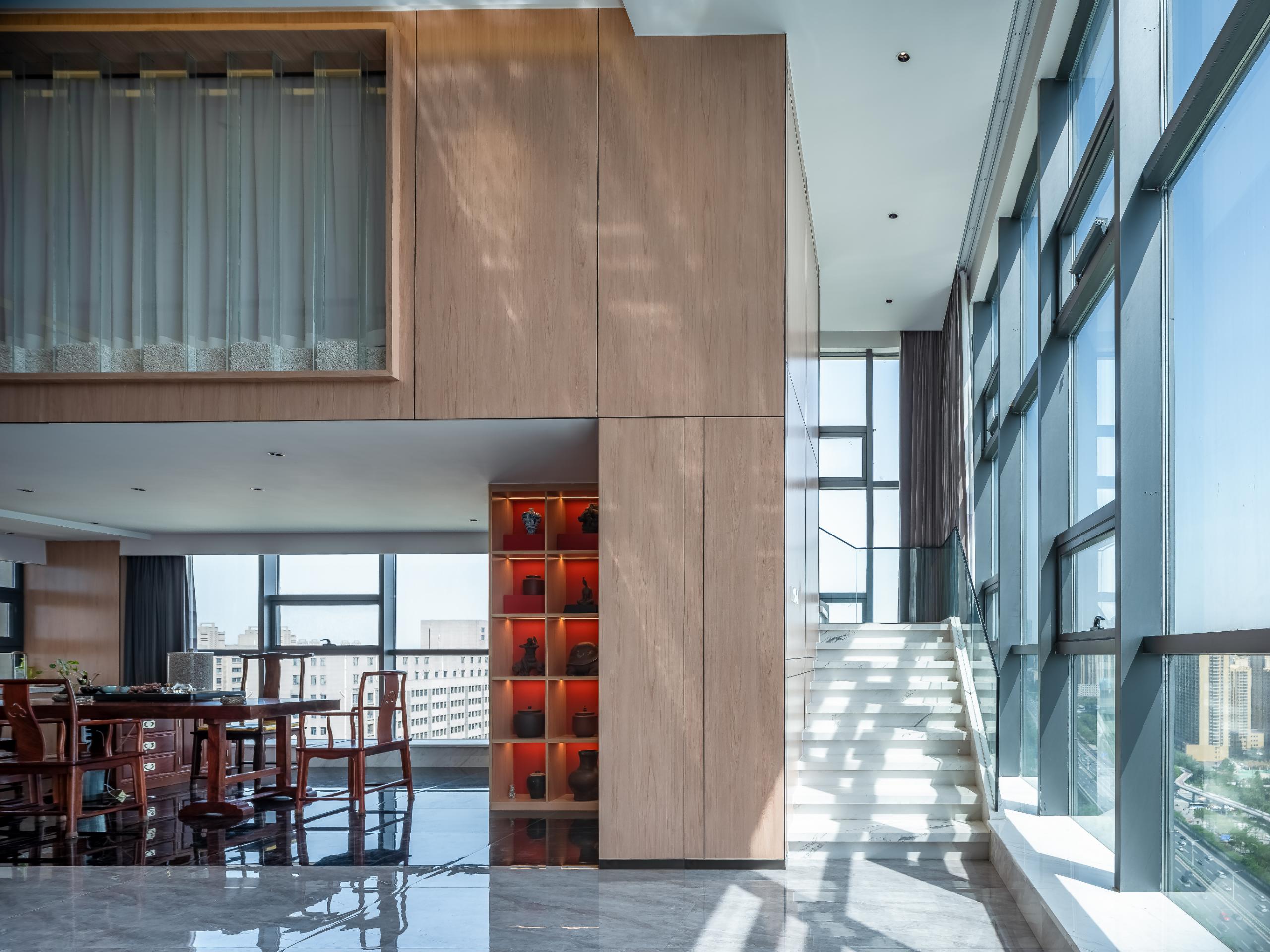 大面积分落地窗将窗外盛景引入室内,自然的气息在禅意的空间中流淌弥散,因光的作用投下规则阴影,一张一驰,内敛含蓄。